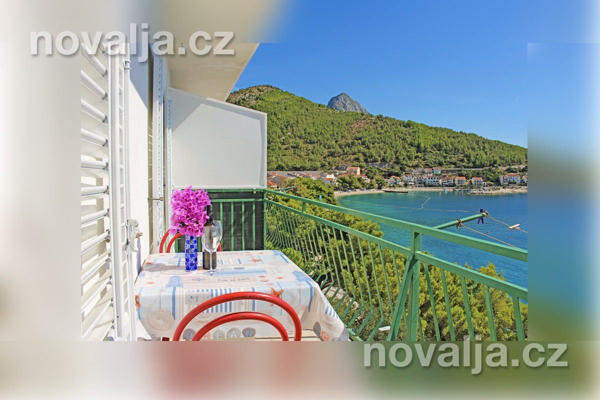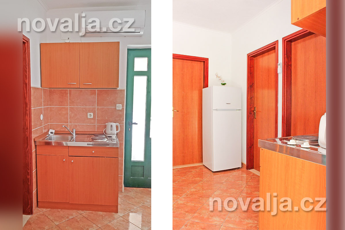 Štúdio (jedna miestnosť) s tromi lôžkami, vybavený kuchynský kút (chladnička, rýchlovarvarná kanvica), sociálne zariadenie so sprchovacím kútom a WC, terasa s bočným výhľadom na more (je však spoločná aj pre apartmán A4). Klimatizácia v cene.