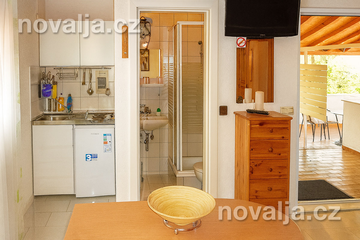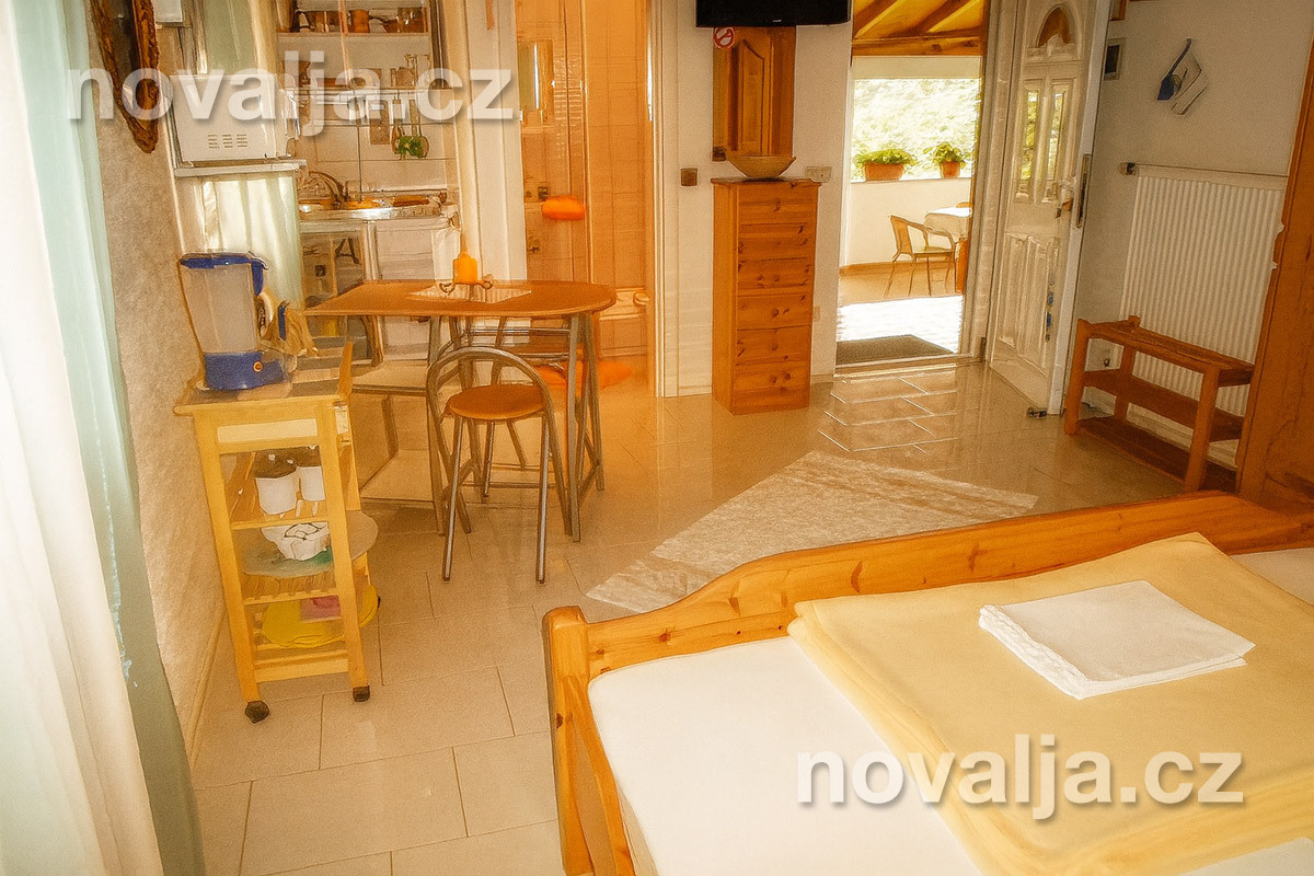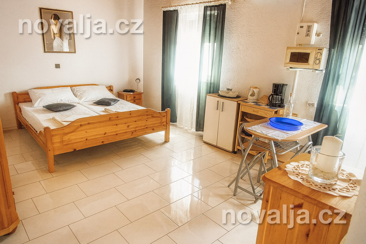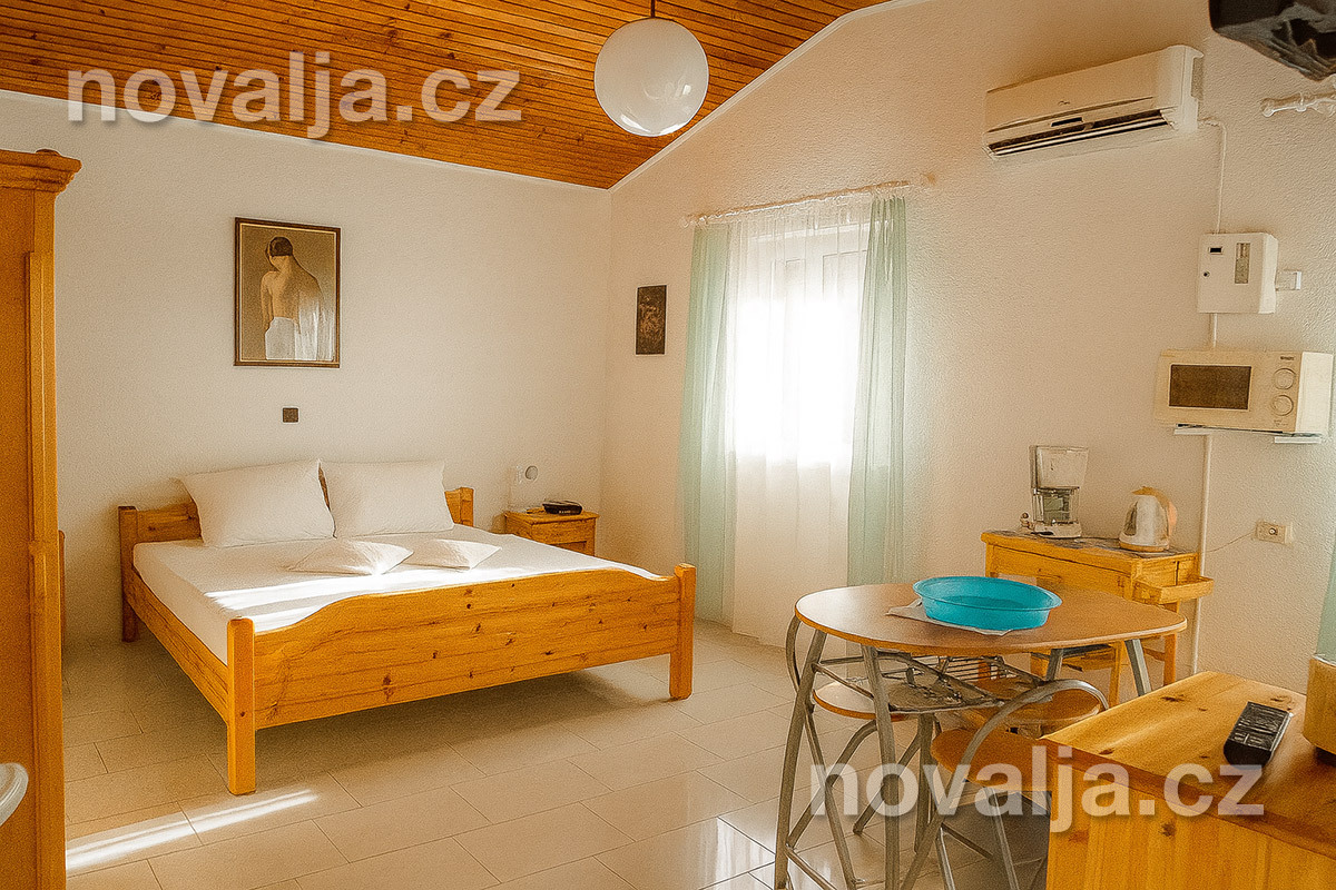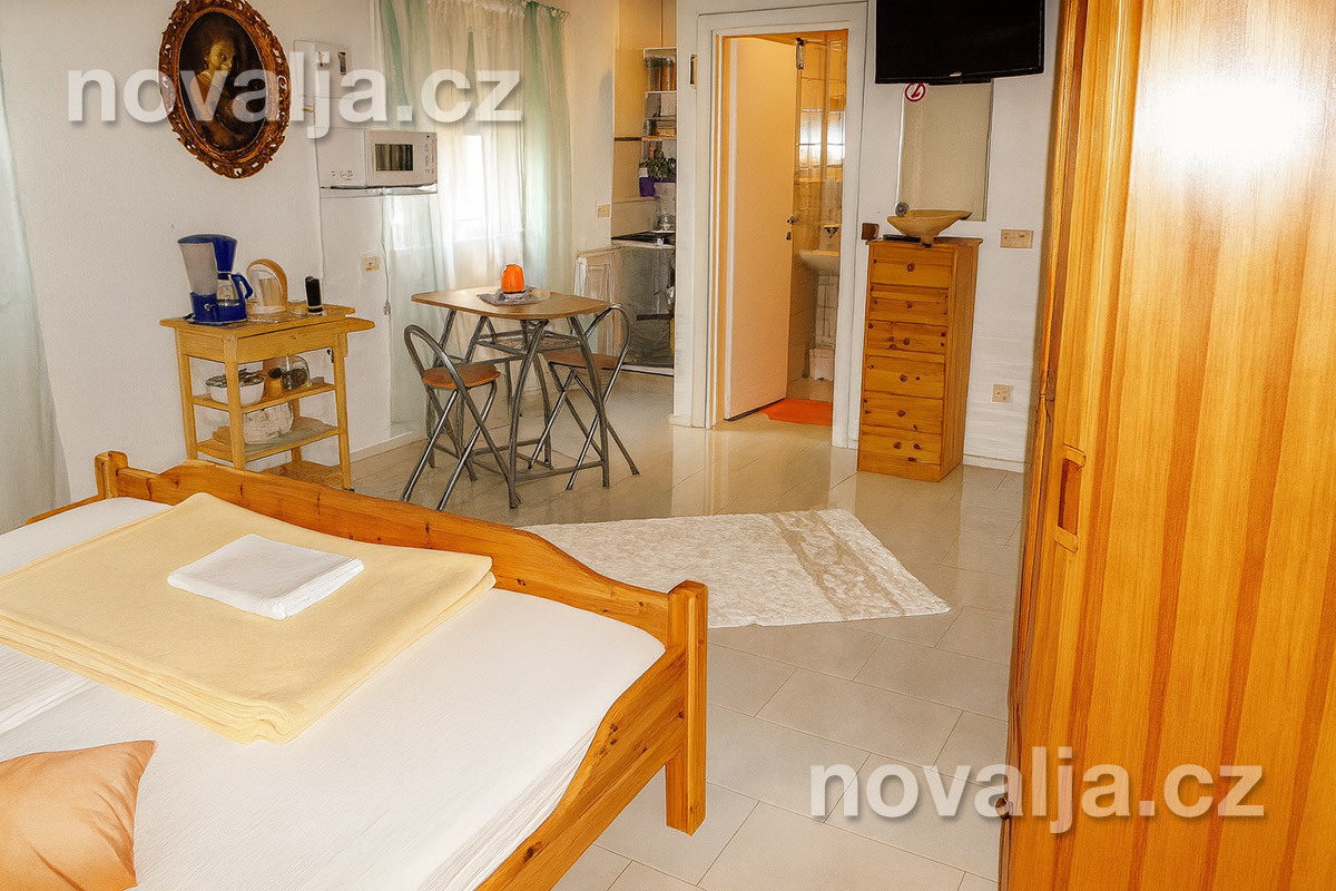 Štúdio (jedna miestnosť) s dvomi lôžkami a vybaveným kuchynským kútom (chladnička, mikrovlnná rúra, varná kanvica, kávovar, toaster), TV+SAT, sejf, sociálne zariadenie so sprchovacím kútom a WC, fén, terasa (nie je vo vnútri štúdia). Klimatizácia za poplatok 5 €/deň. Rozloha 24 m² + 12 m² terasa.