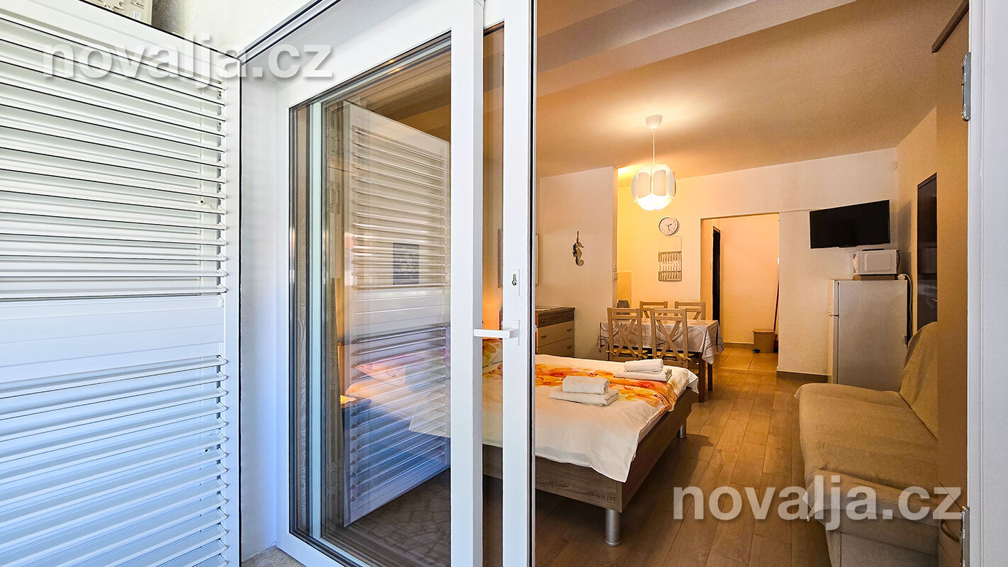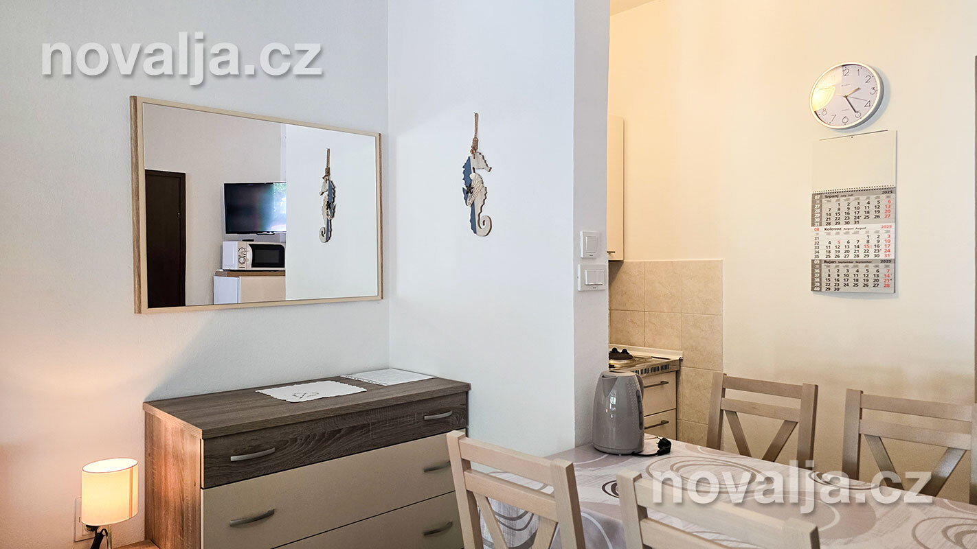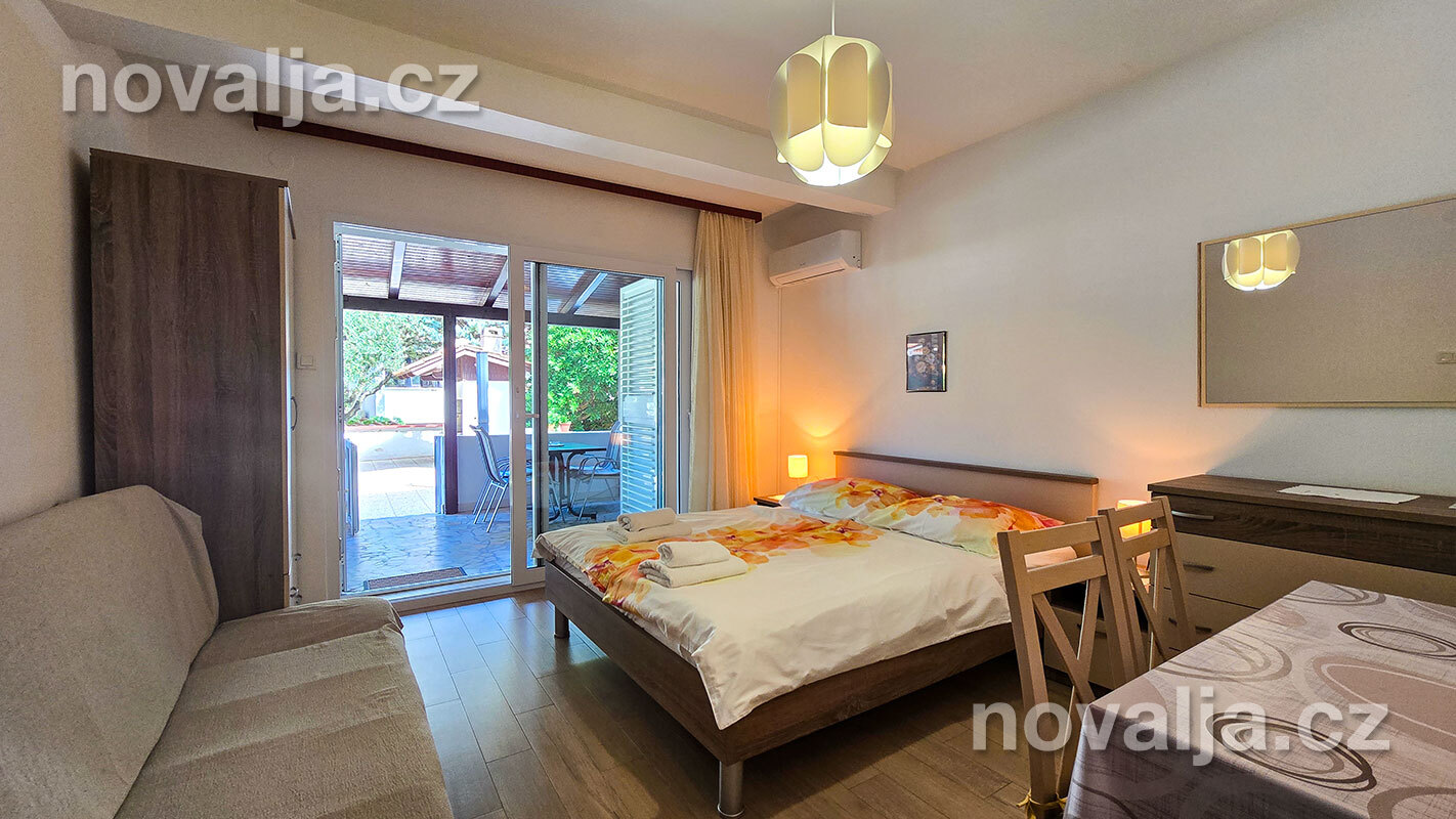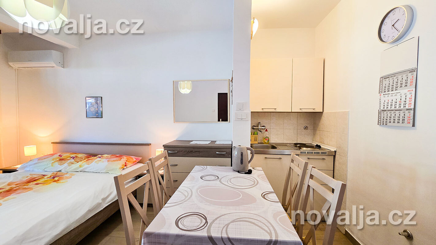 Štúdio (jedna miestnosť) s dvoma lôžkami a rozkladacím gaučom pre 1 osobu, vybavený kuchynský kút (chladnička, mraznička, mikrovlnná rúra, varná kanvica, kávovar, toaster), LCD TV+SAT, sociálne zariadenie so sprchovacím kútom a WC, fén, terasa. Klimatizácia za príplatok 5 €/deň (hradí sa na mieste).