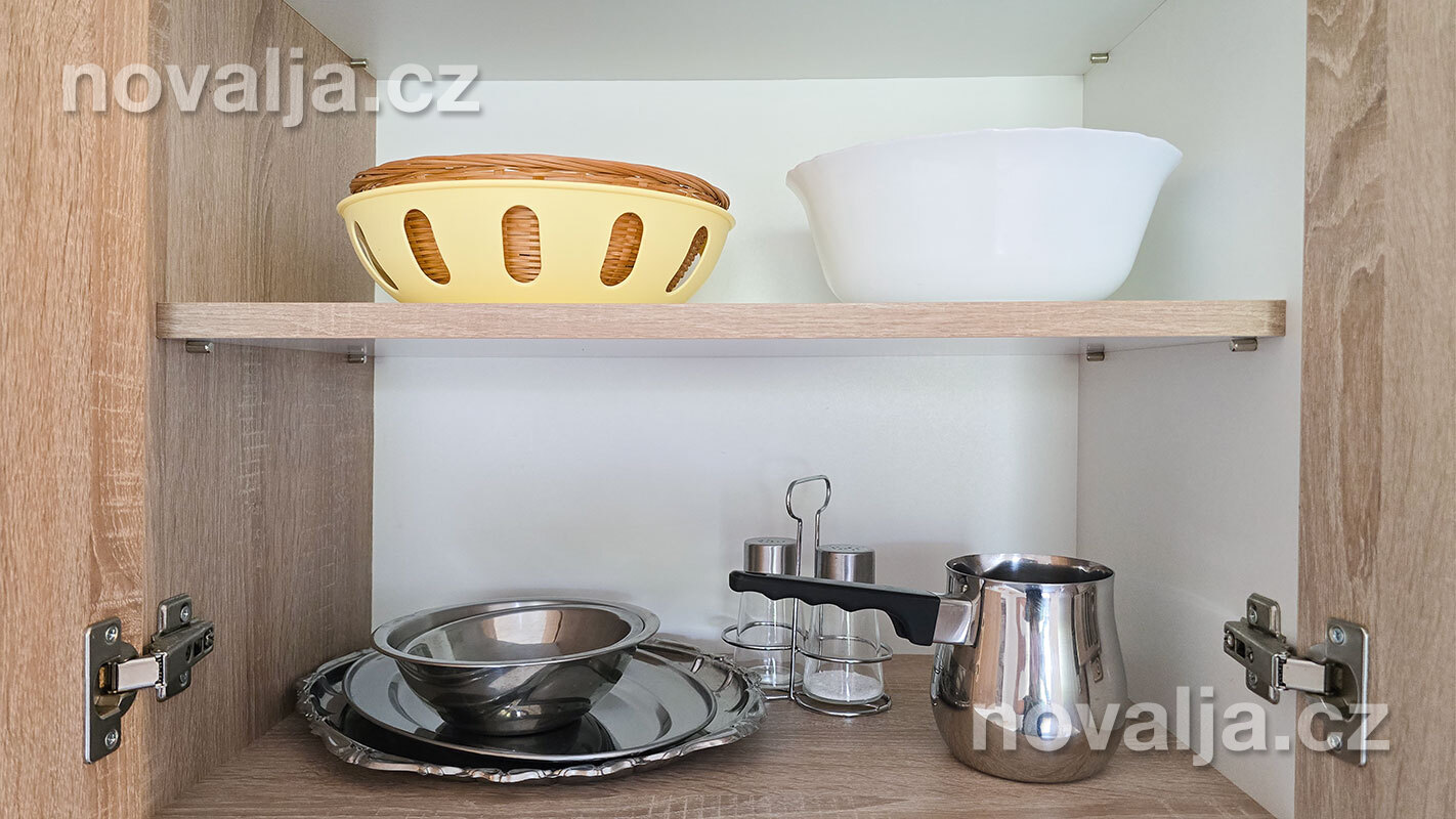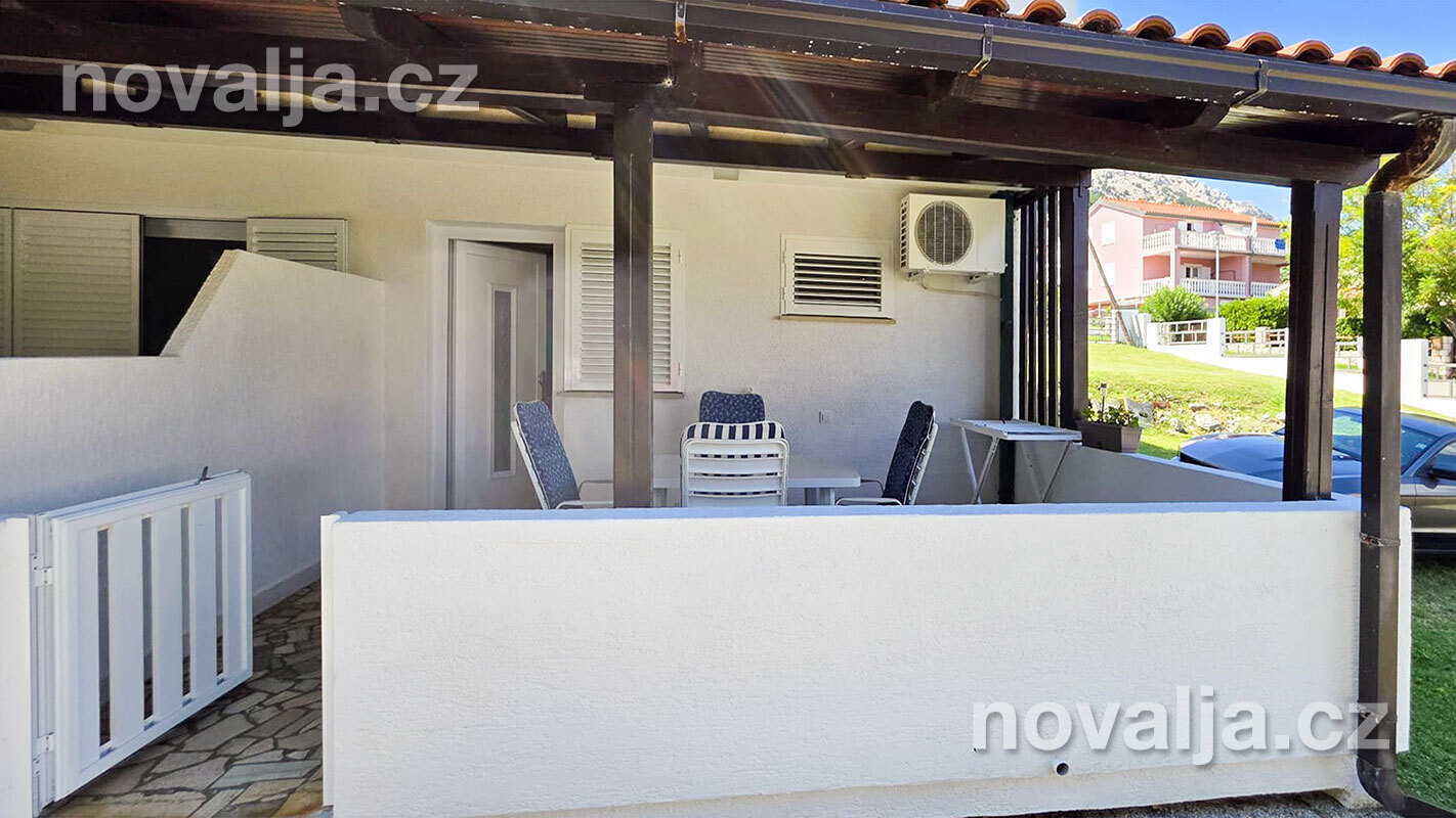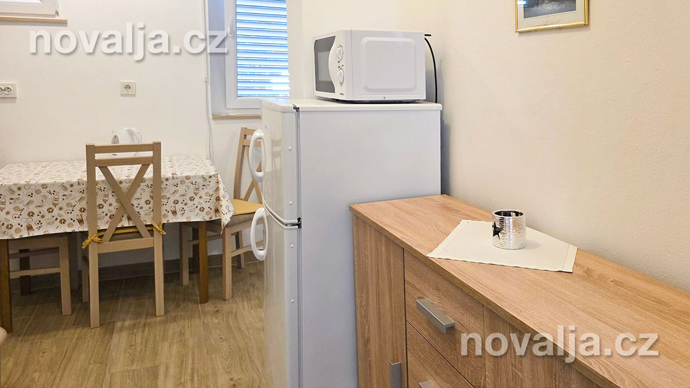1 spálňa s tromi lôžkami, vybavená kuchynka (chladnička, mraznička, mikrovlnná rúra, varná kanvica, kávovar, toaster), LCD TV+SAT, sociálne zariadenie so sprchovacím kútom a WC, fén, terasa. Klimatizácia v kuchyni za príplatok 5 €/deň (hradí sa na mieste).