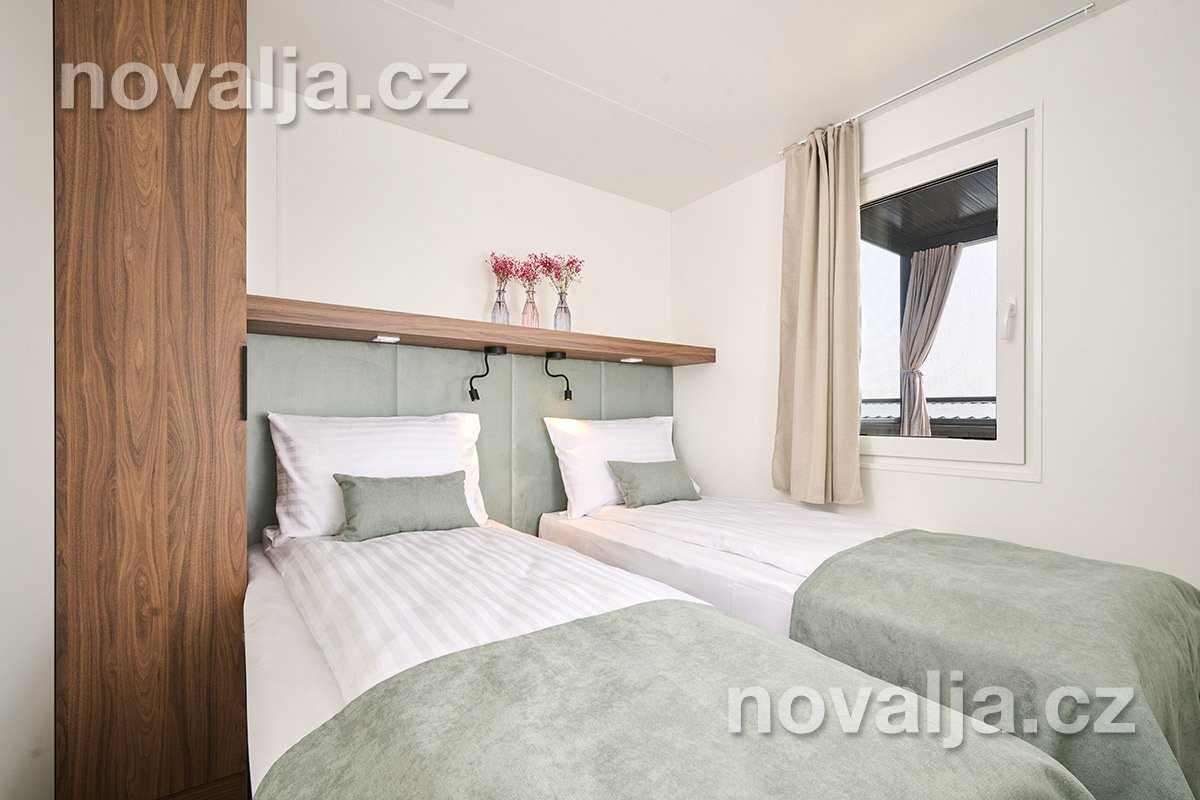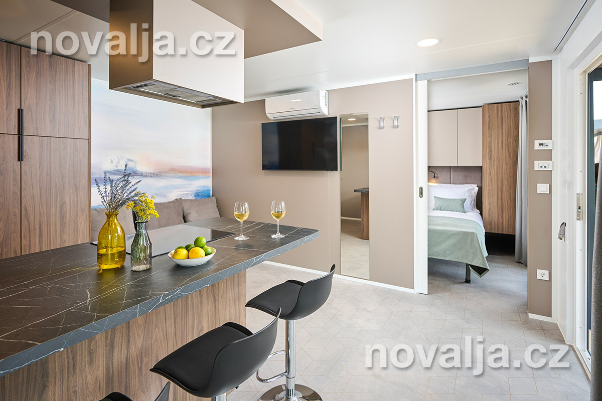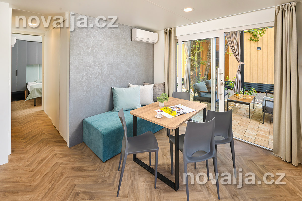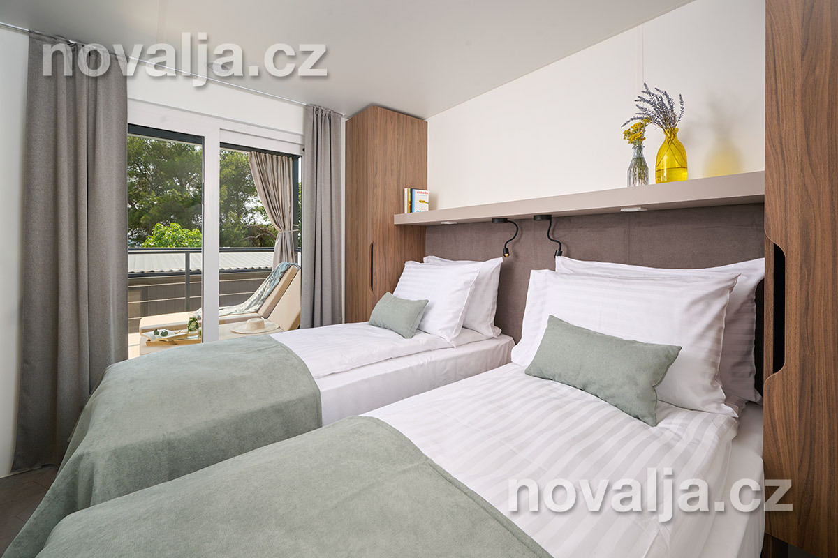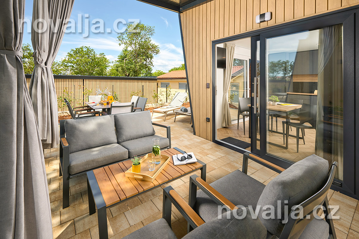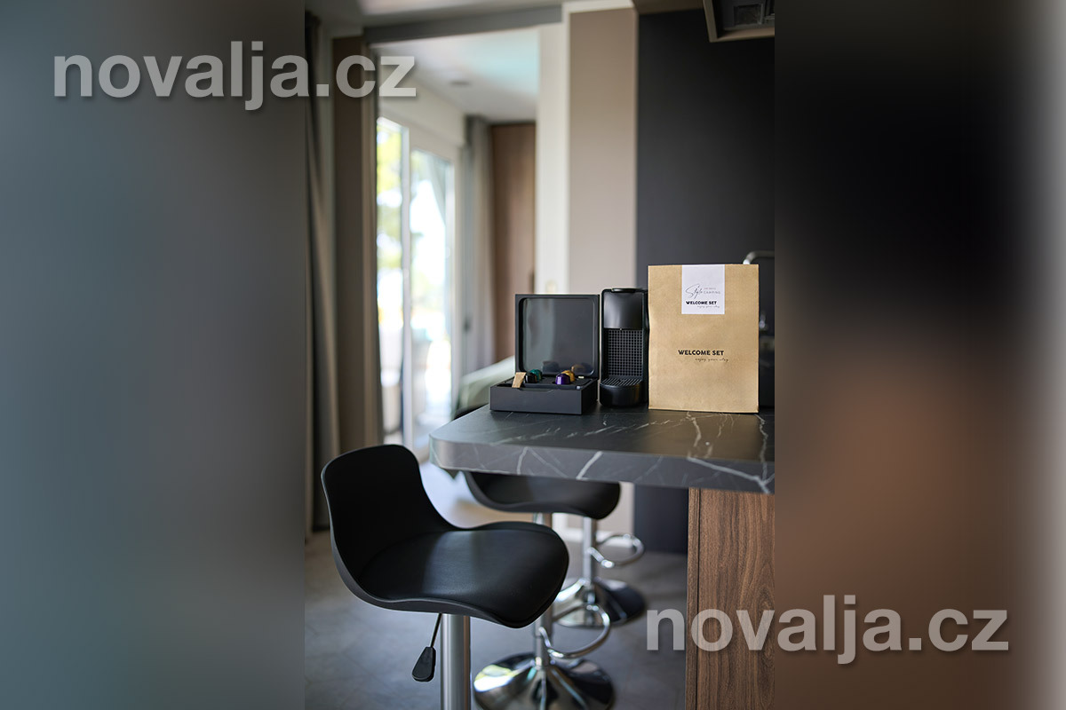 2 spálne s dvoma lôžkami (1x manželská posteľ a 2x samostatné lôžko), vybavená kuchyňa (chladnička, mraznička, umývačka, mikrovlnná rúra, varná kanvica, kávovar na filtrovanú kávu aj Nesspresso) s obývacím priestorom s rozkladacím gaučom pre 1 osobu, TV+SAT, trezor, 2x kúpeľňa so sprchovacím kútom a WC, fén, terasa so záhradným nábytkom a dvoma lehátkami. Klimatizácia v kuchyni (v cene).