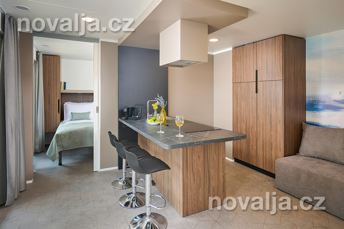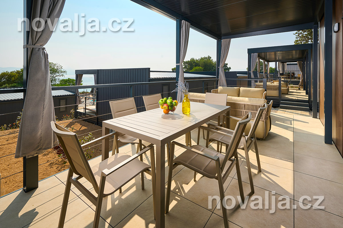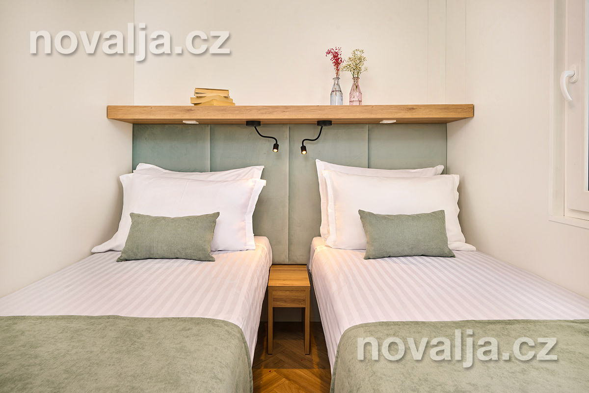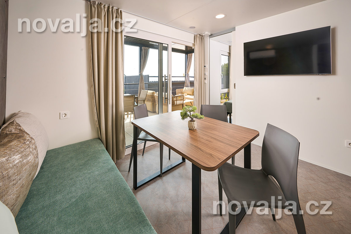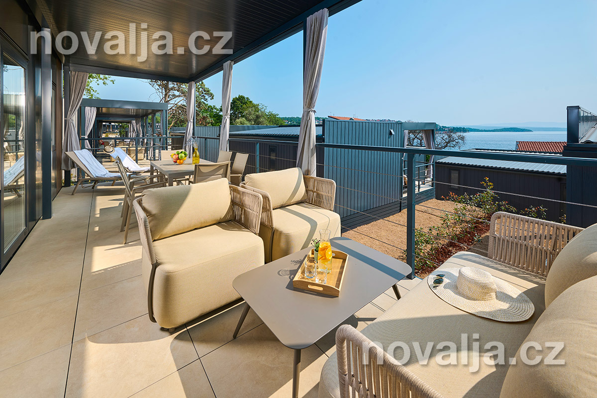 2 spálne s dvoma lôžkami (1x manželská posteľ a 2x samostatné lôžko), vybavená kuchyňa (chladnička, mraznička, umývačka, mikrovlnná rúra, varná kanvica, kávovar na filtrovanú kávu aj Nesspresso) s obývacím priestorom s rozkladacím gaučom pre 1 osobu, TV+SAT, trezor, 2x kúpeľňa so sprchovacím kútom a WC, fén, terasa so záhradným nábytkom a dvoma lehátkami. Klimatizácia v kuchyni (v cene).