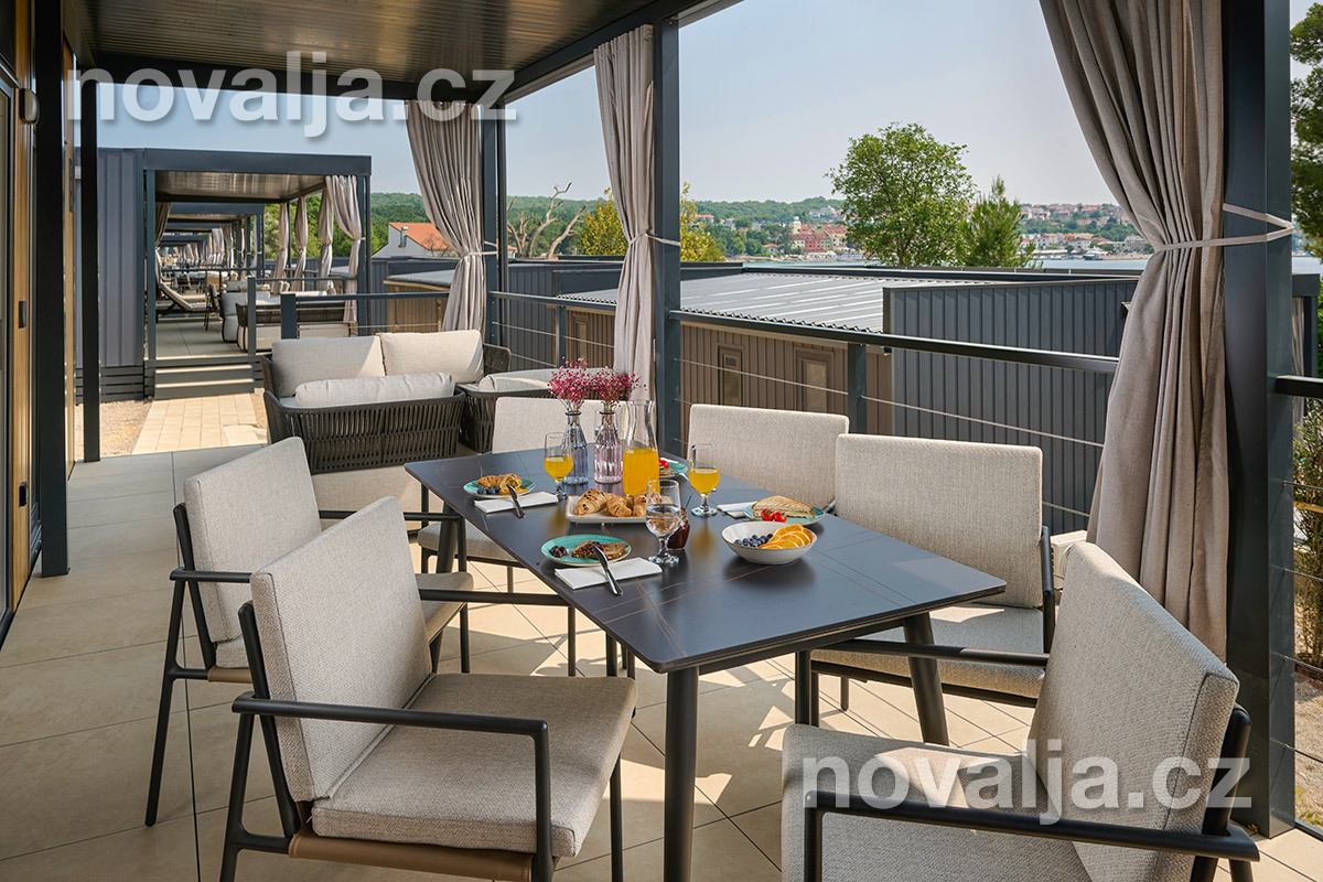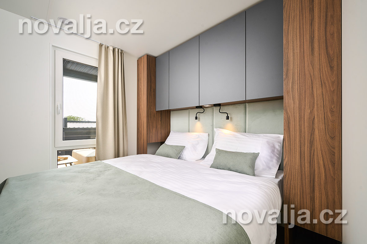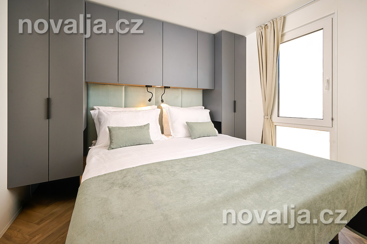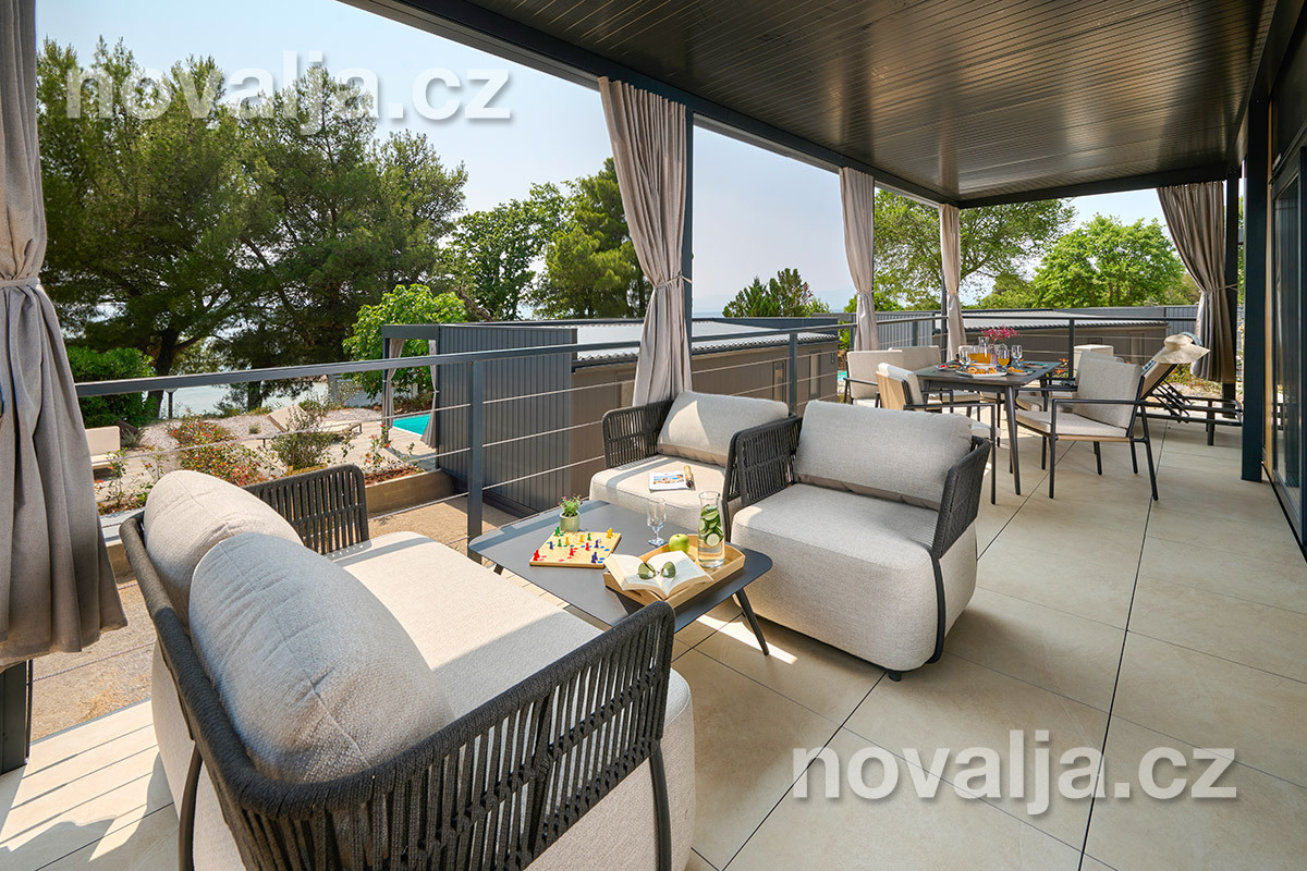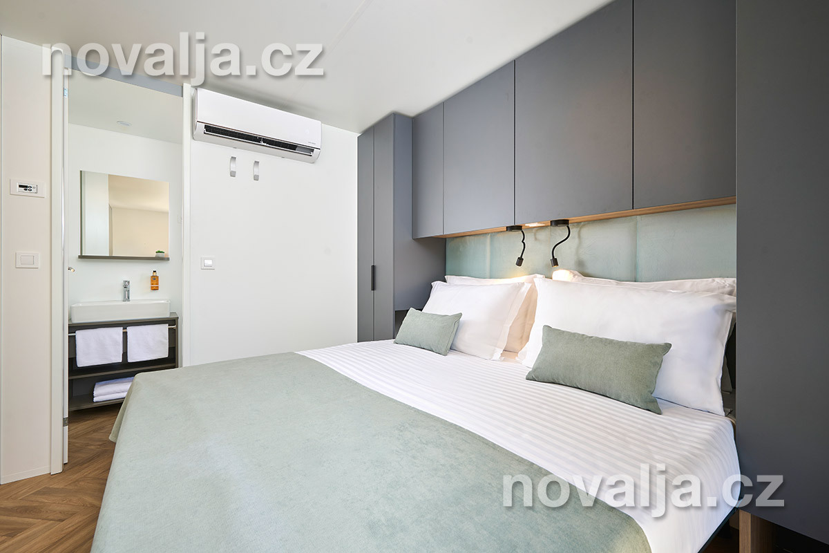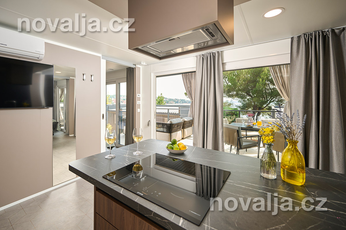 2 spálne s dvoma lôžkami (1x manželská posteľ a 2x samostatné lôžko), vybavená kuchyňa (chladnička, mraznička, umývačka, mikrovlnná rúra, varná kanvica, kávovar na filtrovanú kávu aj Nesspresso) s obývacím priestorom s rozkladacím gaučom pre 1 osobu, TV+SAT, trezor, 2x kúpeľňa so sprchovacím kútom a WC, fén, terasa so záhradným nábytkom a dvoma lehátkami. Klimatizácia v kuchyni (v cene).