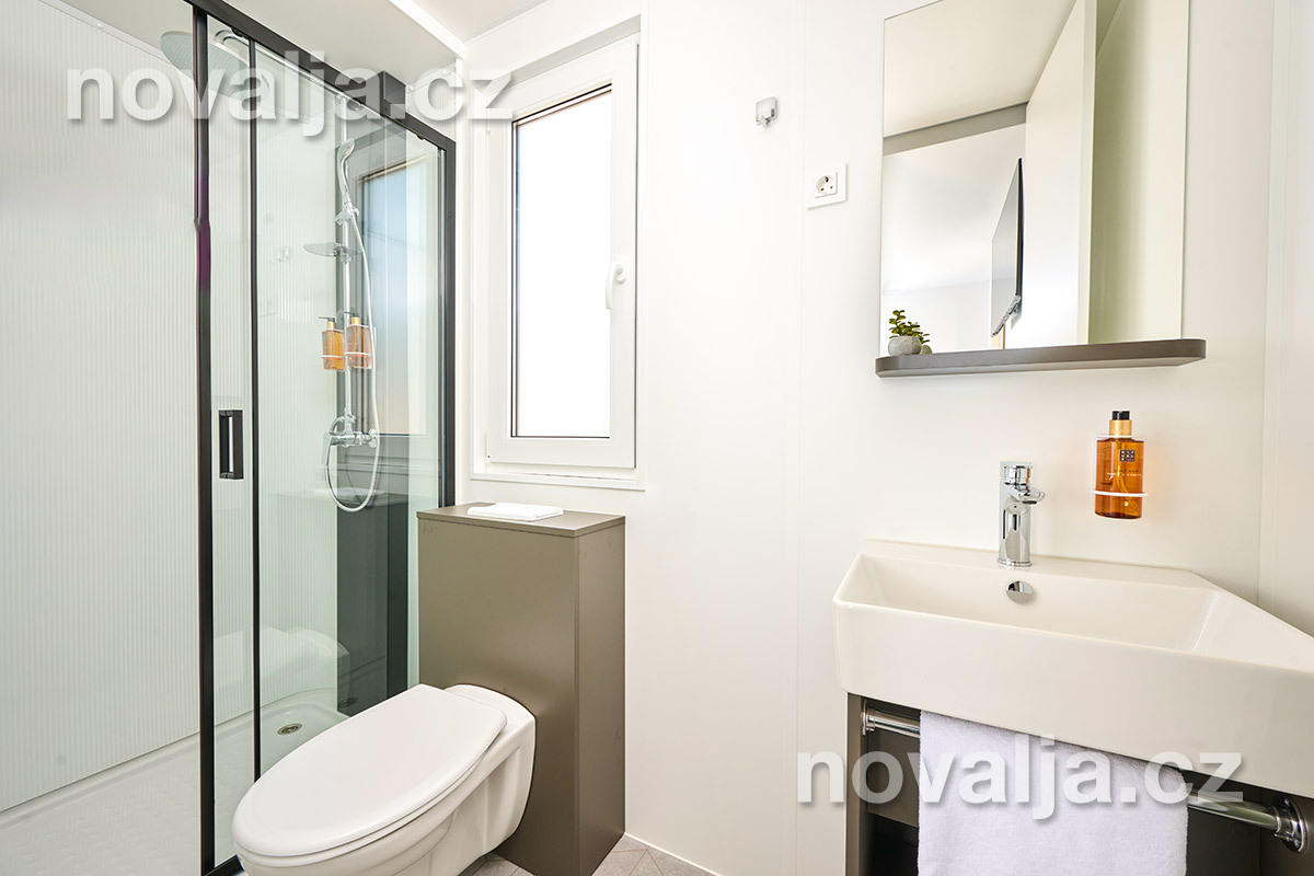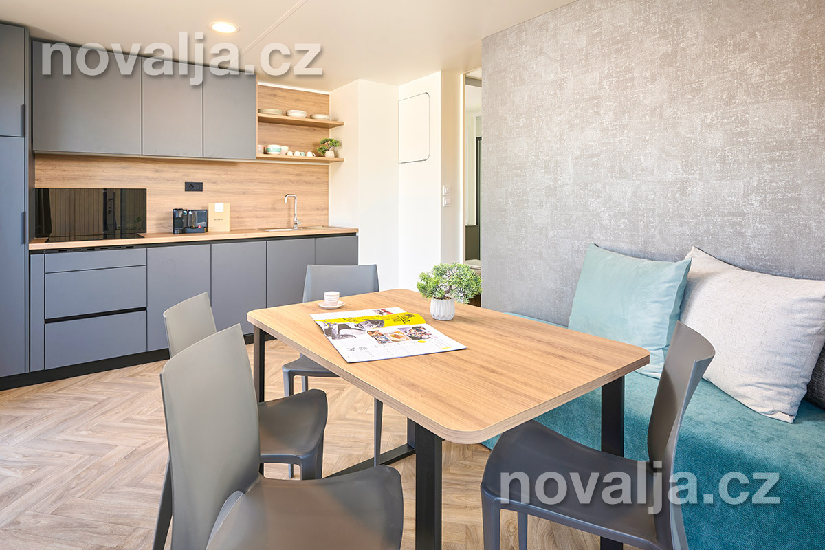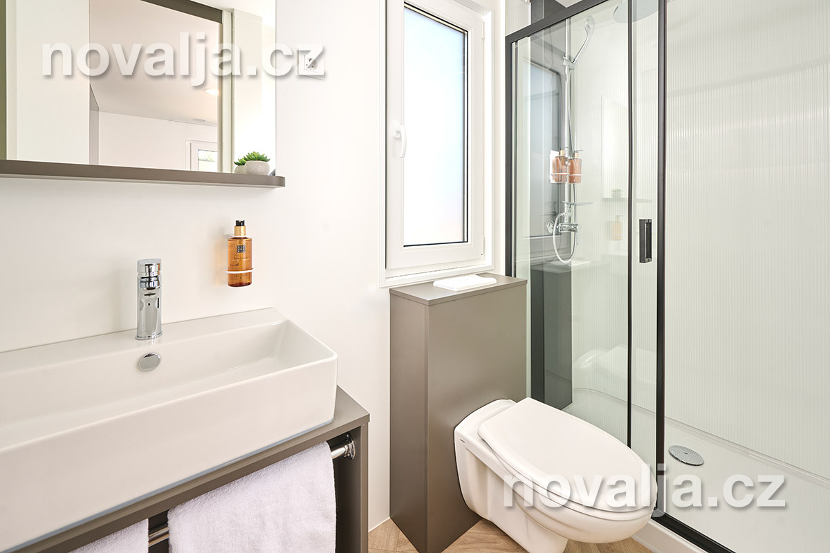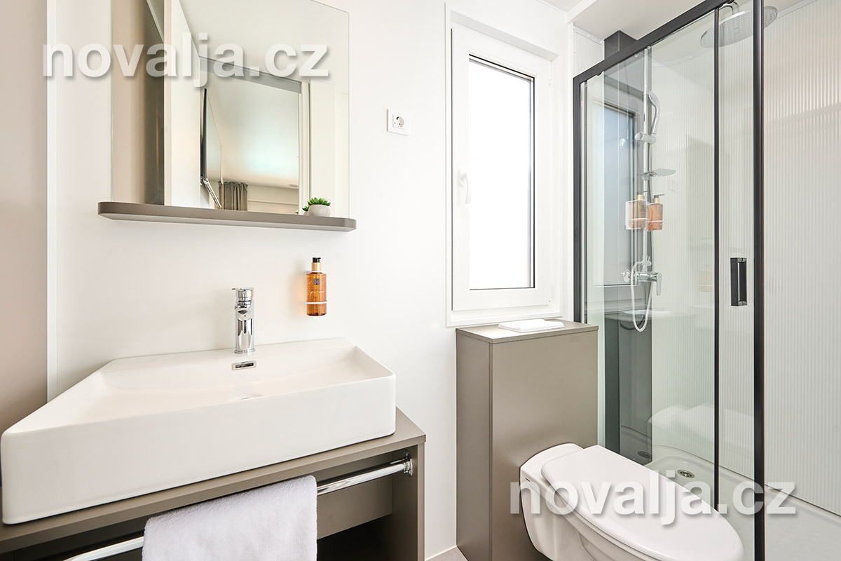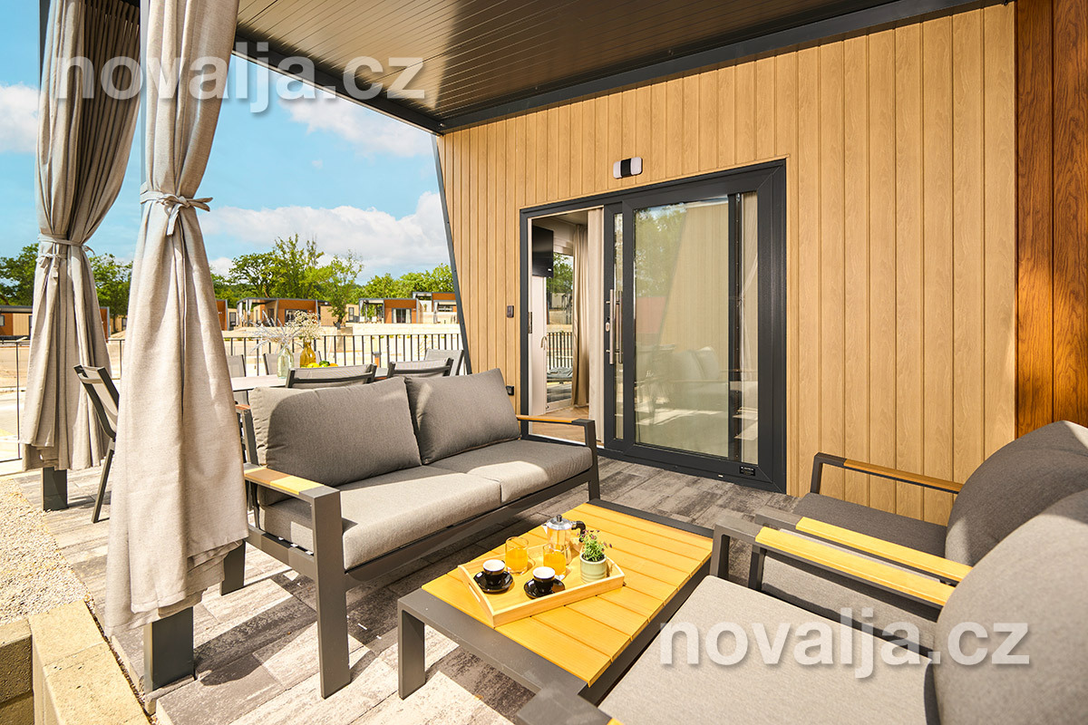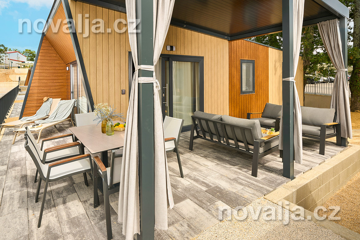 2 spálne s dvoma lôžkami (1x manželská posteľ a 2x samostatné lôžko), vybavená kuchyňa (chladnička, mraznička, umývačka, mikrovlnná rúra, varná kanvica, kávovar na filtrovanú kávu aj Nesspresso) s obývacím priestorom s rozkladacím gaučom pre 1 osobu, TV+SAT, trezor, 2x kúpeľňa so sprchovacím kútom a WC, fén, terasa so záhradným nábytkom a dvoma lehátkami. Klimatizácia v kuchyni (v cene).