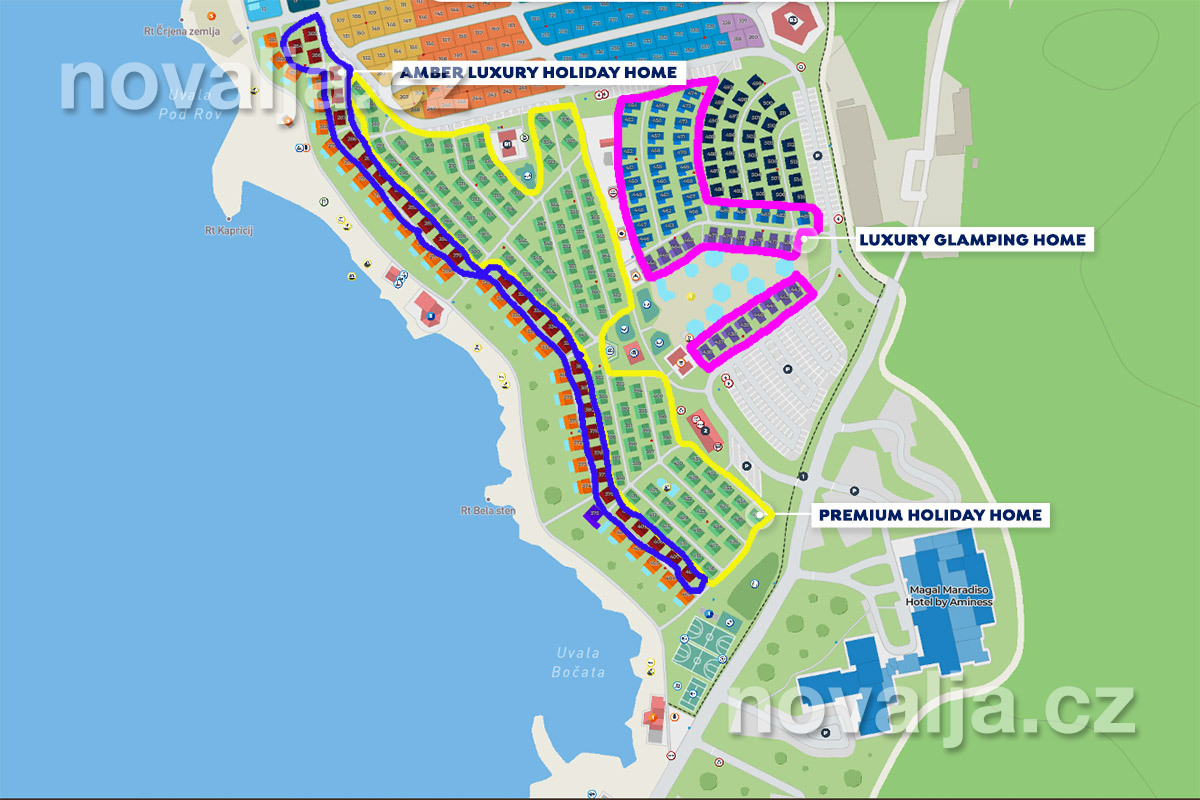 20–50 m od pláže (druhý rad), 130–350 m od bazénov.
