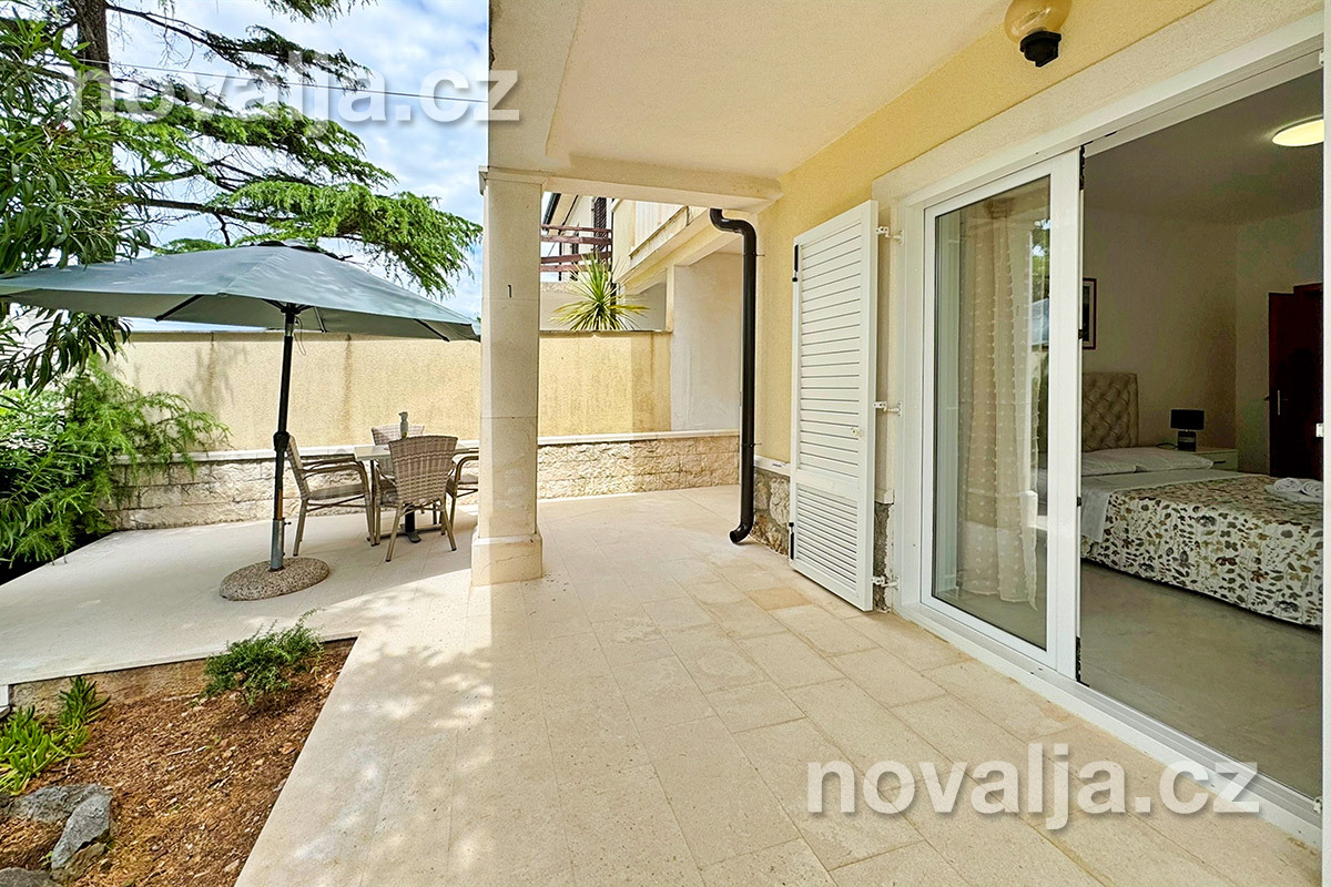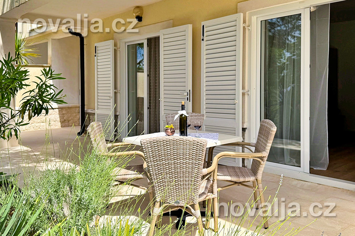 Okolo terasy apartmánu A5 prechádzajú klienti ubytovaní v apartmáne A4.