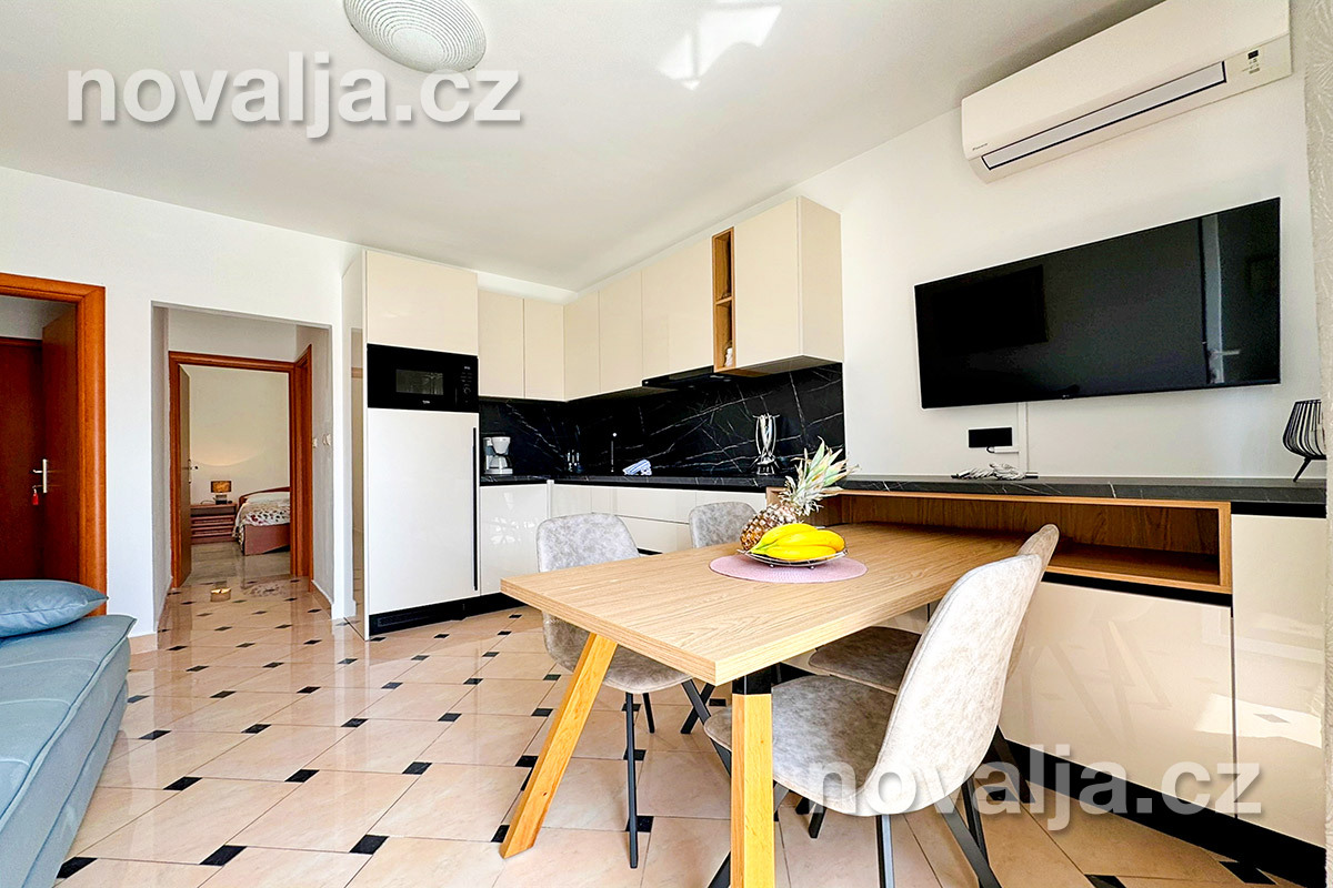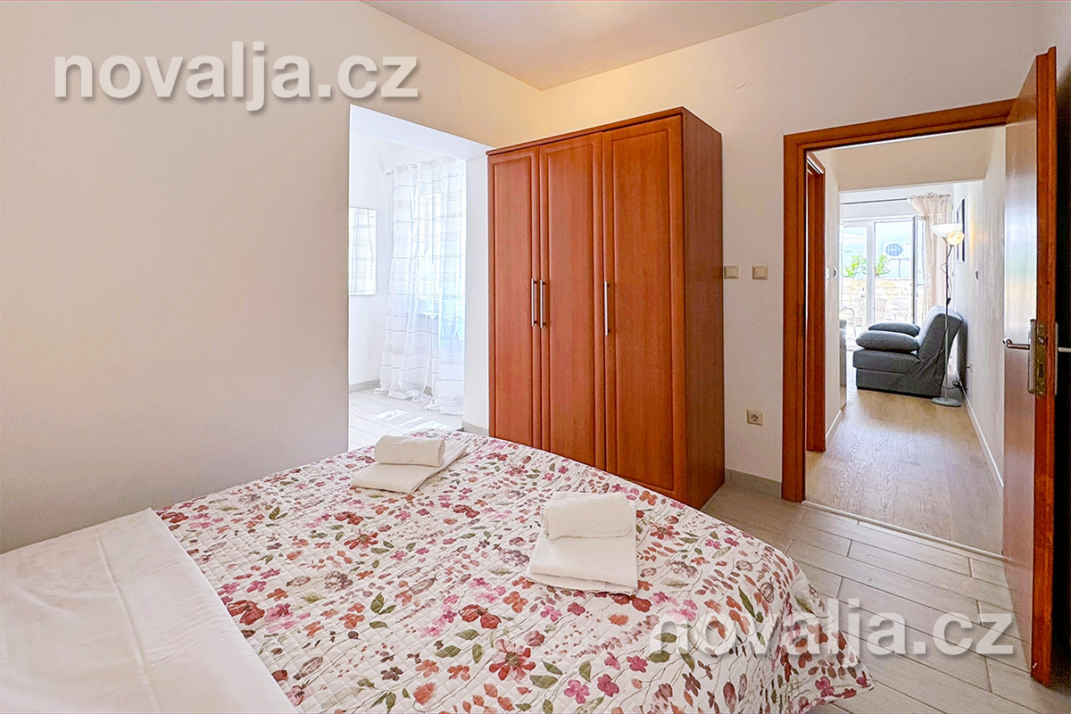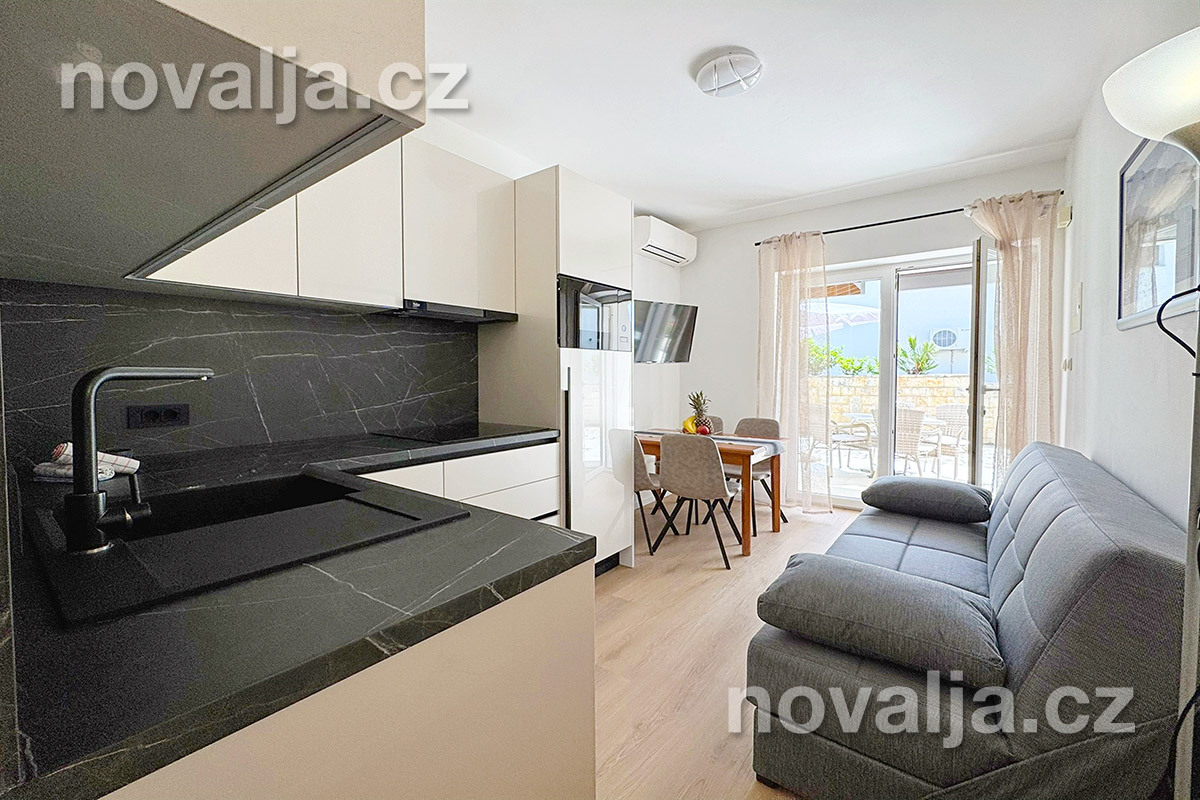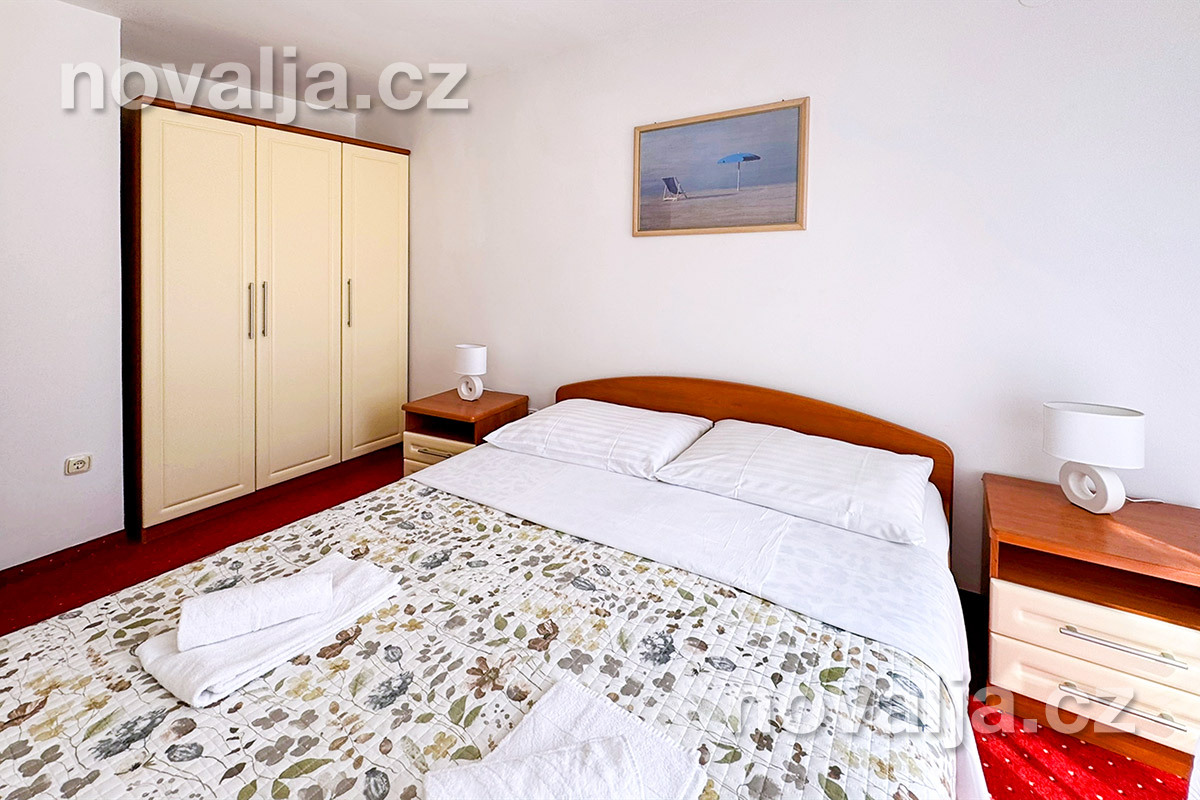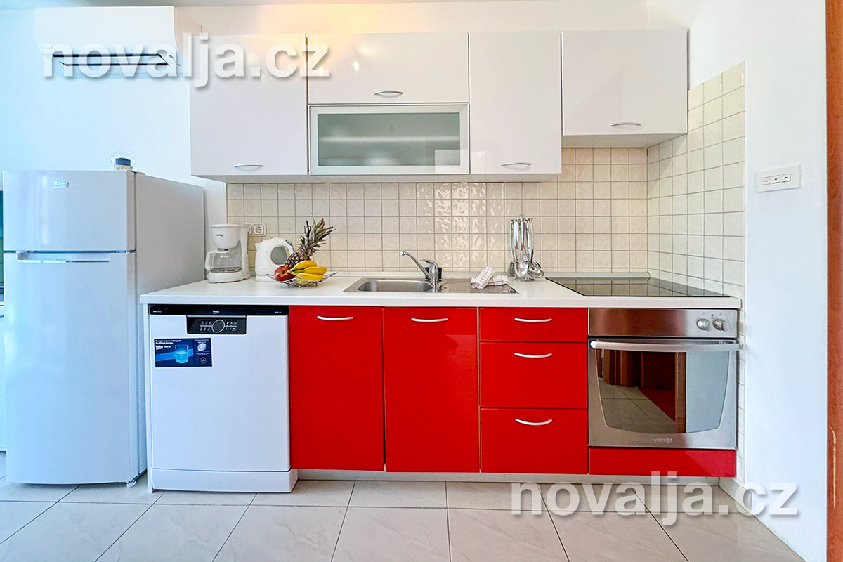 1 spálňa s dvoma lôžkami (200 x 180 cm), vybavená kuchyňa (sklokeramická varná doska, chladnička, mraznička, umývačka, mikrovlnná rúra, varná kanvica, kávovar) s rozkladacím gaučom pre 1–2 osoby, LCD TV+SAT, sociálne zariadenie so sprchovacím zeleň). Klimatizácia v spálni (v cene).