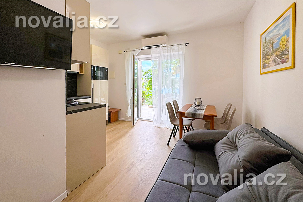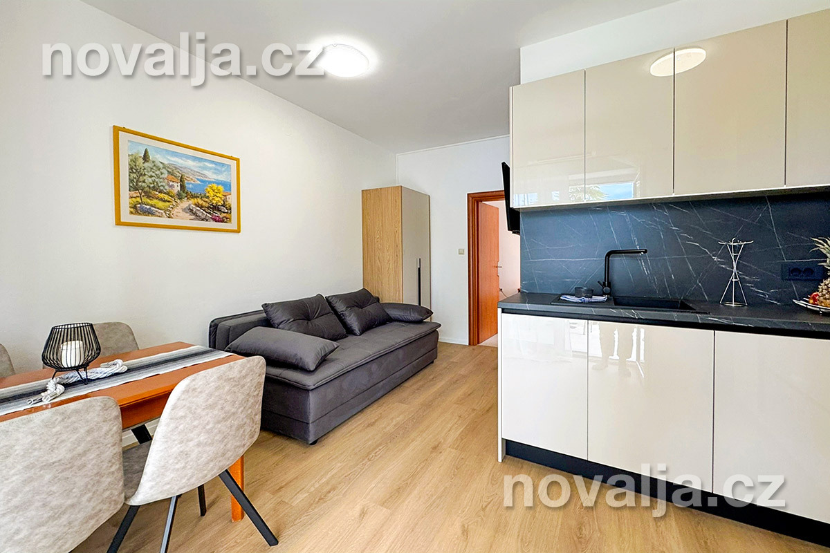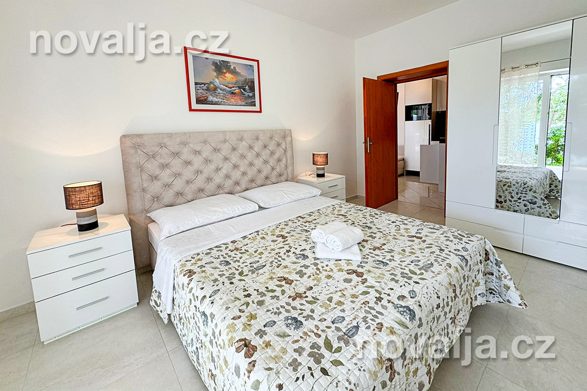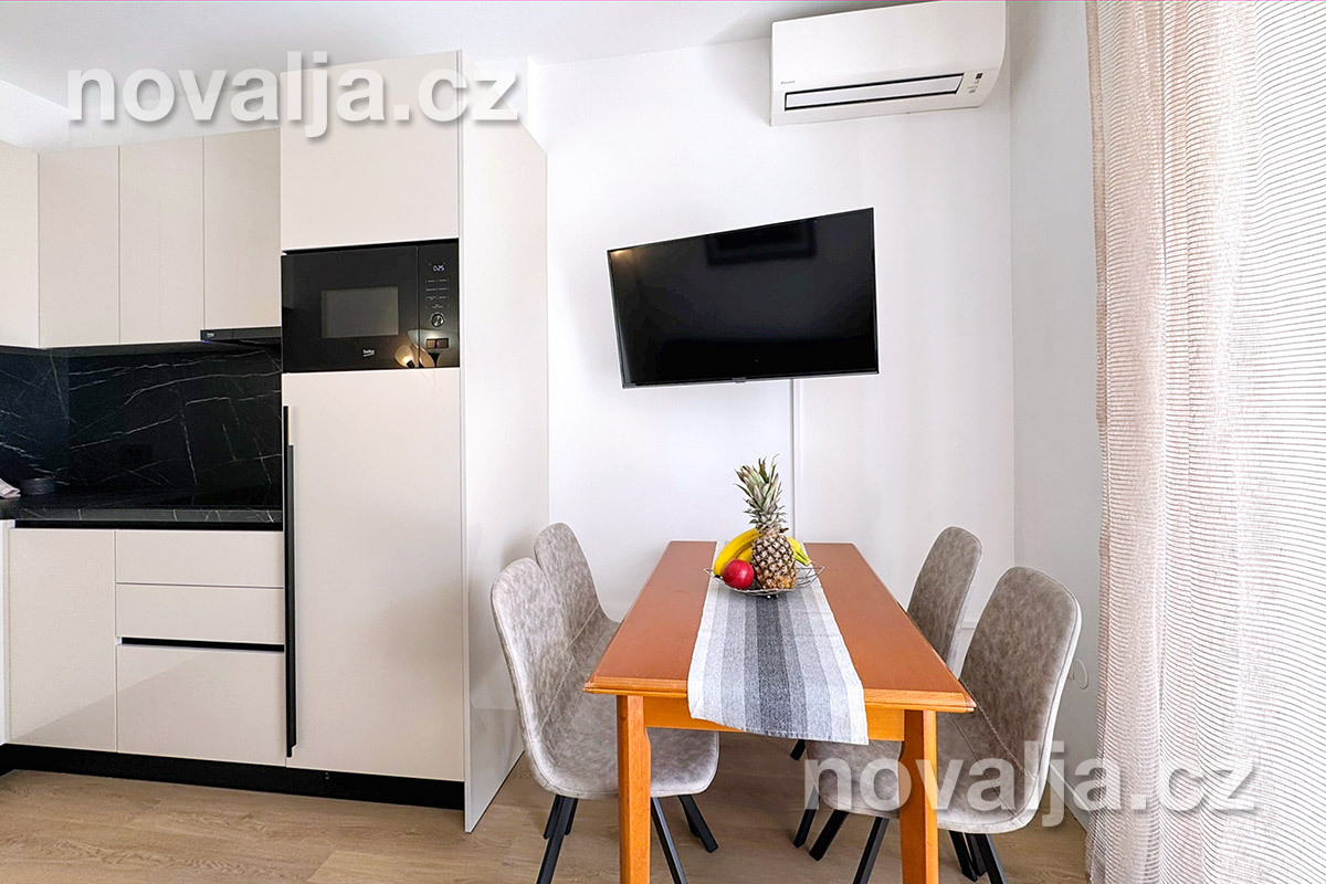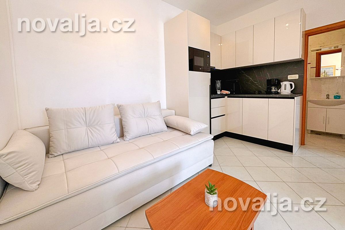 1 spálňa s dvoma lôžkami (200 x 180 cm), vybavená kuchyňa (sklokeramická varná doska, chladnička, mraznička, umývačka, mikrovlnná rúra, varná kanvica, kávovar) s rozkladacím gaučom pre 1–2 osoby, LCD TV+SAT, sociálne zariadenie so sprchovacím zeleň). Klimatizácia v spálni (v cene).