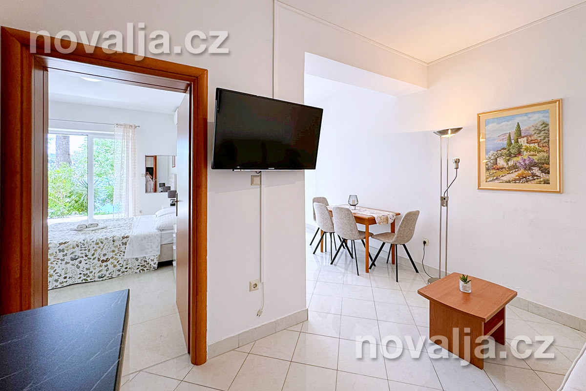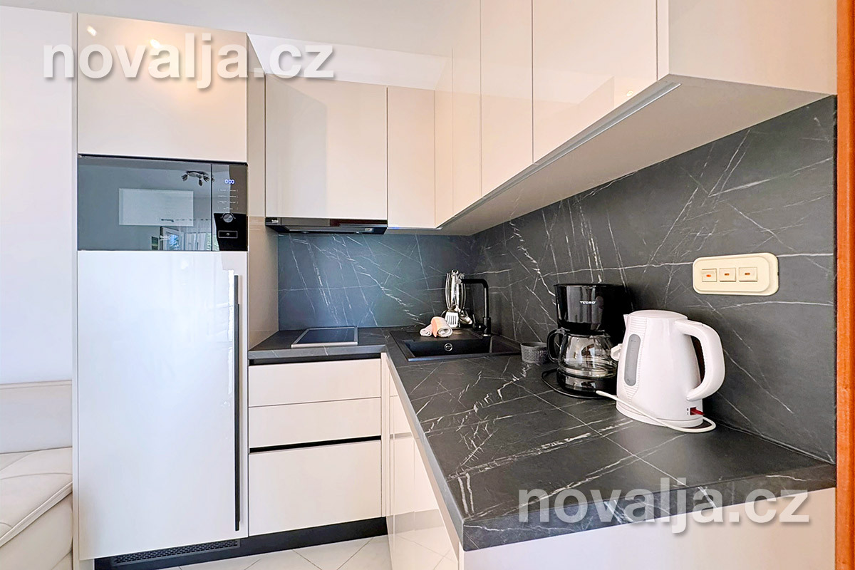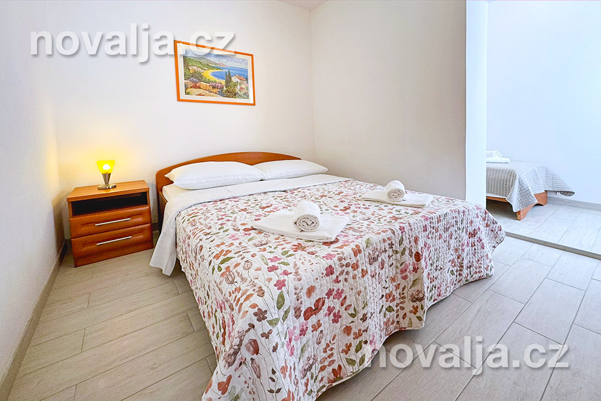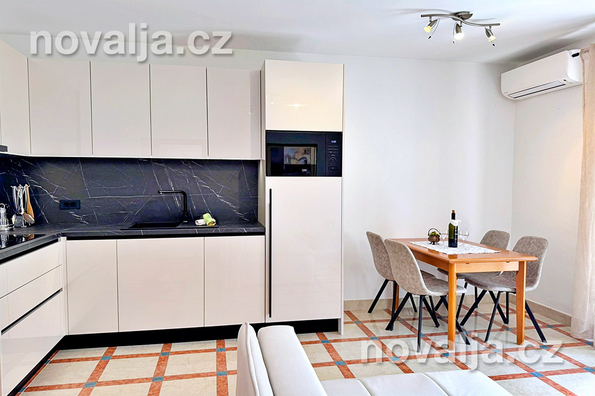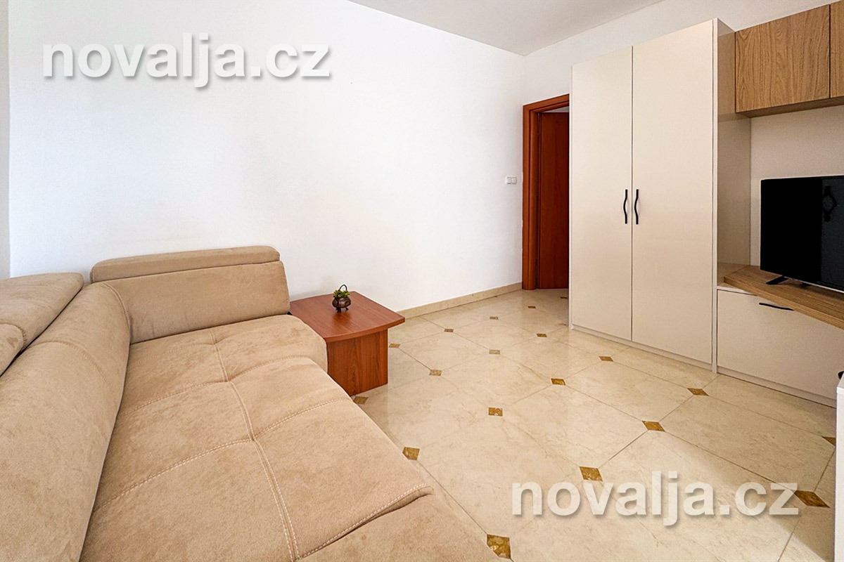 1 spálňa s dvoma lôžkami (200 x 180 cm), vybavená kuchyňa (sklokeramická varná doska, chladnička, mraznička, umývačka, mikrovlnná rúra, varná kanvica, kávovar) s rozkladacím gaučom pre 1–2 osoby, LCD TV+SAT, sociálne zariadenie so sprchovacím zeleň). Klimatizácia v spálni (v cene).