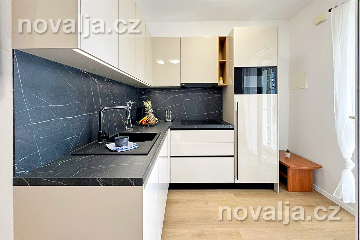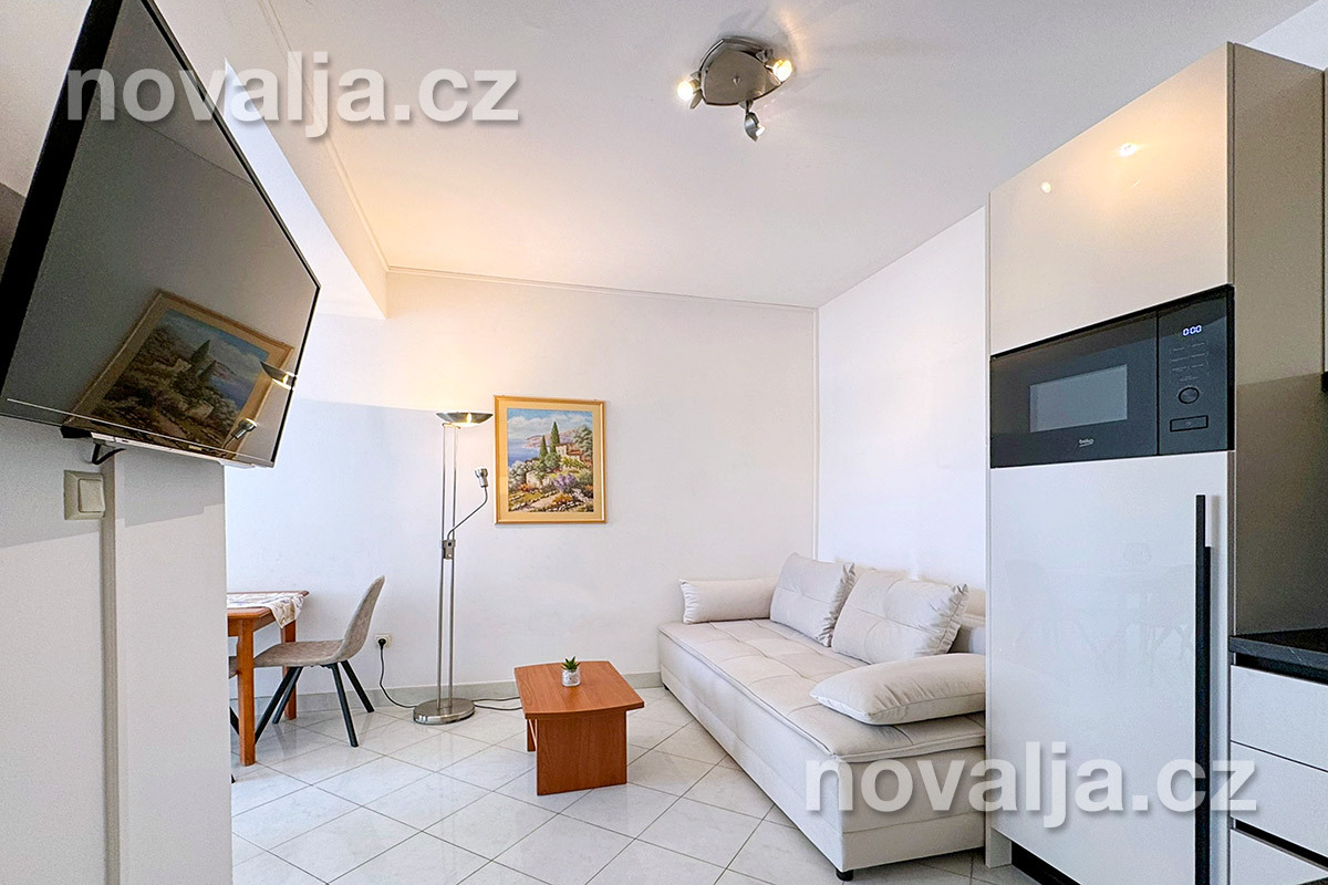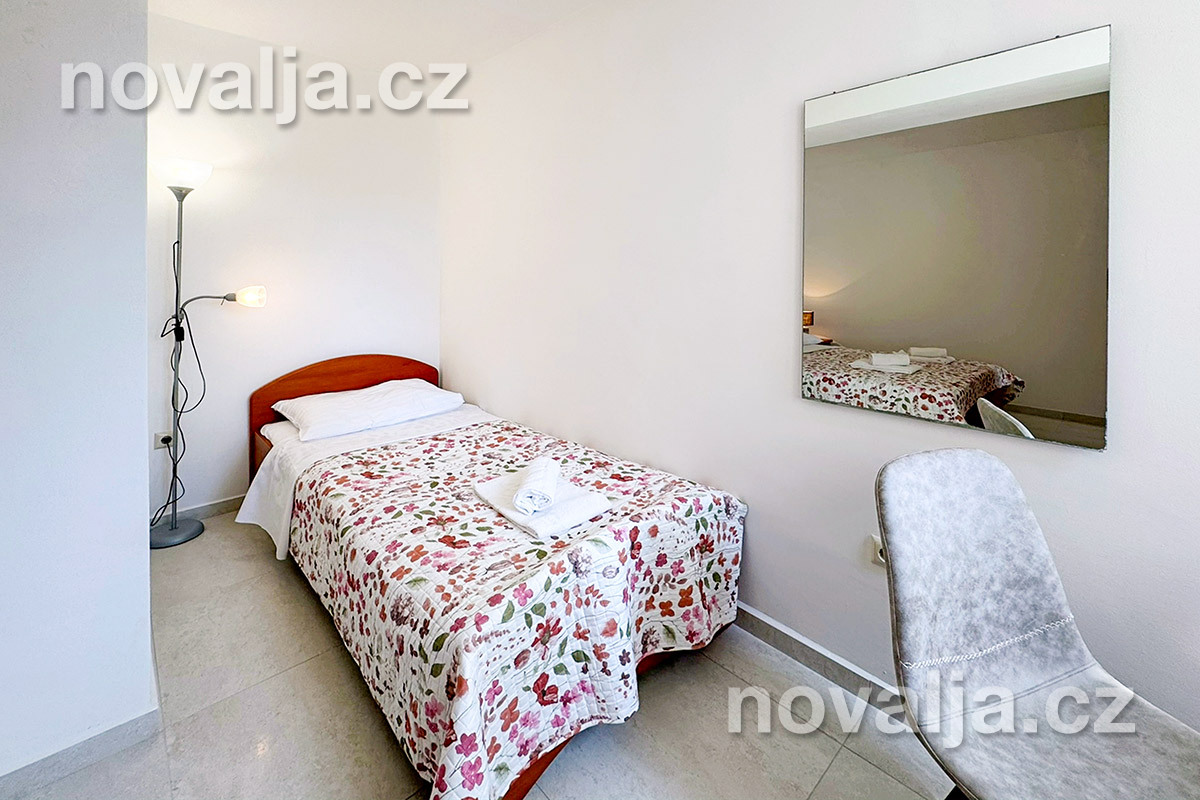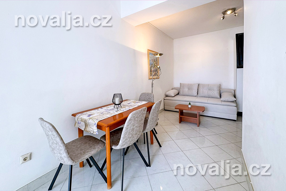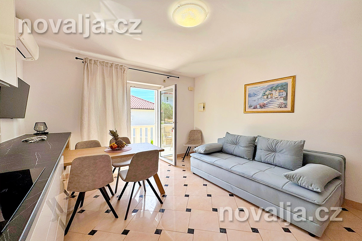 1 spálňa s dvoma lôžkami (200 x 180 cm), vybavená kuchyňa (sklokeramická varná doska, chladnička, mraznička, umývačka, mikrovlnná rúra, varná kanvica, kávovar) s rozkladacím gaučom pre 1–2 osoby, LCD TV+SAT, sociálne zariadenie so sprchovacím zeleň). Klimatizácia v spálni (v cene).