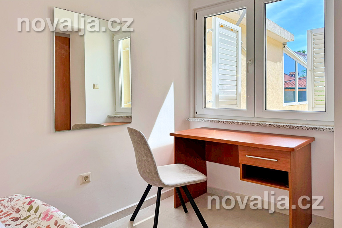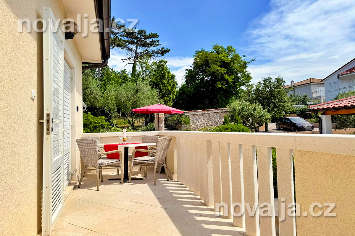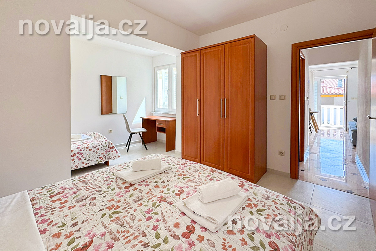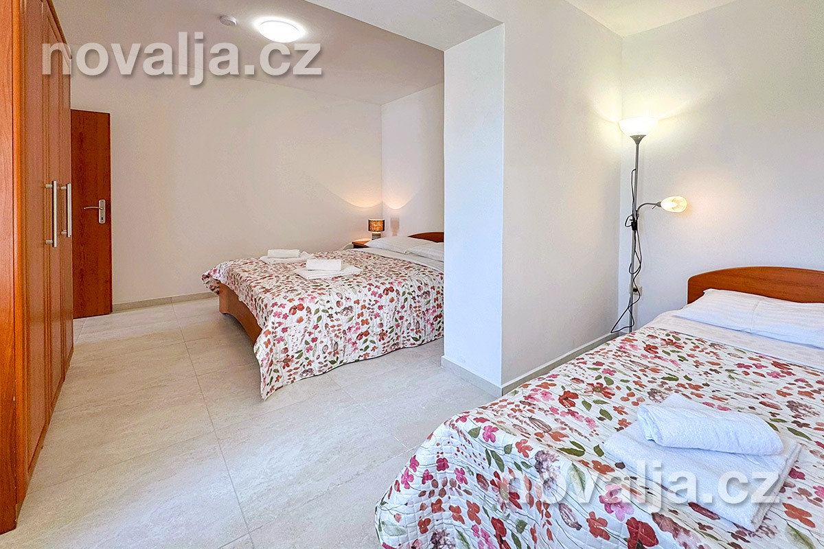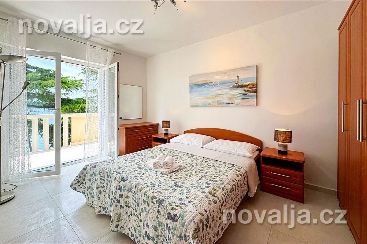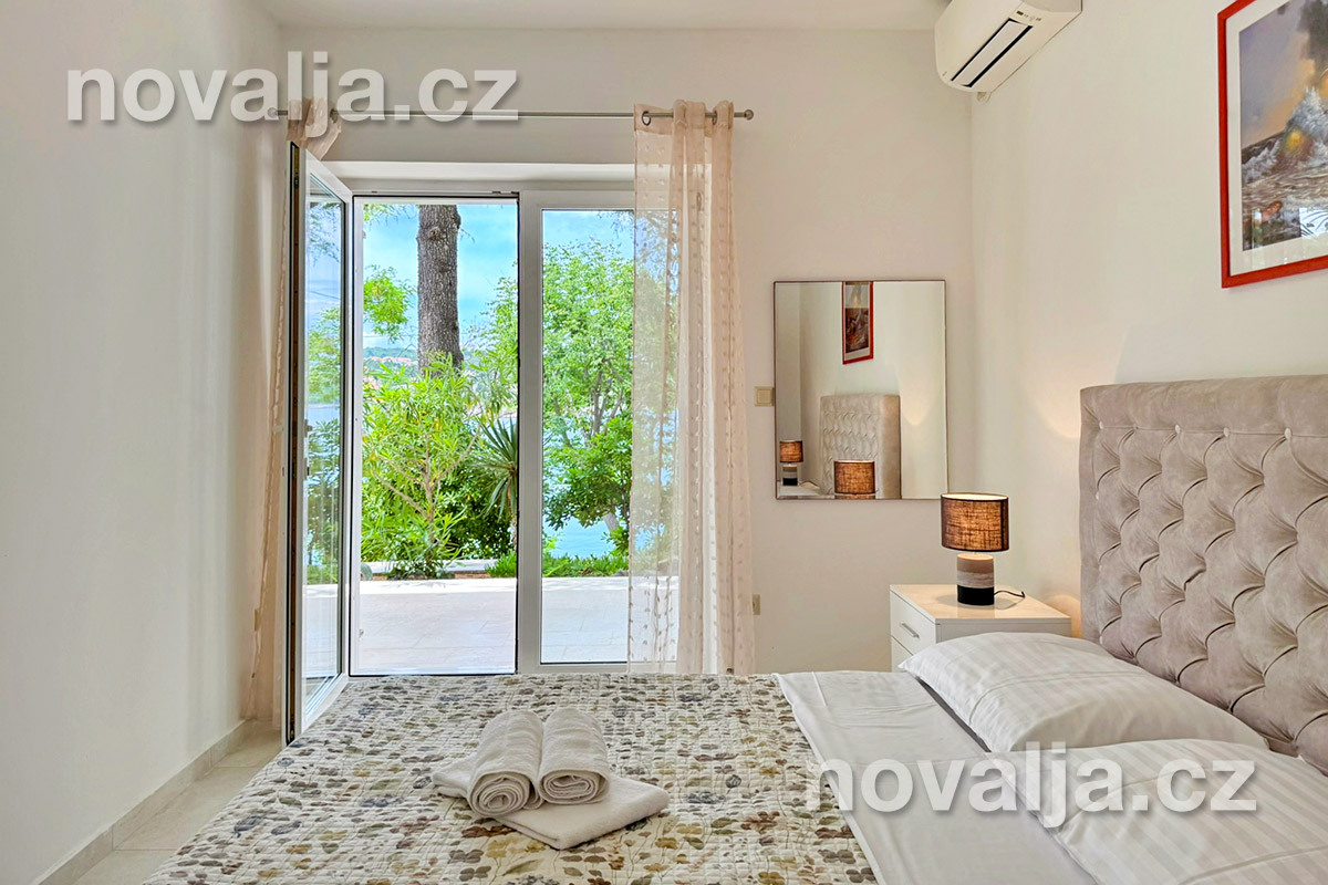 2 spálne s dvoma lôžkami - v jednej spálni manželské lôžko 200 x 180 cm, v druhej spálni dve samostatné lôžka, vybavená kuchyňa (sklokeramická varná doska, chladnička, mraznička, umývačka, rúra, varná kanvica, kávovar) s rozkladacím gaučom kútom a WC, fén, veranda so vstupom na terasu s čiastočným výhľadom na more (cez zeleň). Klimatizácia v kuchyni (v cene).