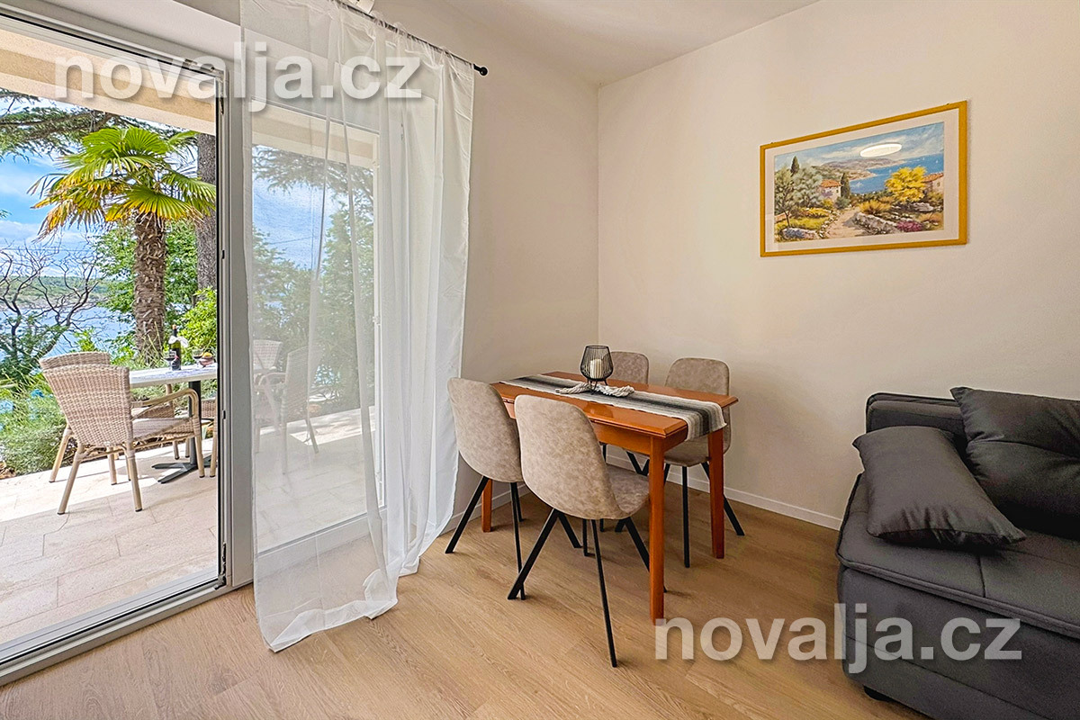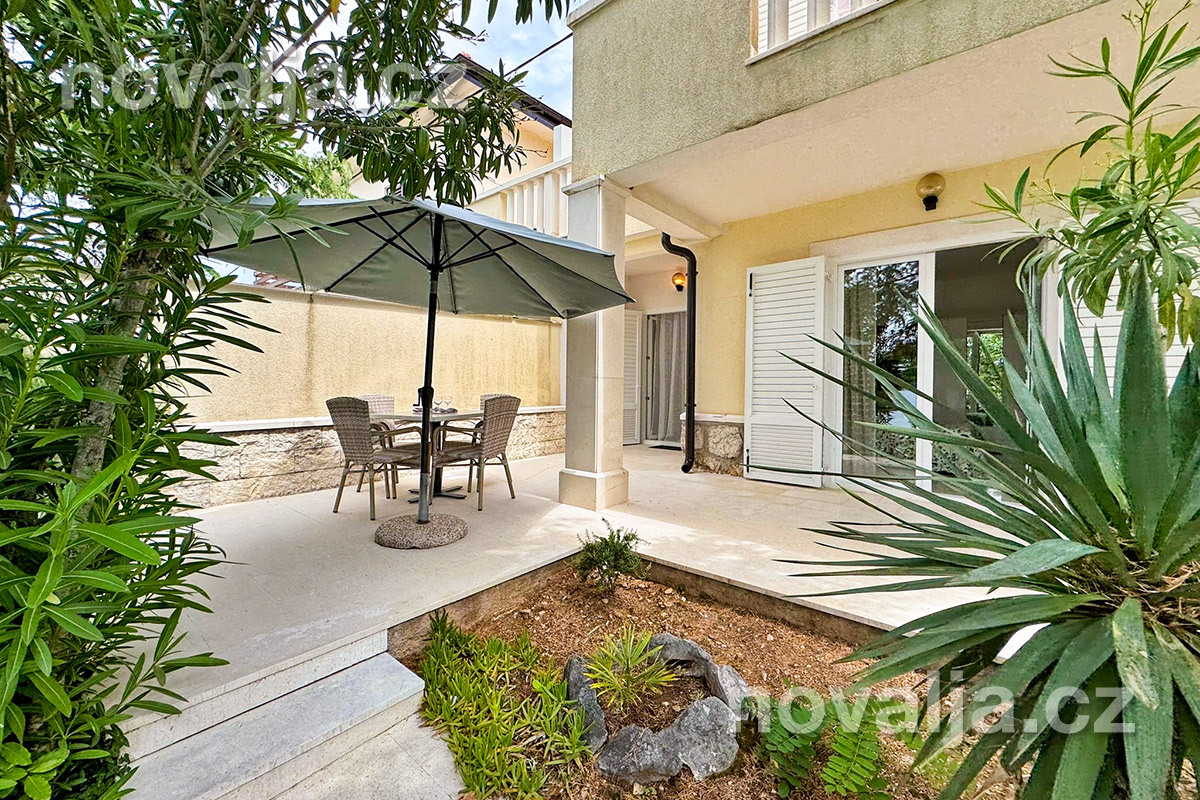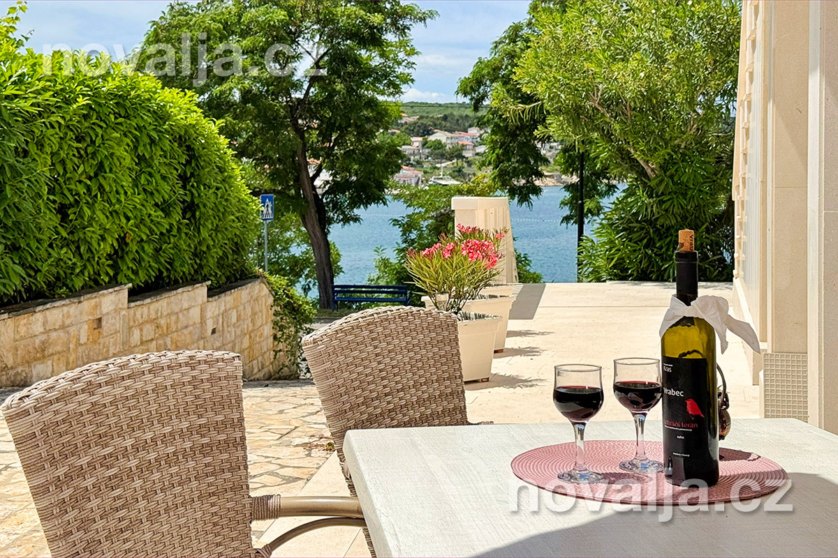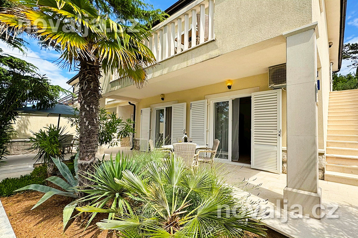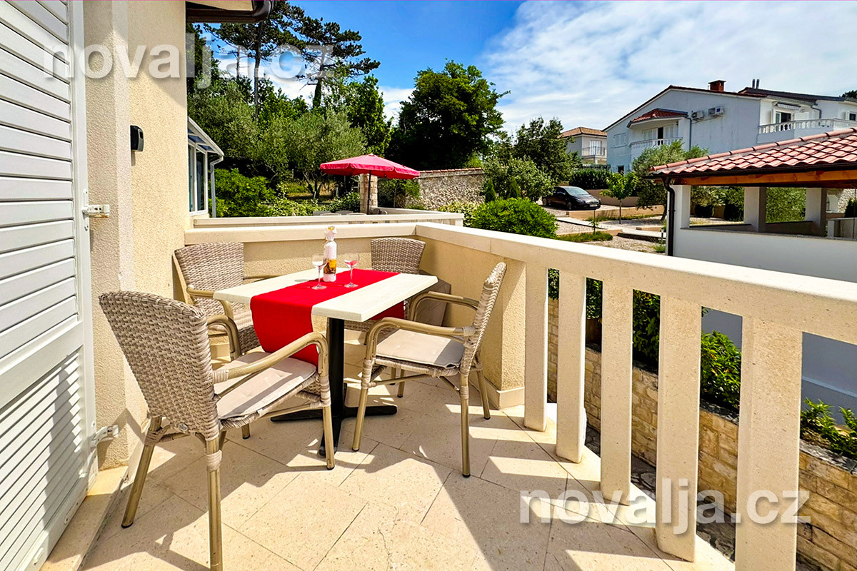 2 spálne s dvoma lôžkami - v jednej spálni manželské lôžko 200 x 180 cm, v druhej spálni dve samostatné lôžka, vybavená kuchyňa (sklokeramická varná doska, chladnička, mraznička, umývačka, rúra, varná kanvica, kávovar) s rozkladacím gaučom kútom a WC, fén, veranda so vstupom na terasu s čiastočným výhľadom na more (cez zeleň). Klimatizácia v kuchyni (v cene).