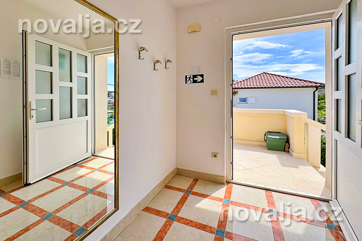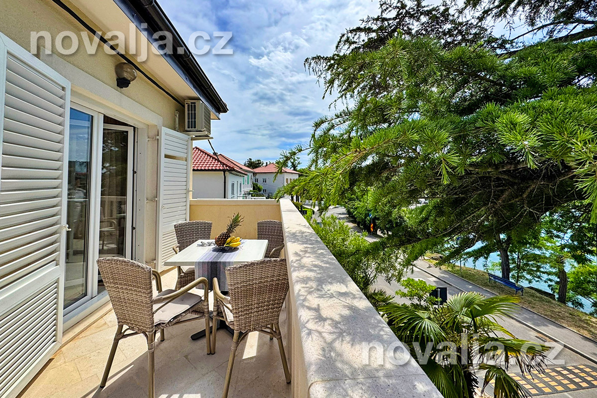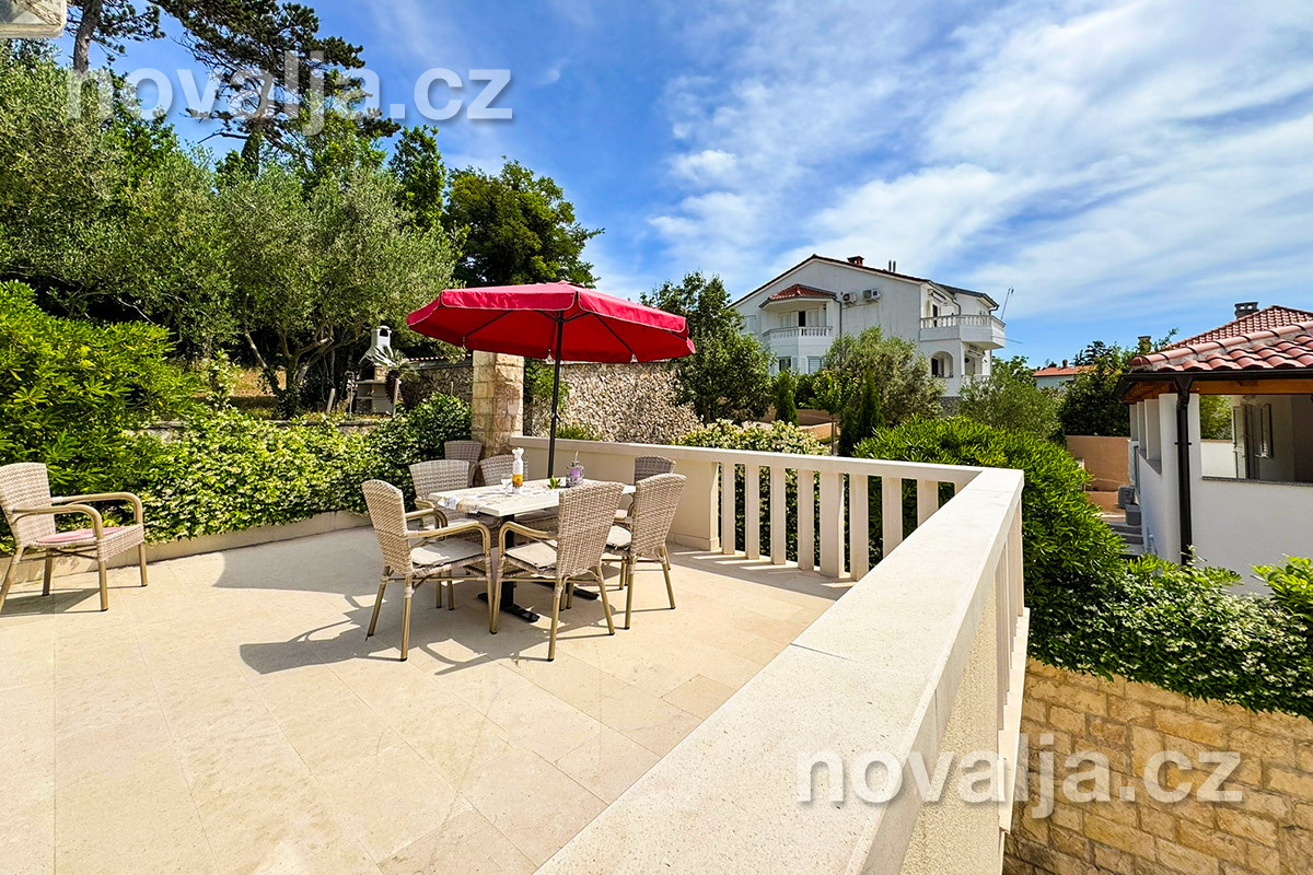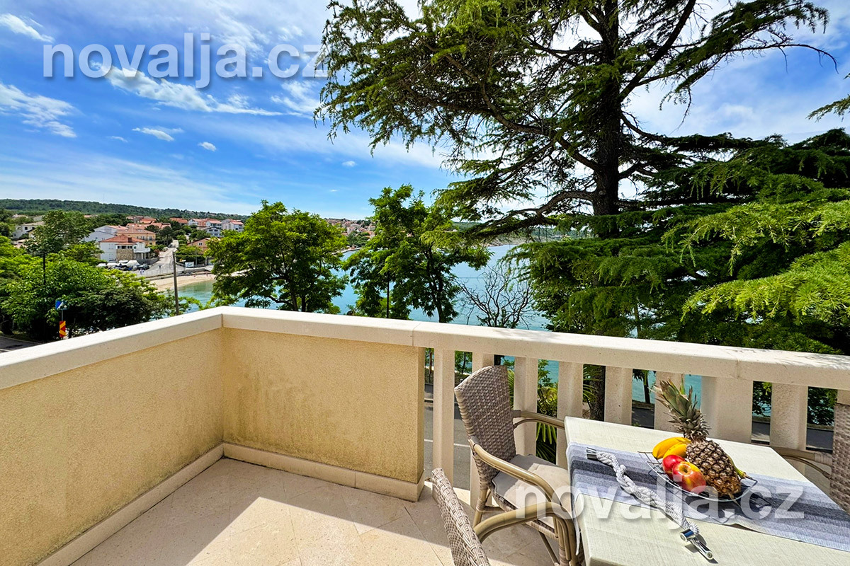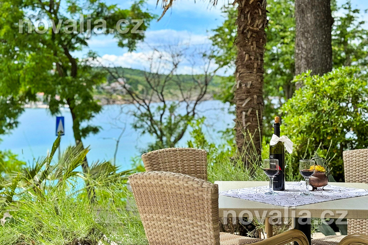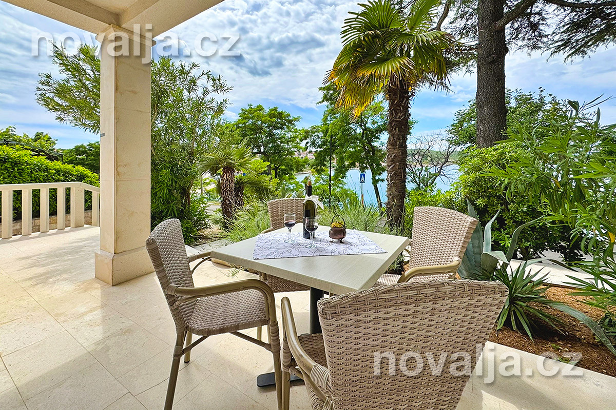 2 spálne s dvoma lôžkami - v jednej spálni manželské lôžko 200 x 180 cm, v druhej spálni dve samostatné lôžka, vybavená kuchyňa (sklokeramická varná doska, chladnička, mraznička, umývačka, rúra, varná kanvica, kávovar) s rozkladacím gaučom kútom a WC, fén, veranda so vstupom na terasu s čiastočným výhľadom na more (cez zeleň). Klimatizácia v kuchyni (v cene).