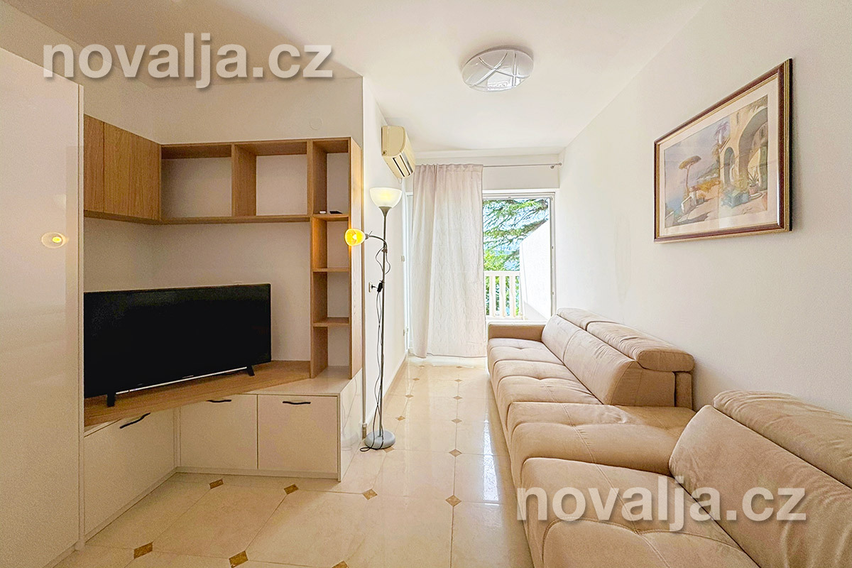 1 spálňa s tromi lôžkami (manželské lôžko 200 x 180 cm a jedno samostatné lôžko), vybavená kuchyňa (sklokeramická varná doska, chladnička, mraznička, umývačka, mikrovlnná rúra, varná kanvica, kávovar), obývačka s rozkladacím gau so sprchovacím kútom a WC, fén, balkón s čiastočným výhľadom na more (cez zeleň). Klimatizácia v kuchyni a v obývačke (v cene).