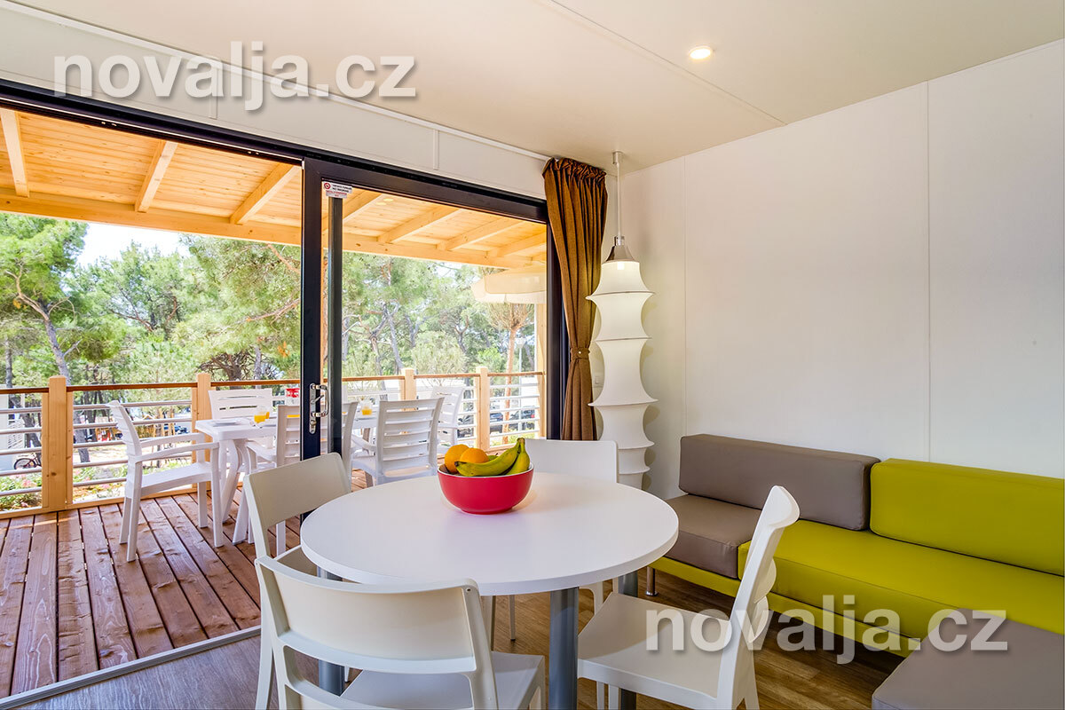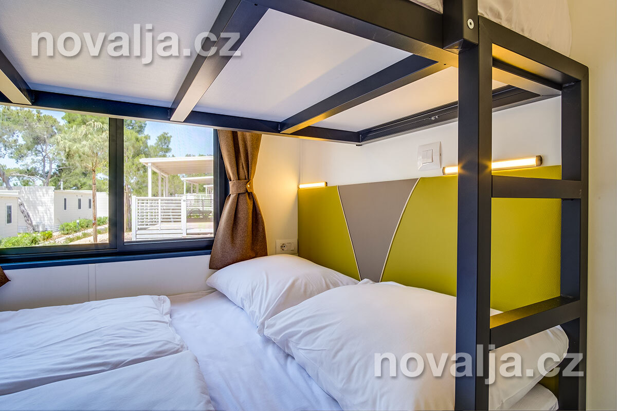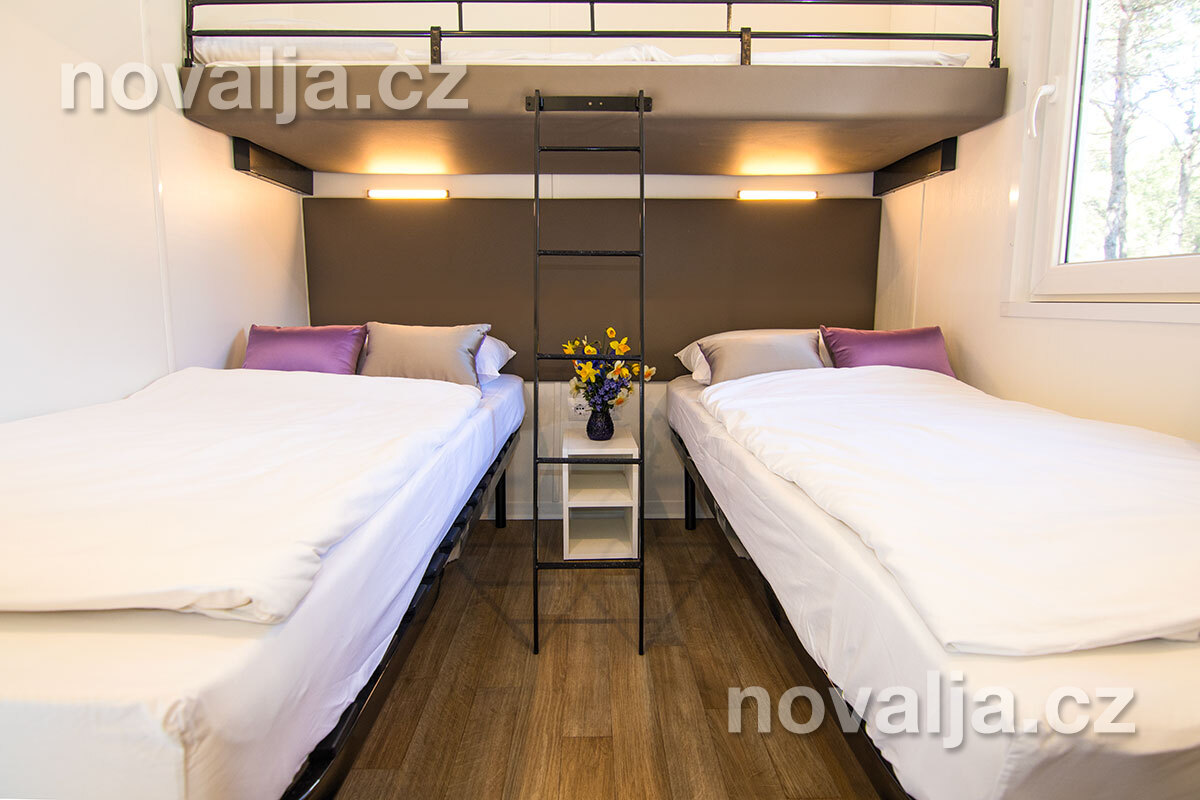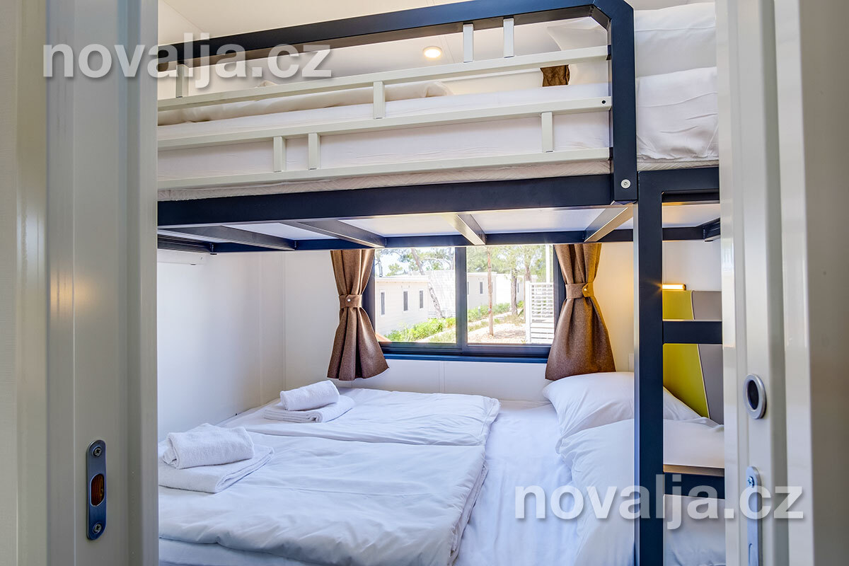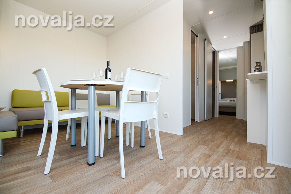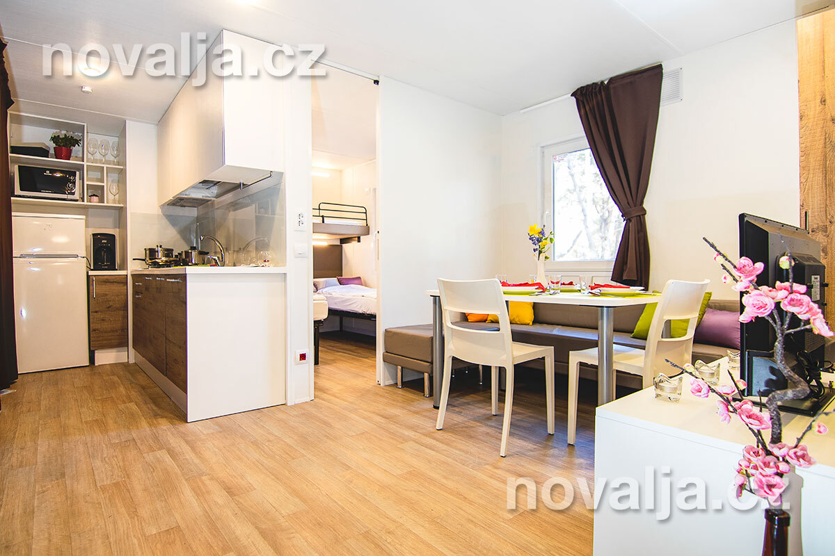 2 spálne - jedna s dvoma lôžkami, druhá s tromi lôžkami (tretie lôžko na poschodovej posteli), vybavená kuchyňa (chladnička, mraznička, umývačka, plynová varná doska, mikrovlnná rúra, varná kanvica, kávovar) s rozkladacou pohovkou pre 1 osobu, TV+SAT, sociálne zariadenie a dvoma lehátkami. Klimatizácia v kuchyni (v cene).