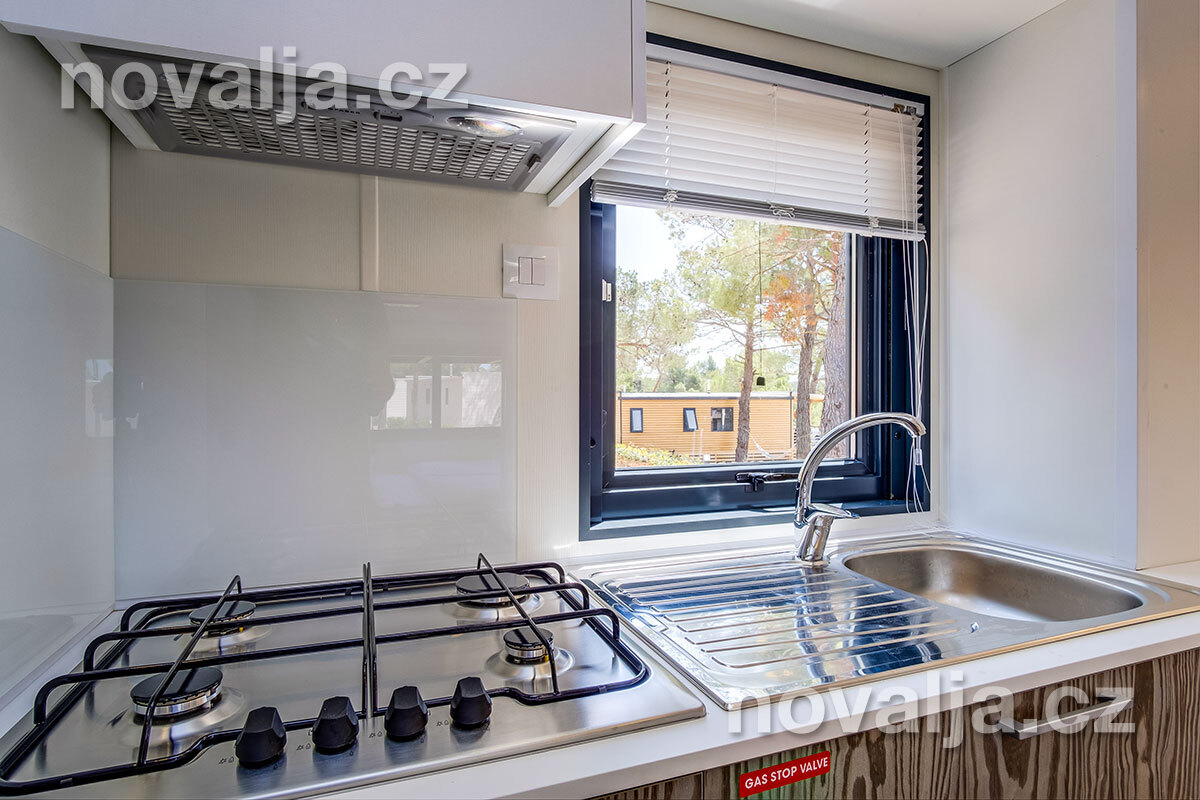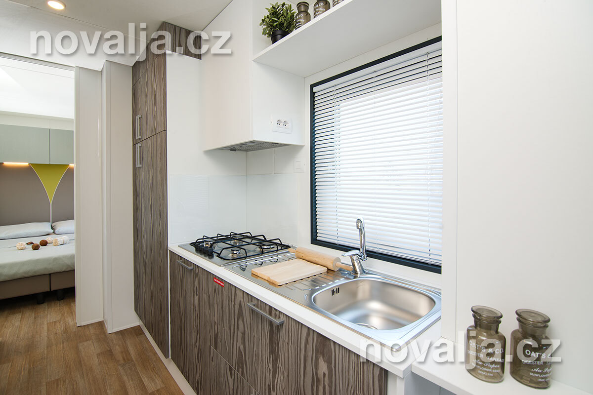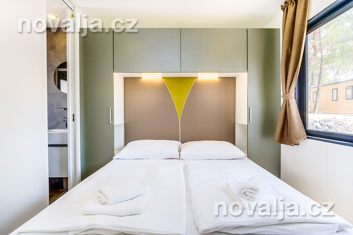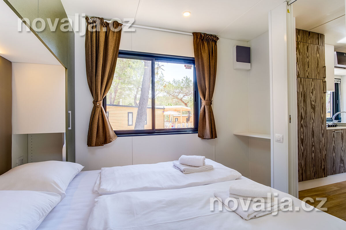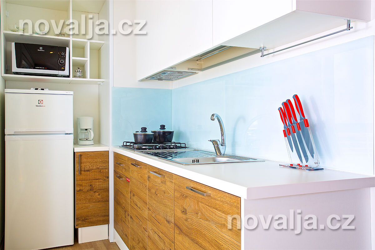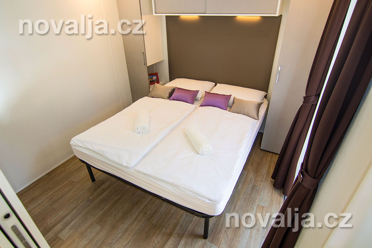 2 spálne - jedna s dvoma lôžkami, druhá s tromi lôžkami (tretie lôžko na poschodovej posteli), vybavená kuchyňa (chladnička, mraznička, umývačka, plynová varná doska, mikrovlnná rúra, varná kanvica, kávovar) s rozkladacou pohovkou pre 1 osobu, TV+SAT, sociálne zariadenie a dvoma lehátkami. Klimatizácia v kuchyni (v cene).