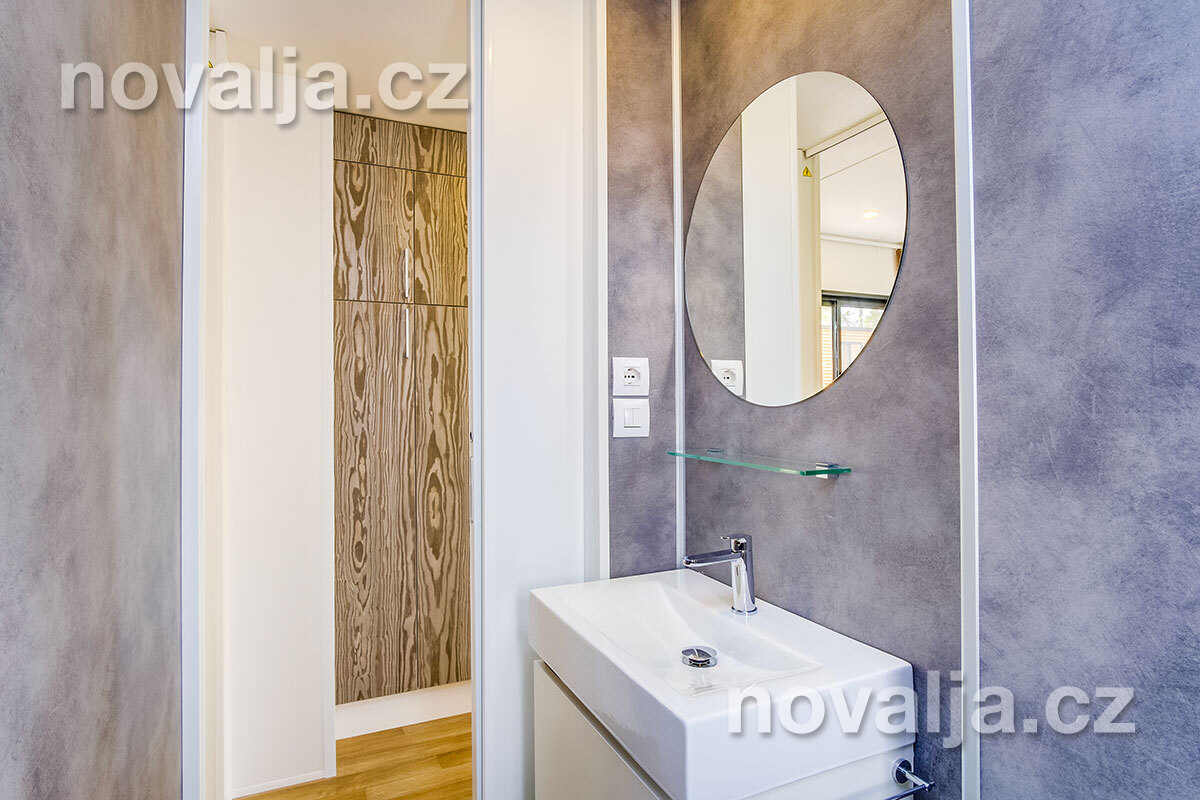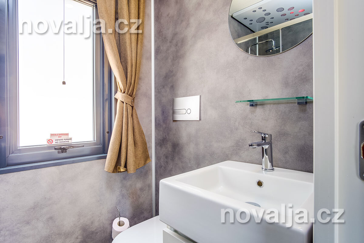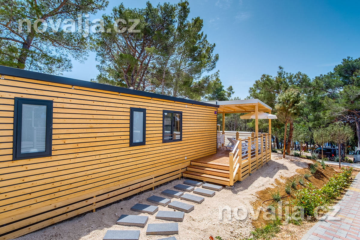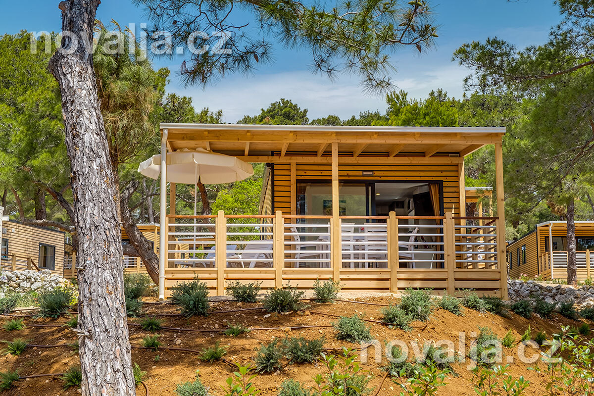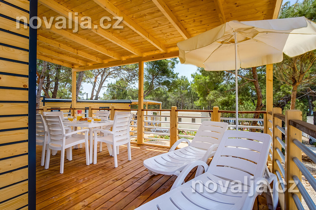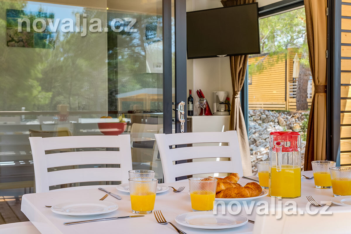 2 spálne - jedna s dvoma lôžkami, druhá s tromi lôžkami (tretie lôžko na poschodovej posteli), vybavená kuchyňa (chladnička, mraznička, umývačka, plynová varná doska, mikrovlnná rúra, varná kanvica, kávovar) s rozkladacou pohovkou pre 1 osobu, TV+SAT, sociálne zariadenie a dvoma lehátkami. Klimatizácia v kuchyni (v cene).