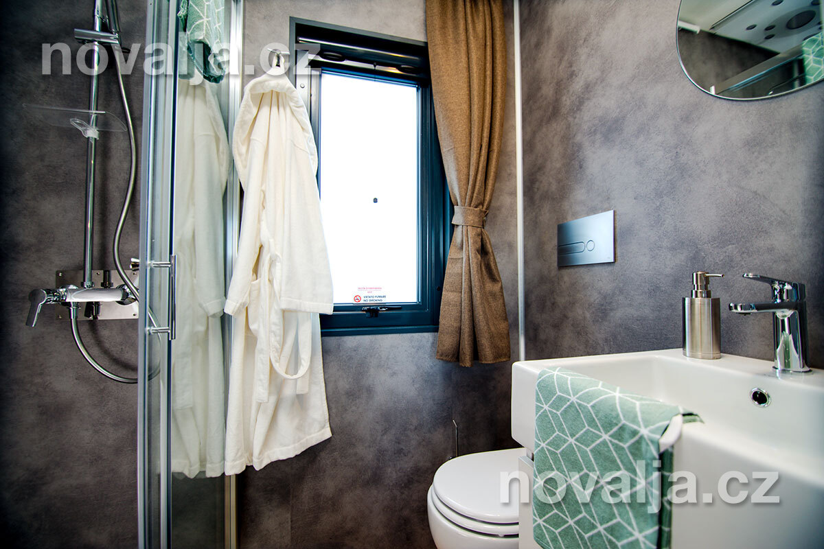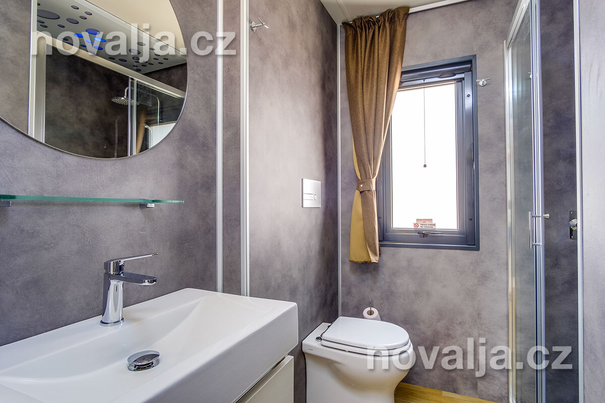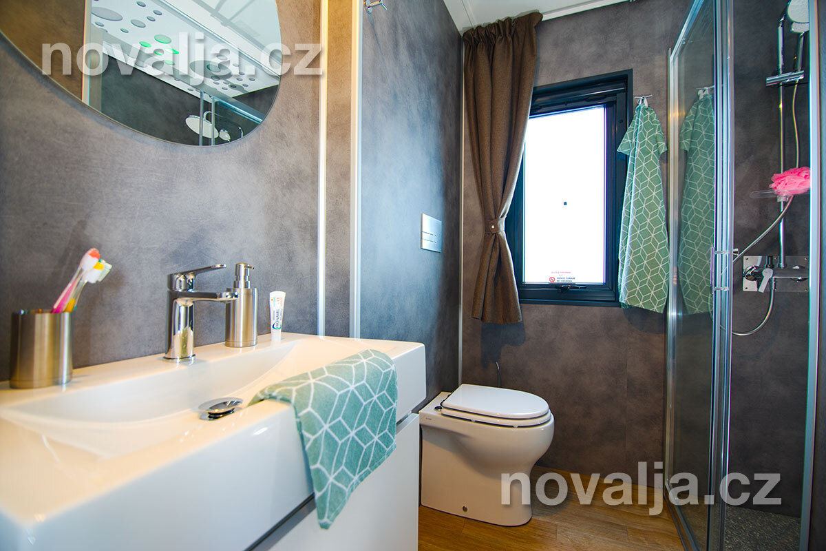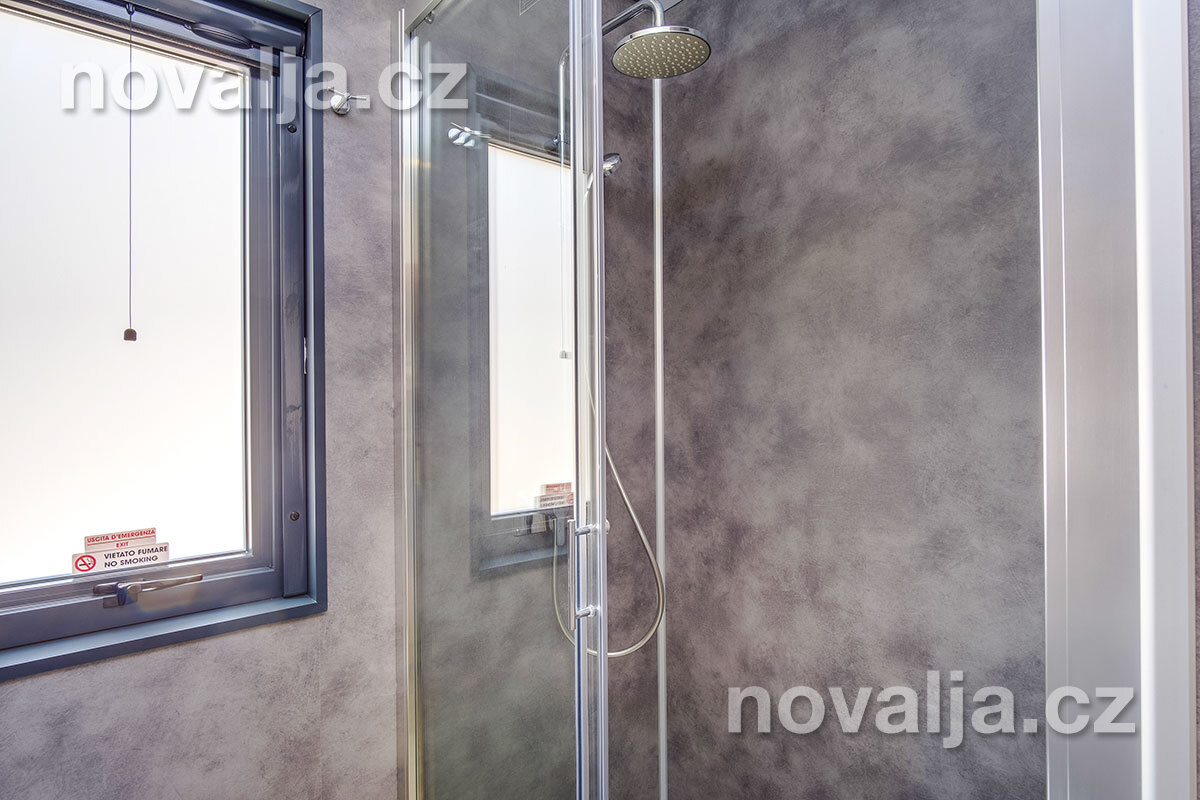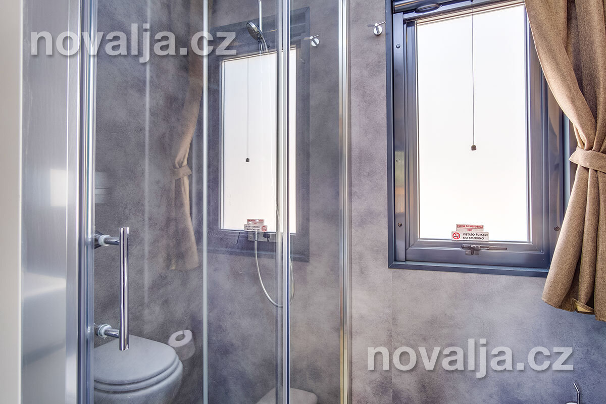 2 spálne - jedna s dvoma lôžkami, druhá s tromi lôžkami (tretie lôžko na poschodovej posteli), vybavená kuchyňa (chladnička, mraznička, umývačka, plynová varná doska, varná kanvica) s rozkladacou pohovkou pre 1 osobu, TV+SAT, 2x sociálne zariadenie so sprchovacím kútom a WC. Klimatizácia v kuchyni (v cene).