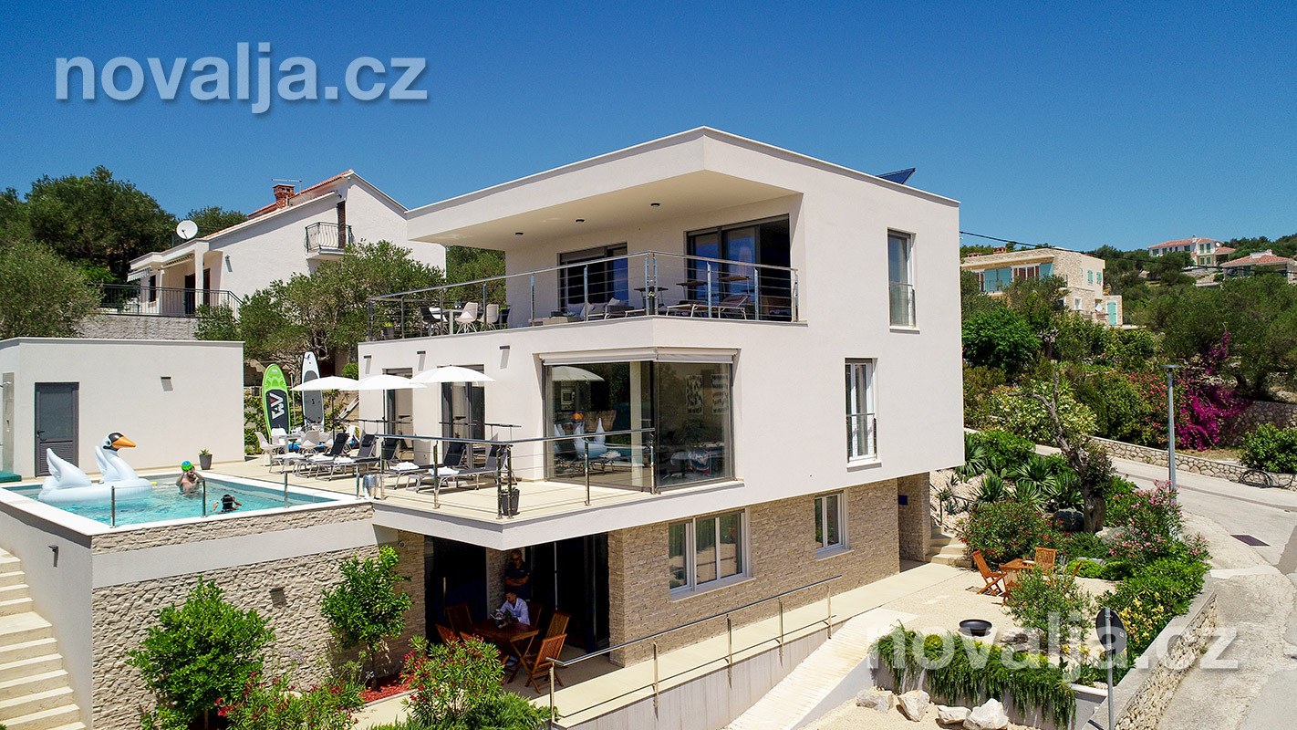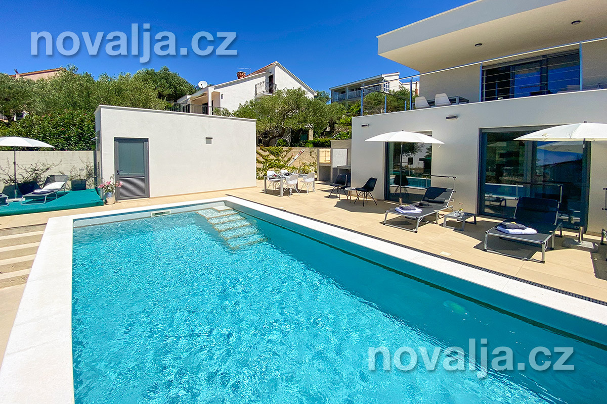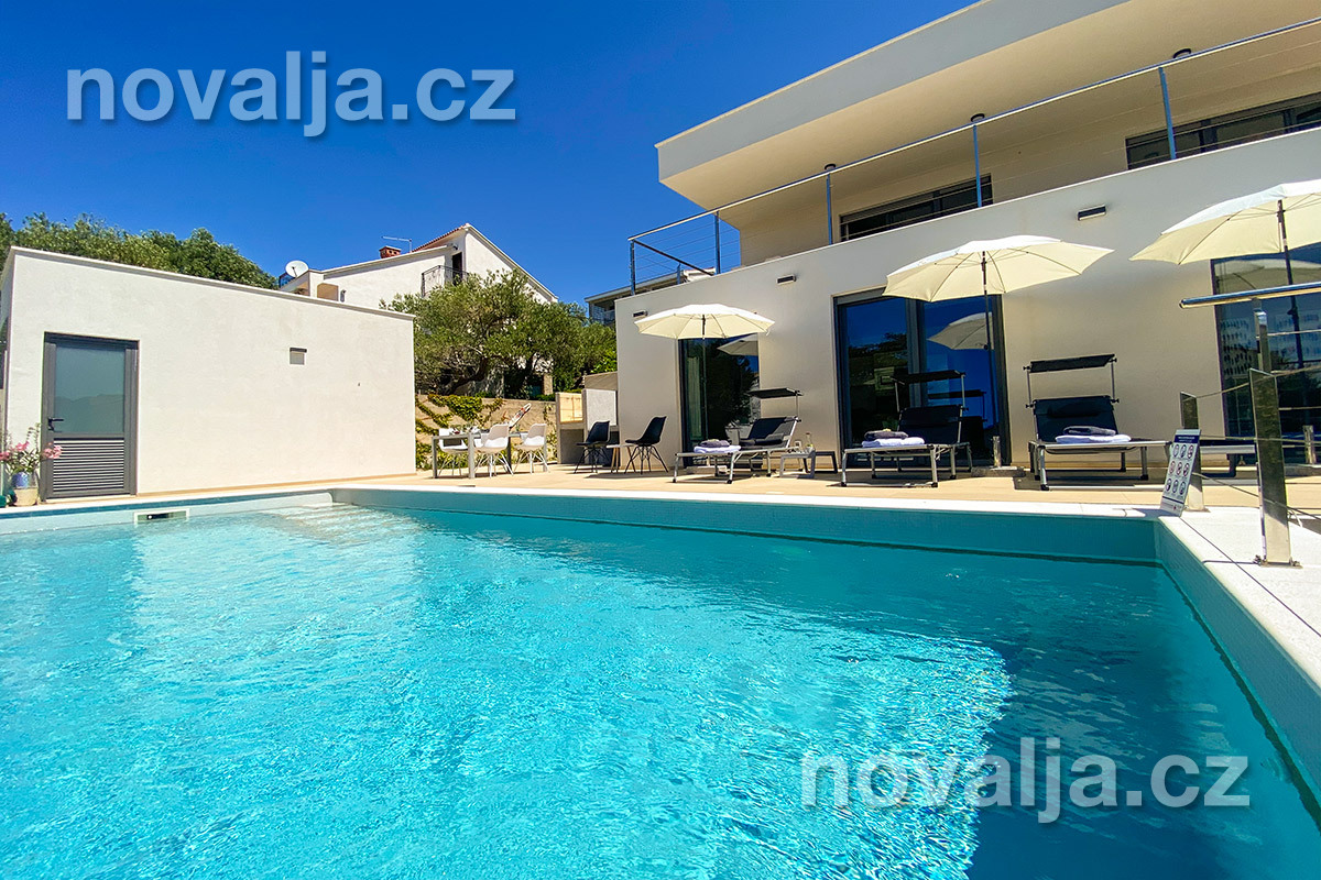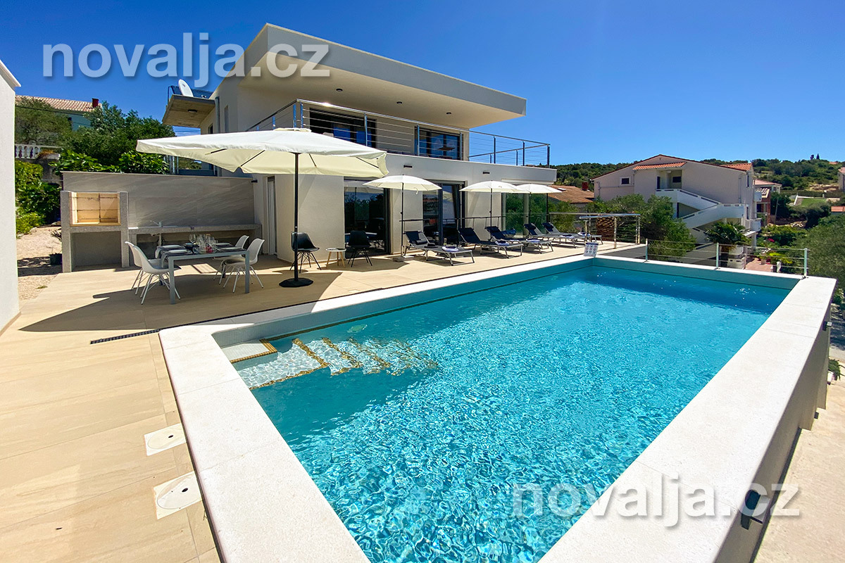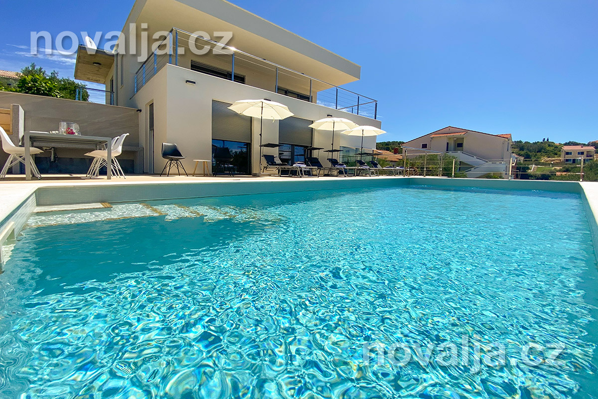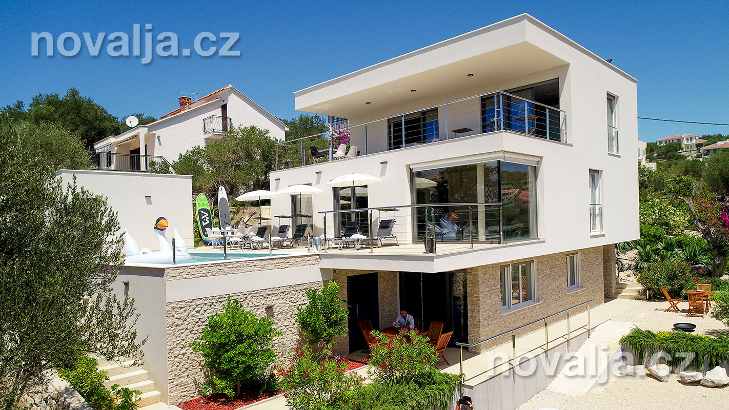 Vila vás zaujme hneď na prvý pohľad – je svetlá, moderne zariadená, s krásnym vyhrievaným bazénom a priestrannými terasami s lehátkami a výhľadom na more. K dispozícii je aj sauna a pri bazéne letná kuchyňa a gril. Krásna kamienková pláž sa nachádza len 80 m od domu.