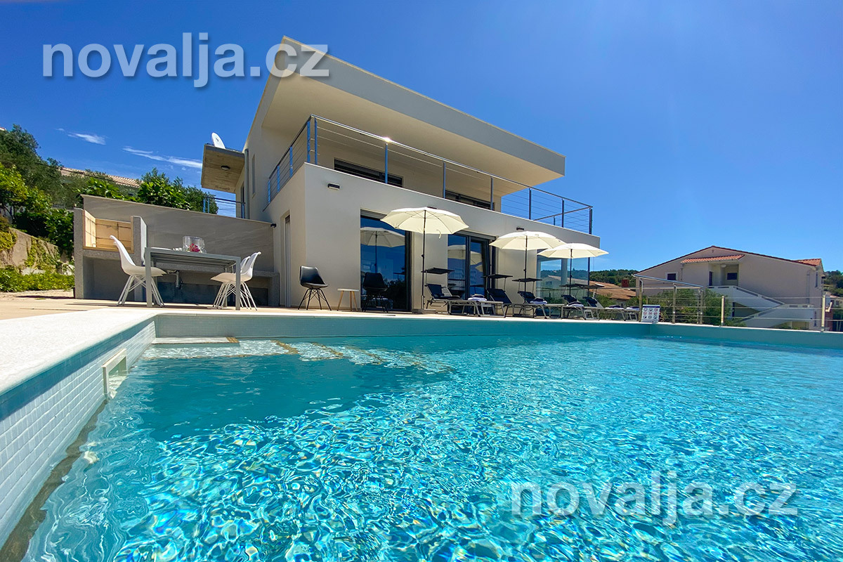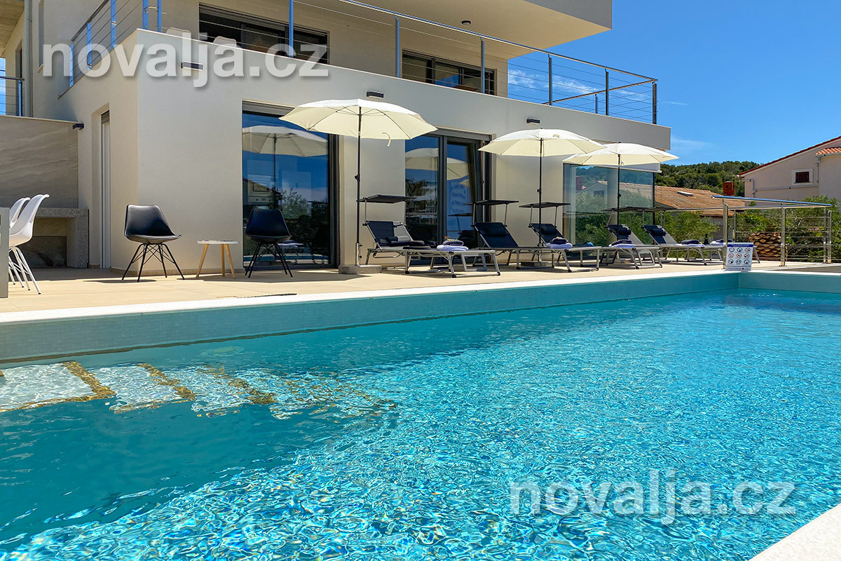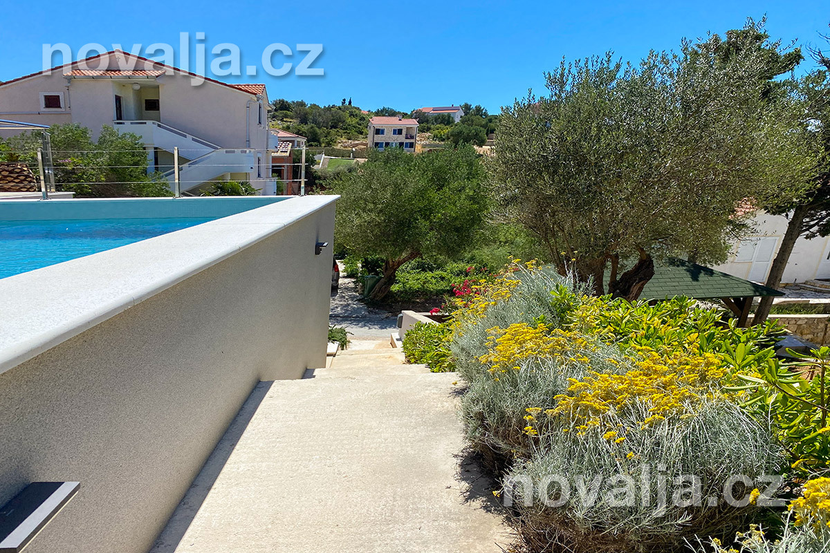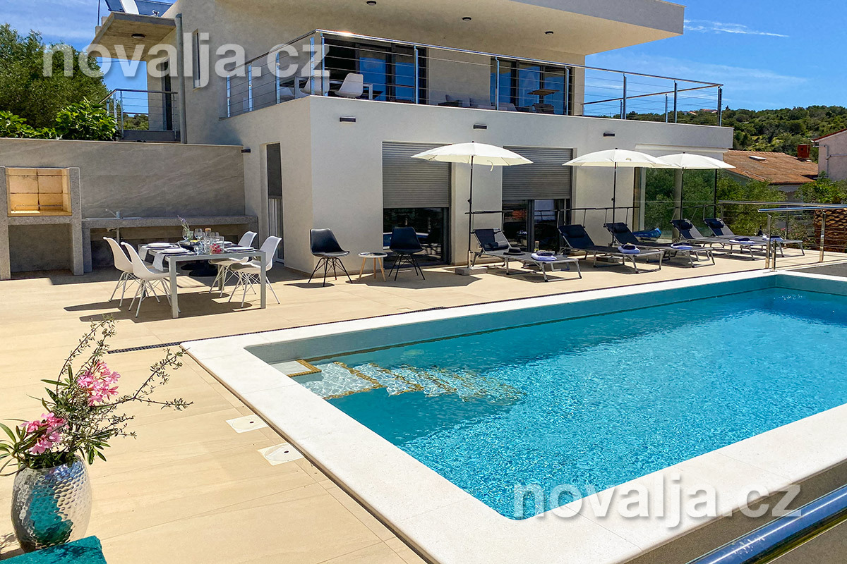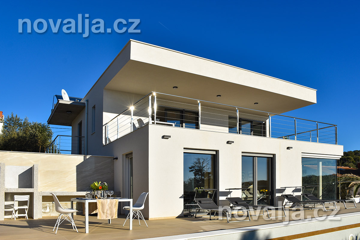 Vila vás zaujme hneď na prvý pohľad – je svetlá, moderne zariadená, s krásnym vyhrievaným bazénom a priestrannými terasami s lehátkami a výhľadom na more. K dispozícii je aj sauna a pri bazéne letná kuchyňa a gril. Krásna kamienková pláž sa nachádza len 80 m od domu.