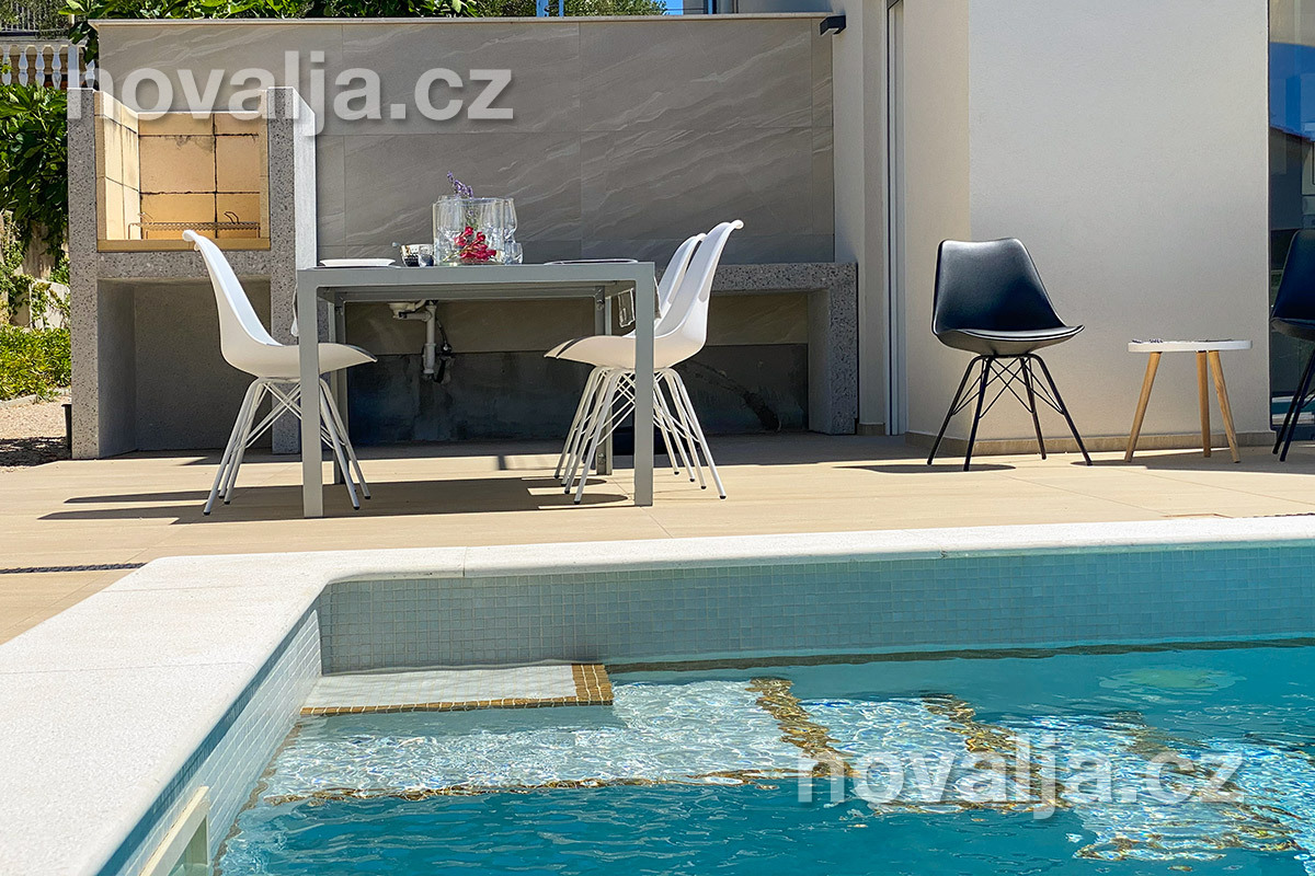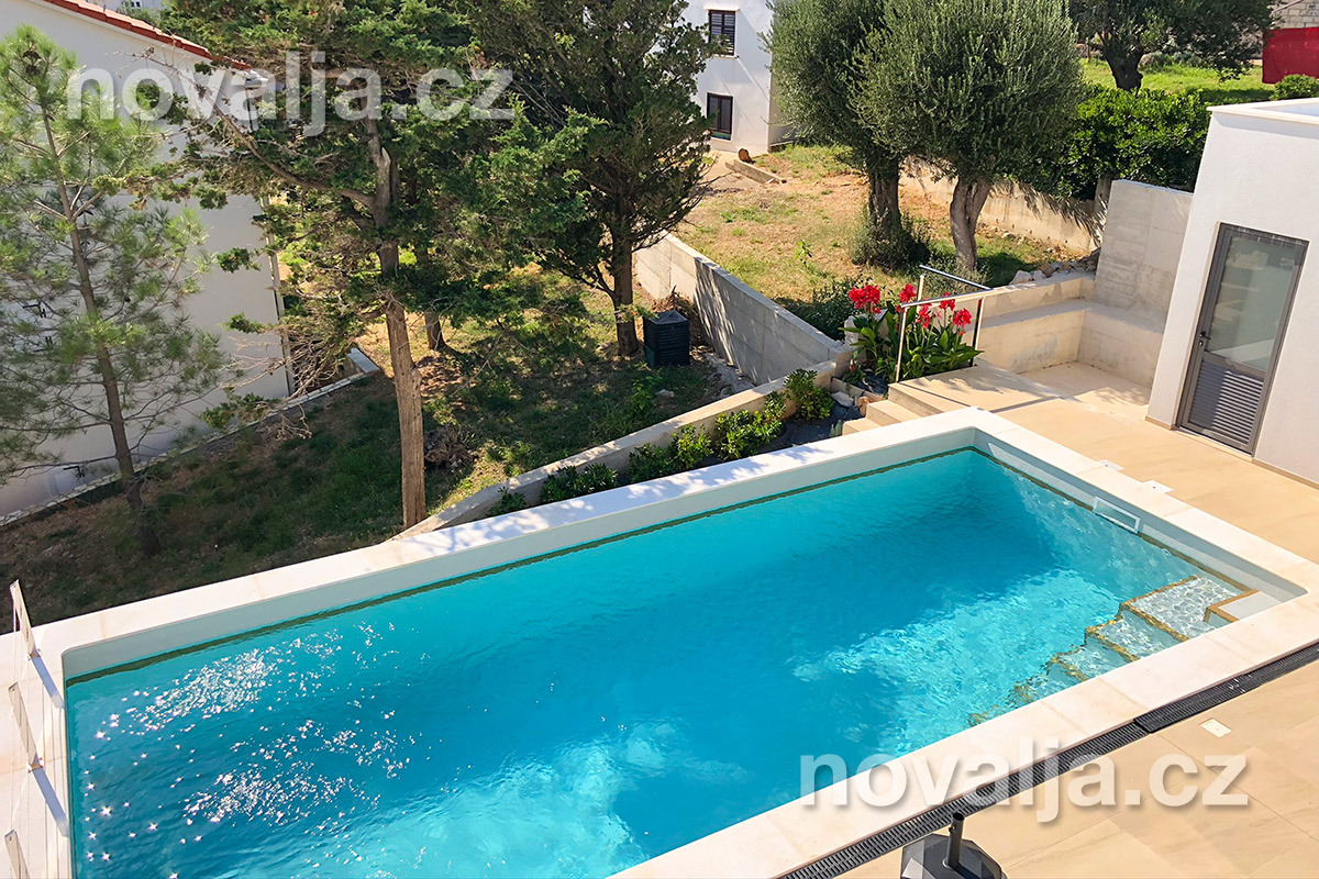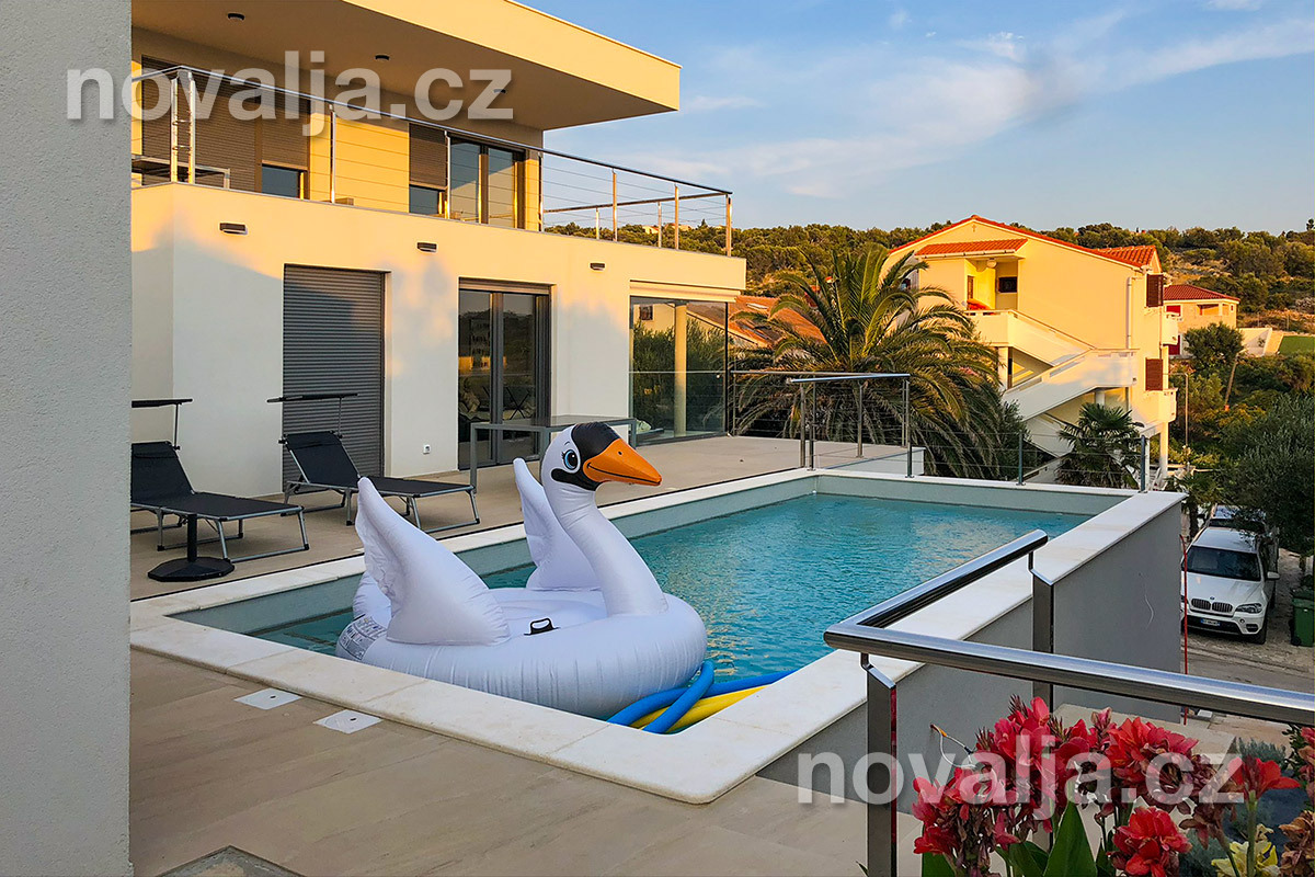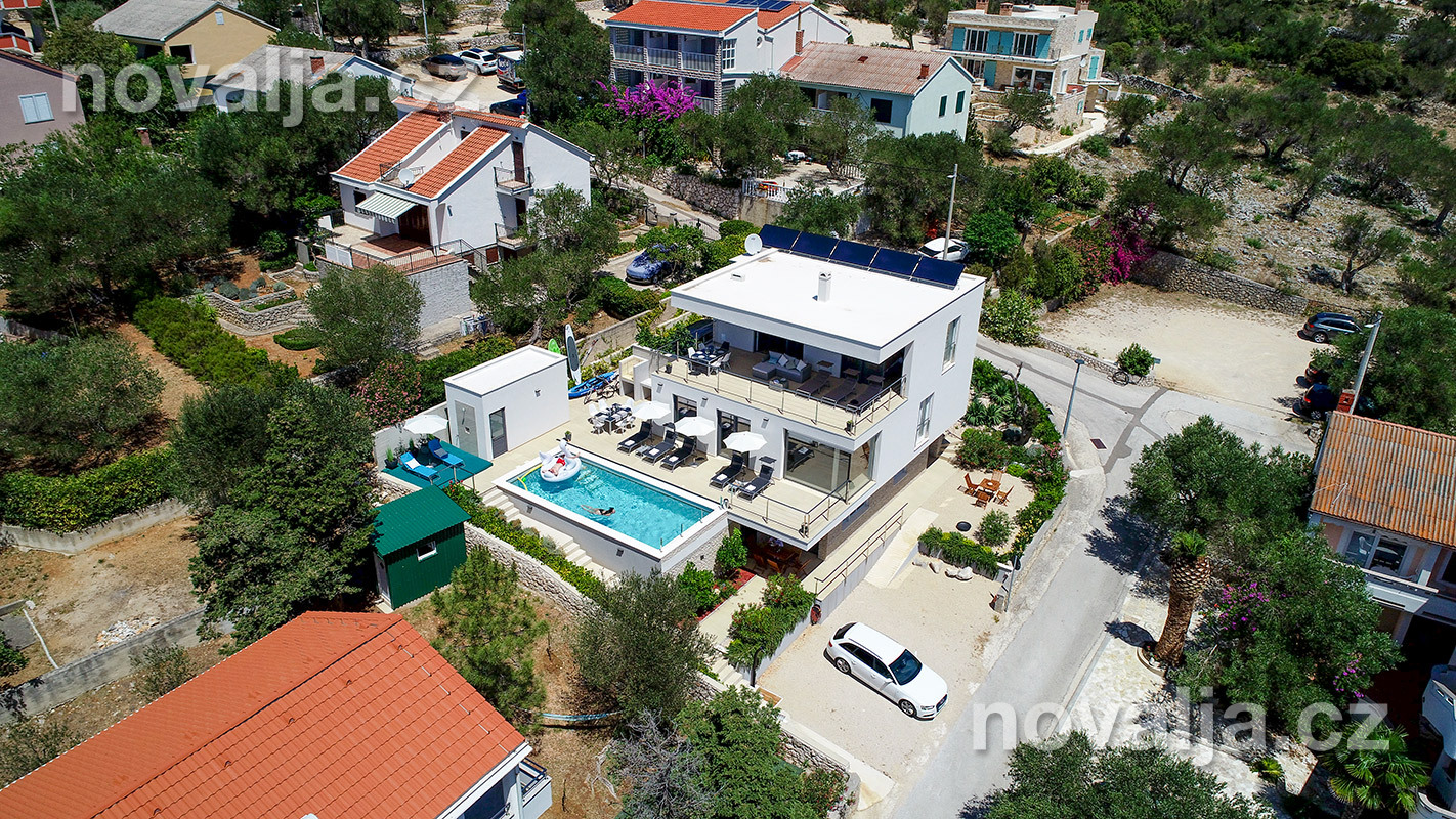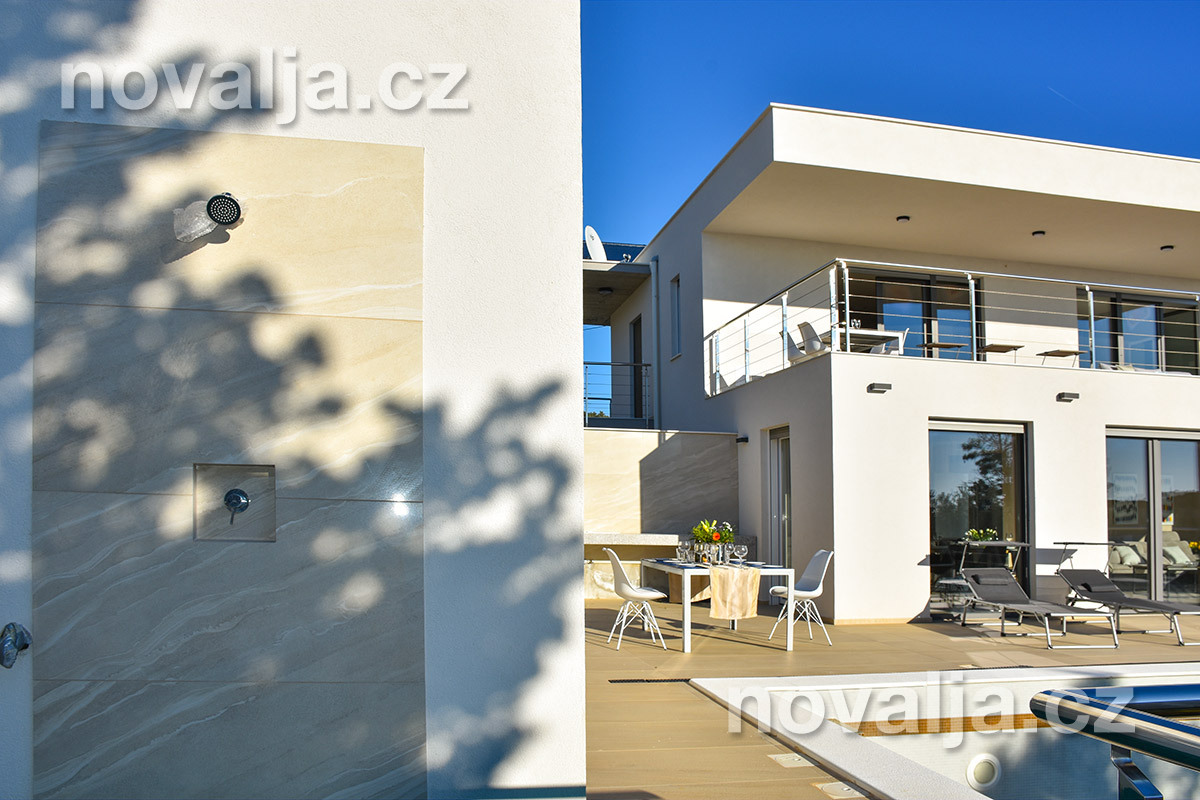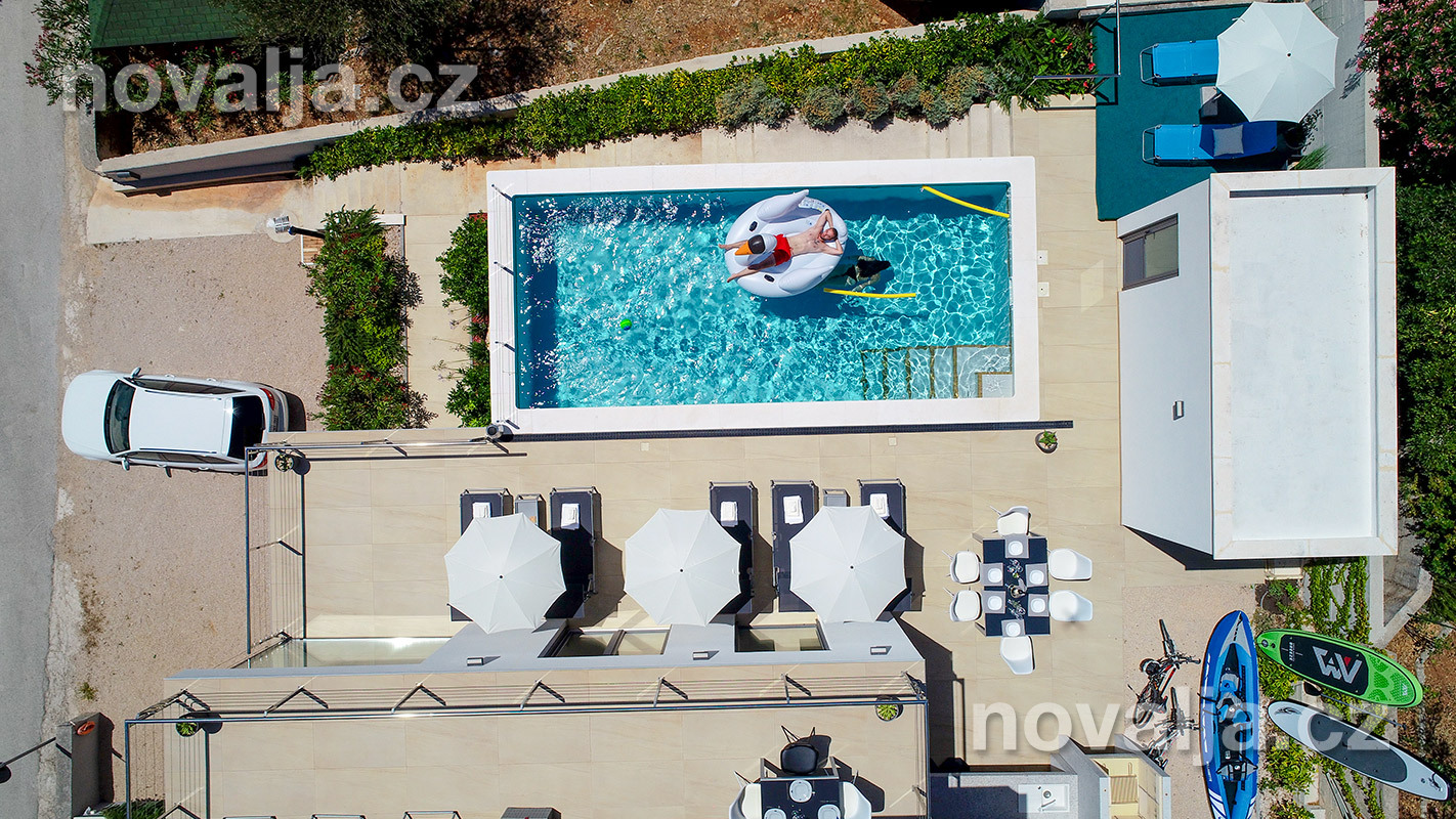 Vila vás zaujme hneď na prvý pohľad – je svetlá, moderne zariadená, s krásnym vyhrievaným bazénom a priestrannými terasami s lehátkami a výhľadom na more. K dispozícii je aj sauna a pri bazéne letná kuchyňa a gril. Krásna kamienková pláž sa nachádza len 80 m od domu.