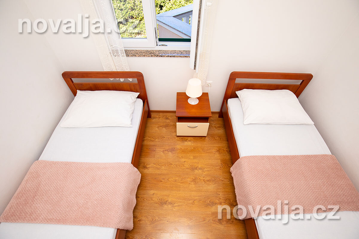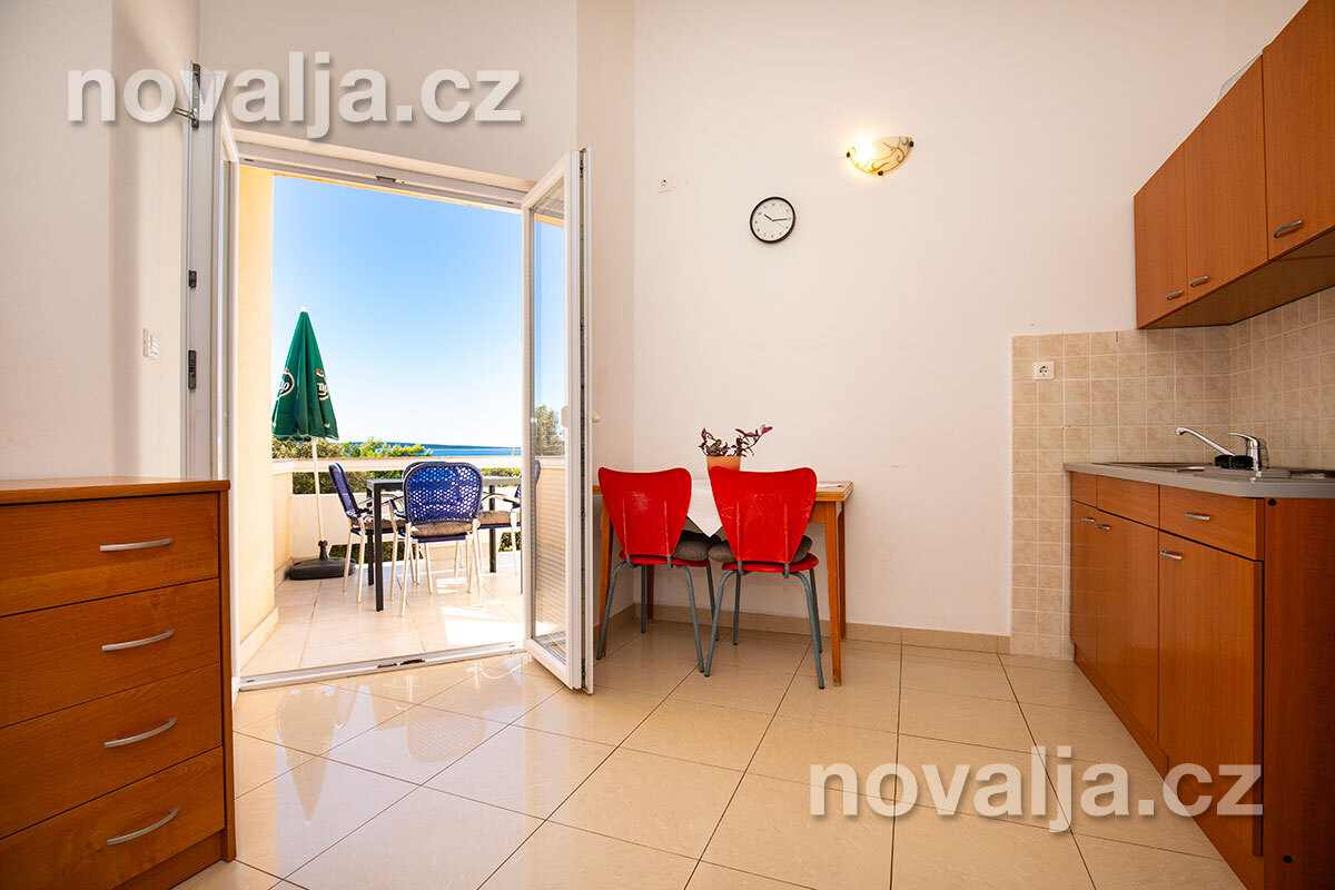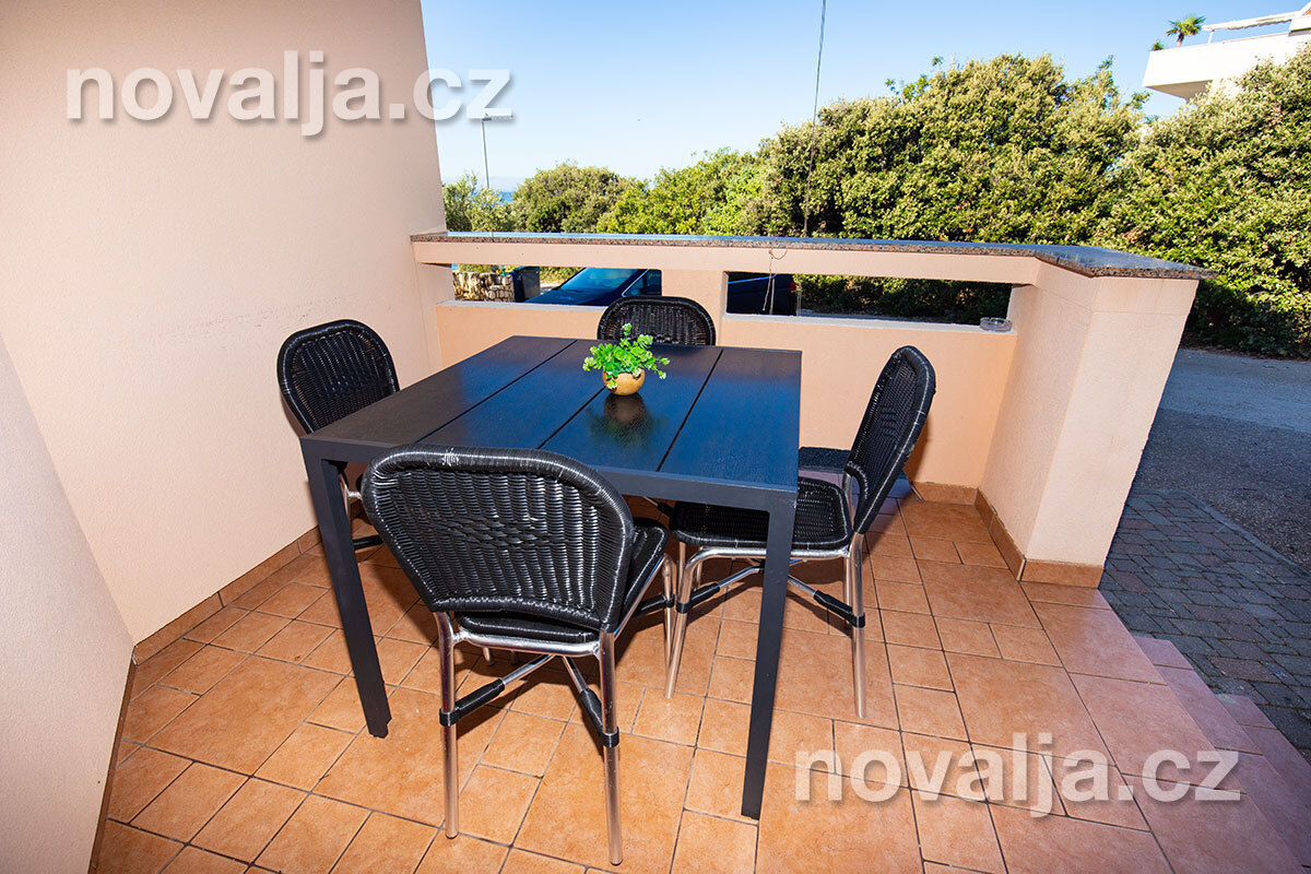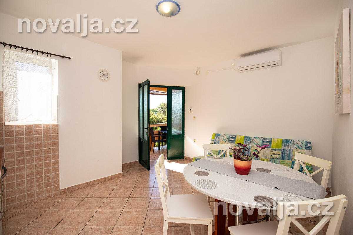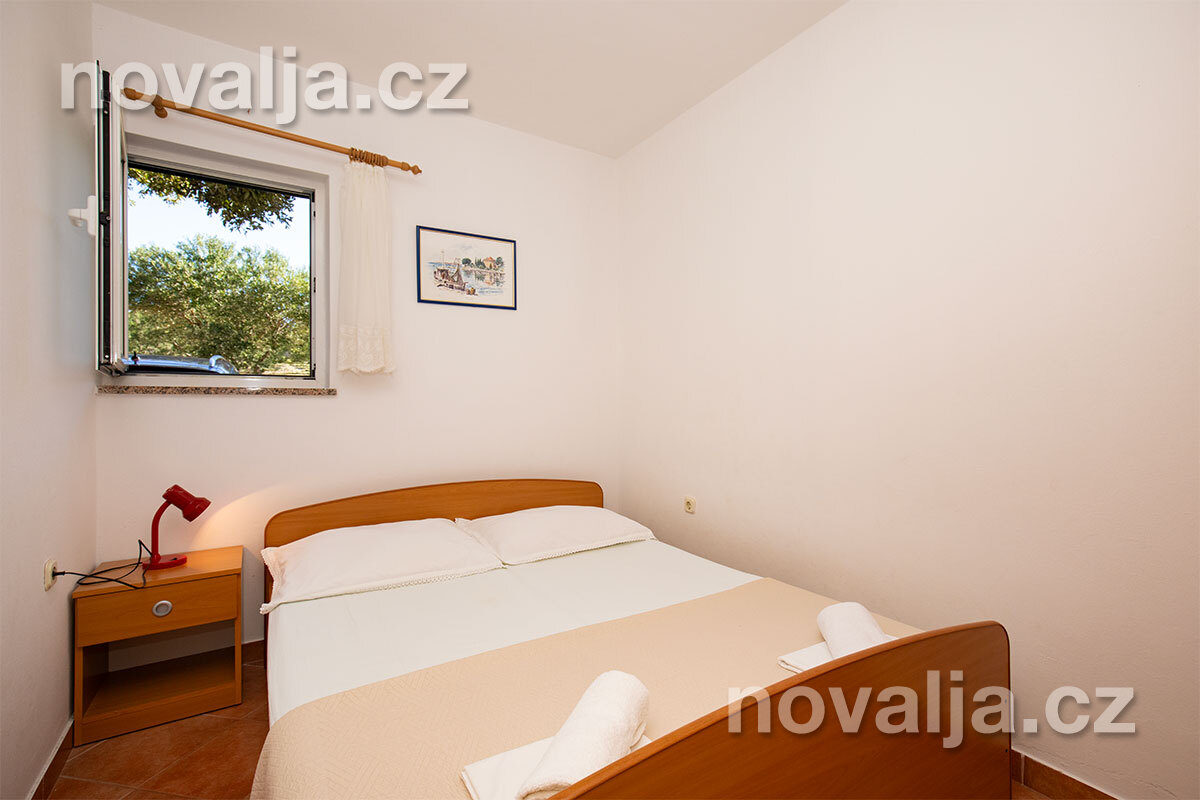 2 spálne s dvoma lôžkami, vybavená kuchyňa (chladnička, mraznička, rúra, umývačka, varná kanvica) s rozkladacím gaučom (195 x 120 cm) pre 1 osobu, sociálne zariadenie so sprchovacím kútom a WC, terasa s čiastočným výhľadom na more. Klimatizácia v kuchyni (v cene).