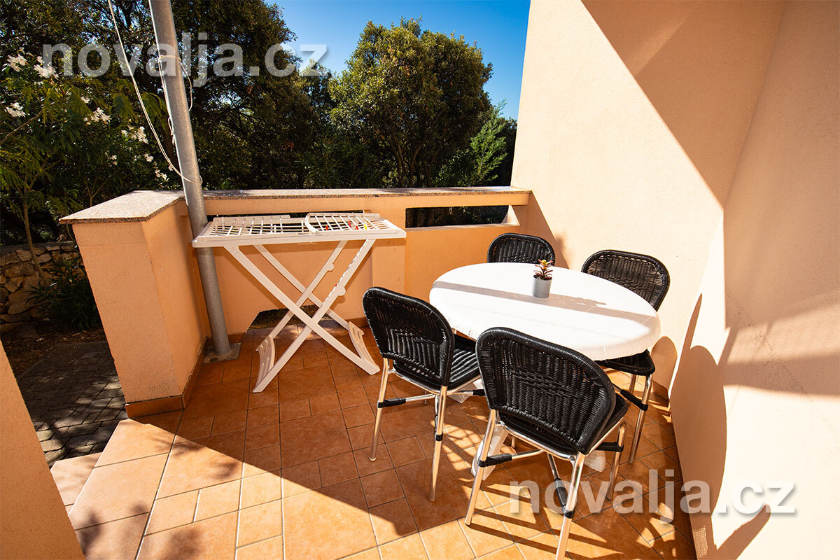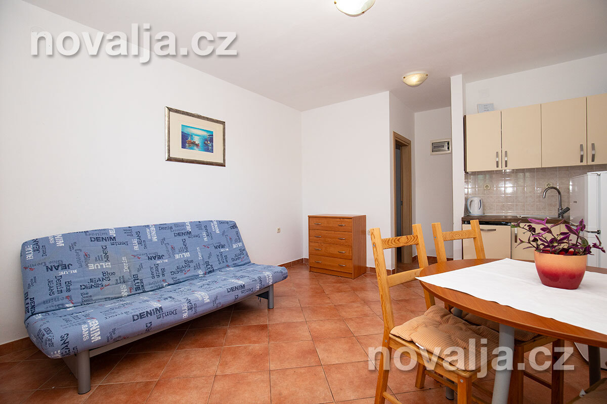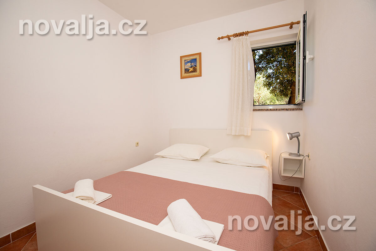 1 ložnice se dvěma lůžky, vybavená kuchyň (lednička, mrazák, varná konvice, toaster) s rozkládacím gaučem (190 x 125 cm) pro 1–2 osoby (buď 2 děti do 12 let, nebo jen 1 osoba starší 12 let), sociální zařízení se sprchovým koutem a WC, terasa s výhledem na moře, slunečník na terase. Klimatizace v kuchyni (v ceně).
