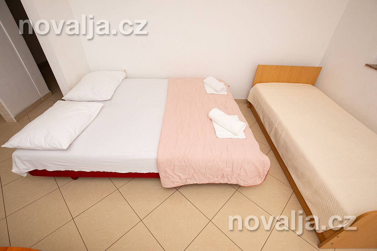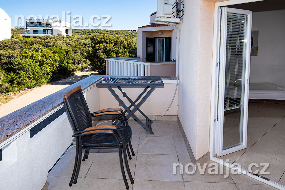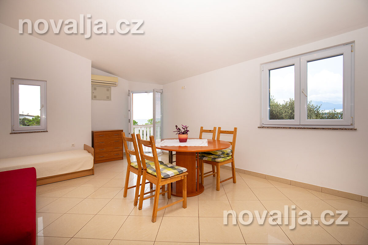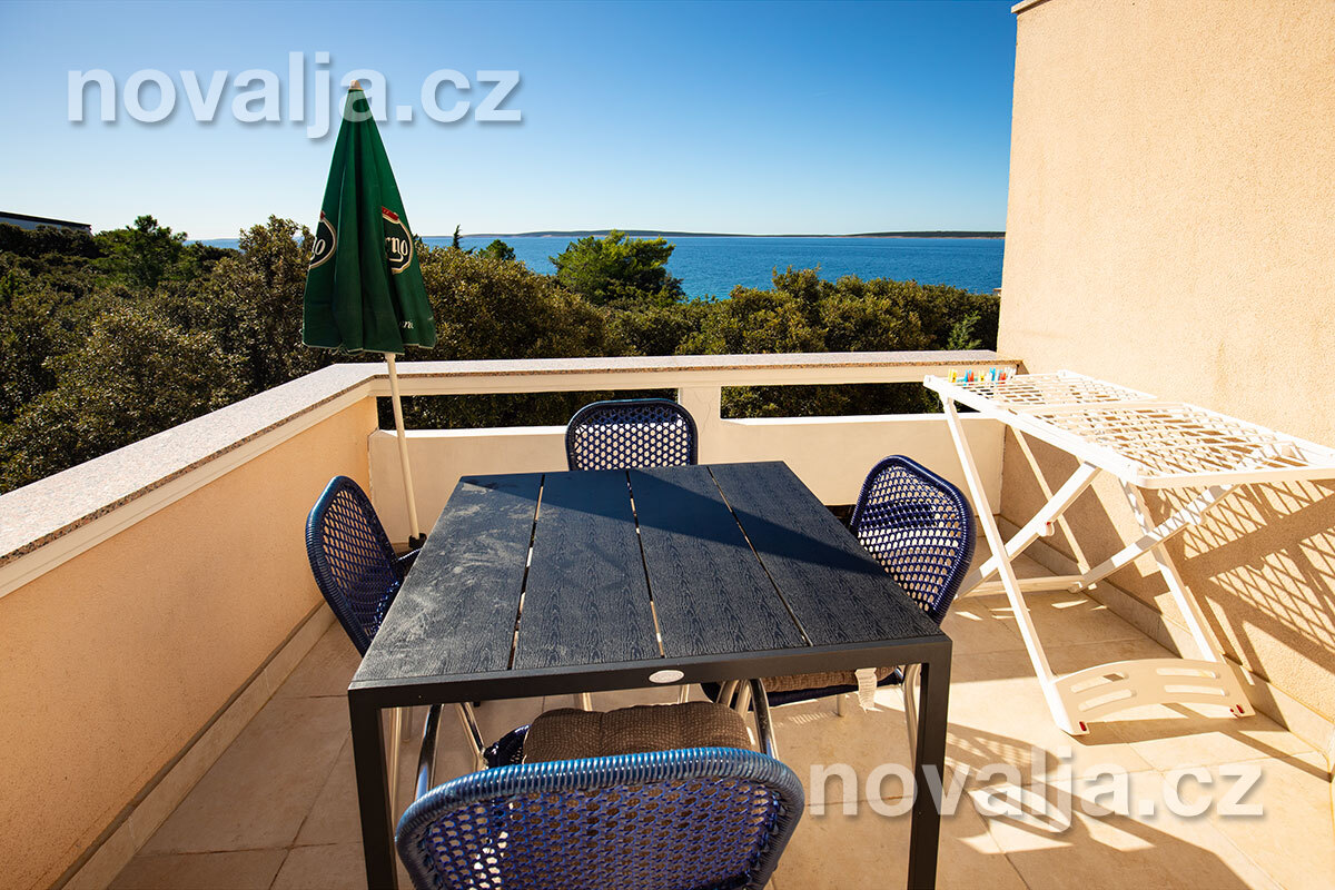 1 ložnice se dvěma lůžky, vybavená kuchyň (lednička, mrazák, varná konvice, toaster) s rozkládacím gaučem (190 x 125 cm) pro 1–2 osoby (buď 2 děti do 12 let, nebo jen 1 osoba starší 12 let), sociální zařízení se sprchovým koutem a WC, terasa s výhledem na moře, slunečník na terase. Klimatizace v kuchyni (v ceně).
