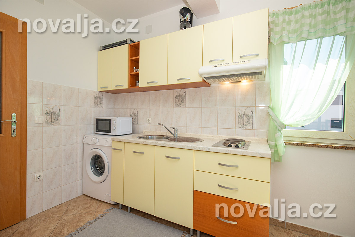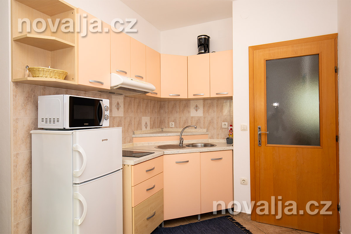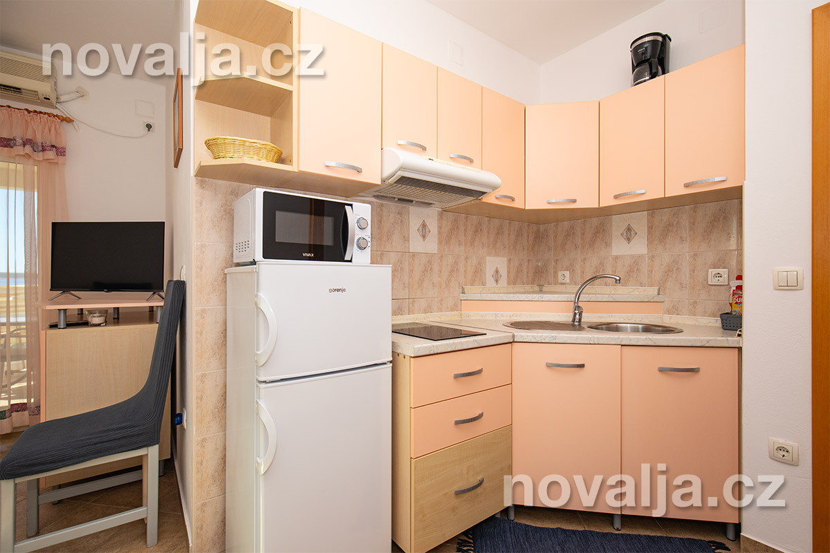 1 spálňa s dvoma lôžkami, vybavená kuchyňa (chladnička, mraznička, mikrovlnná rúra, varná kanvica, toaster, kávovar) s rozkladacím gaučom pre 1 osobu, LCD TV+SAT, socilání zariadenie so sprchovacím kútom a WC, práčka, balkón s výhľadom na more, prenosný gril. Klimatizácia v kuchyni (v cene).