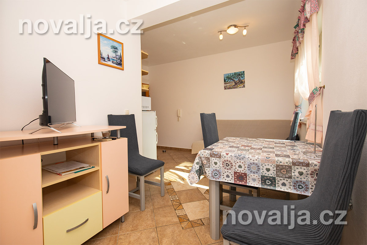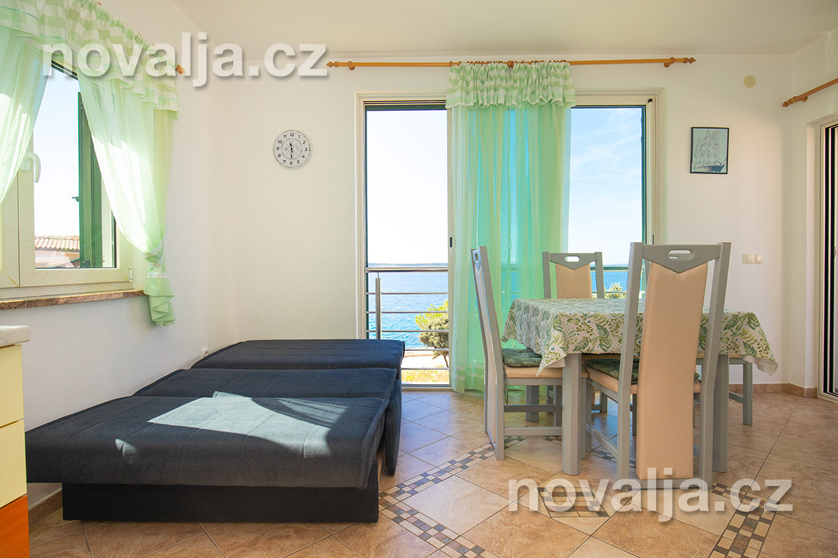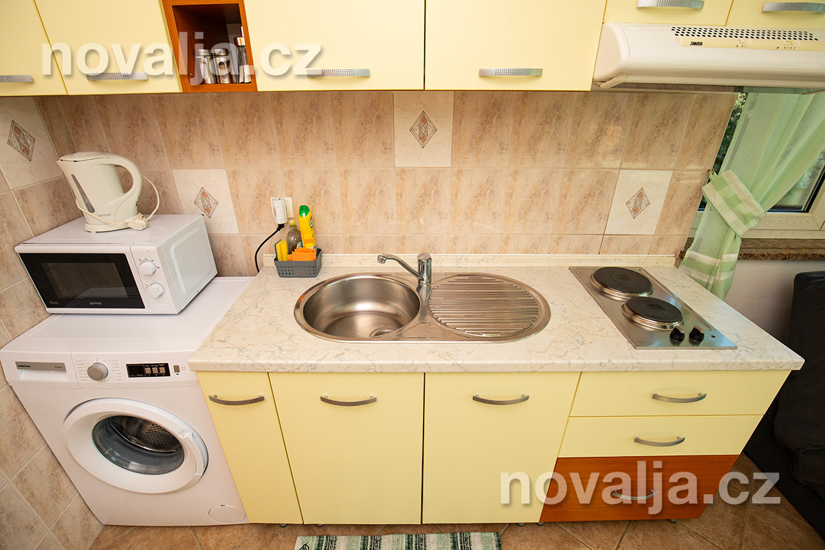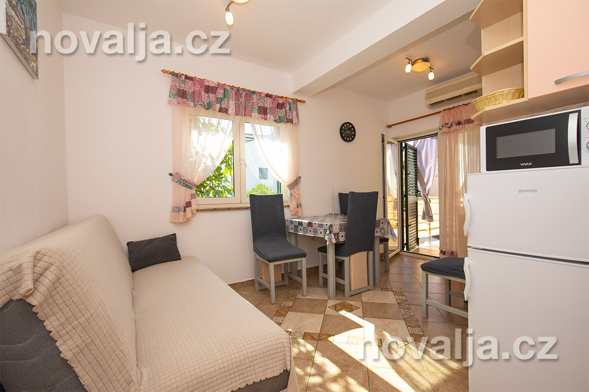 1 spálňa s dvoma lôžkami, vybavená kuchyňa (chladnička, mraznička, mikrovlnná rúra, varná kanvica, toaster, kávovar) s rozkladacím gaučom pre 1 osobu, LCD TV+SAT, socilání zariadenie so sprchovacím kútom a WC, práčka, balkón s výhľadom na more, prenosný gril. Klimatizácia v kuchyni (v cene).