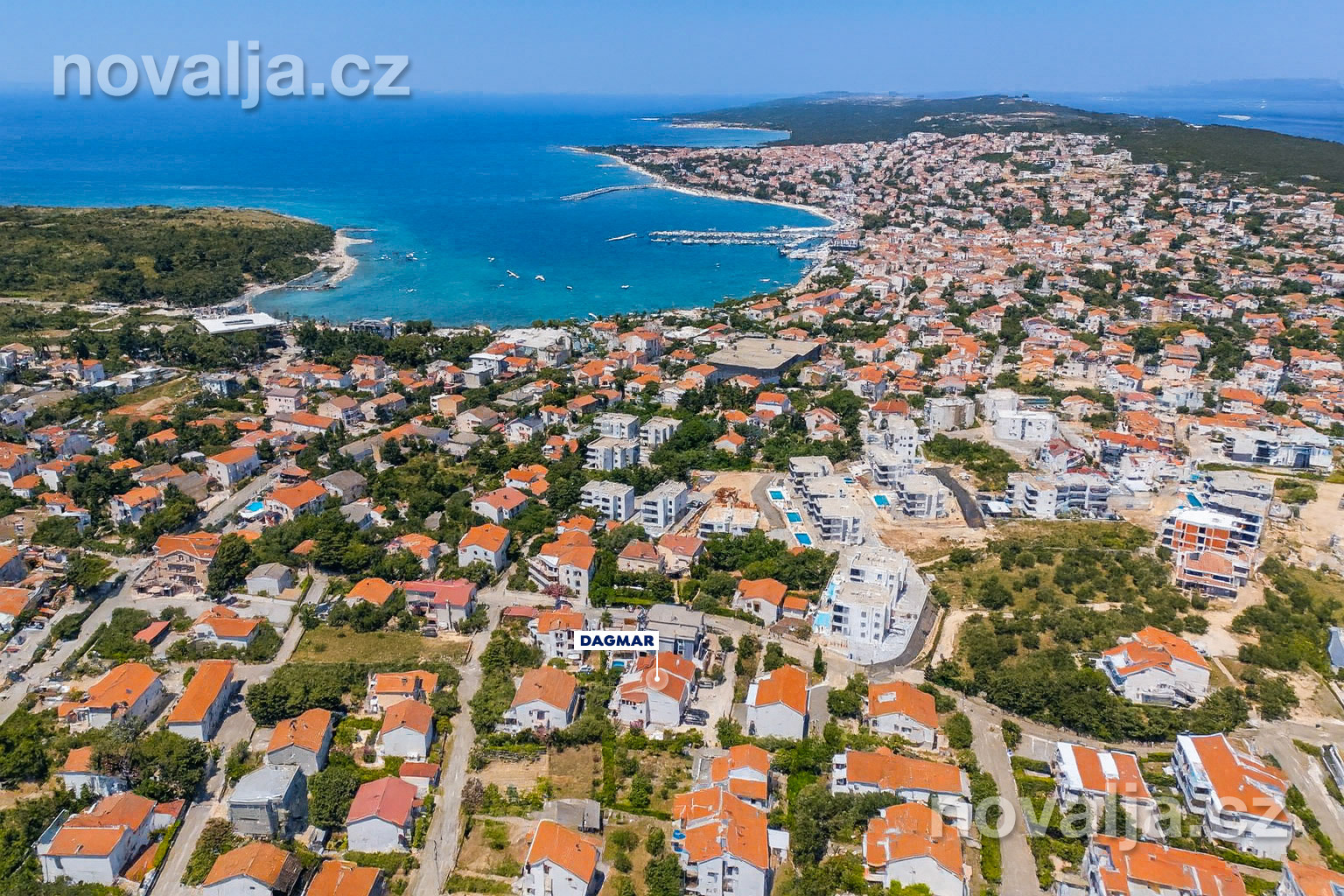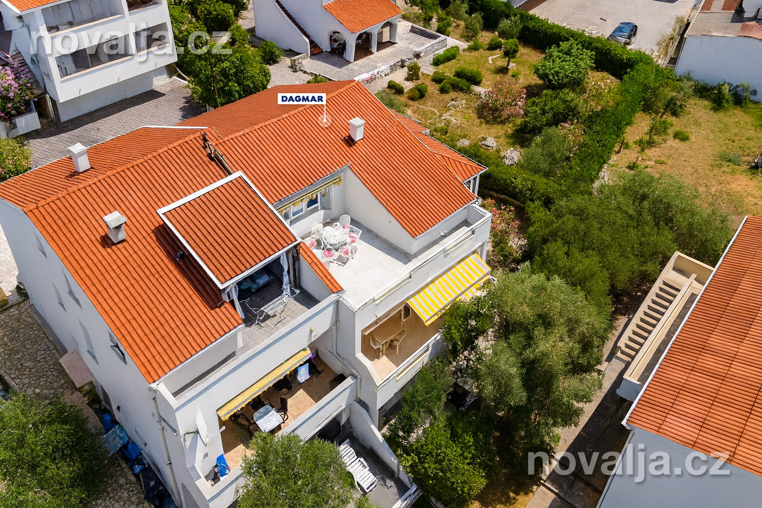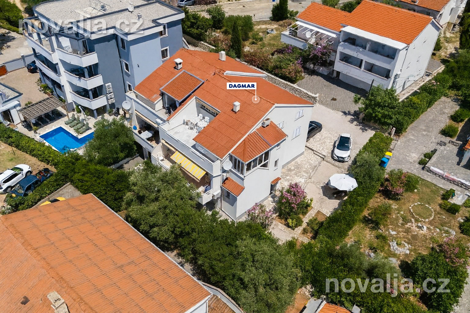 Apartmány Dagmar sa nachádzajú 600 m od centra Novalje. Obchod a reštaurácie sú do 200 m od domu. Najbližšia pláž je vzdialená 850 m - ide o piesočnato-okruhliakovú pláž pri hoteli Liberty. Autom je dostupná piesočná pláž Planjka v Starej Novalji (4,1 km), alebo pláž Babe na severozápadnom konci Novalje (5,1 km).