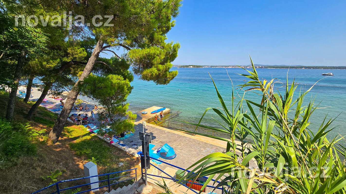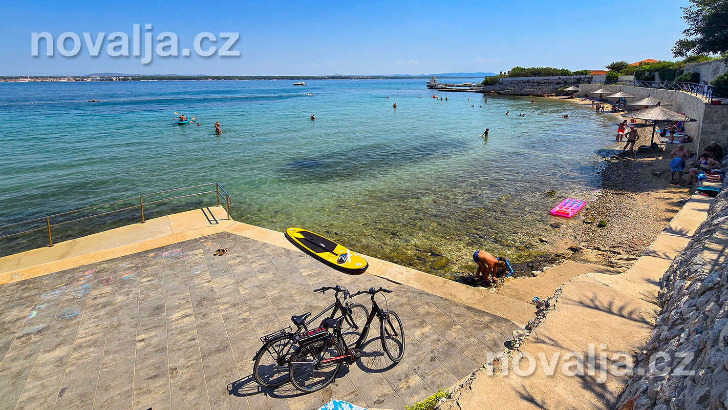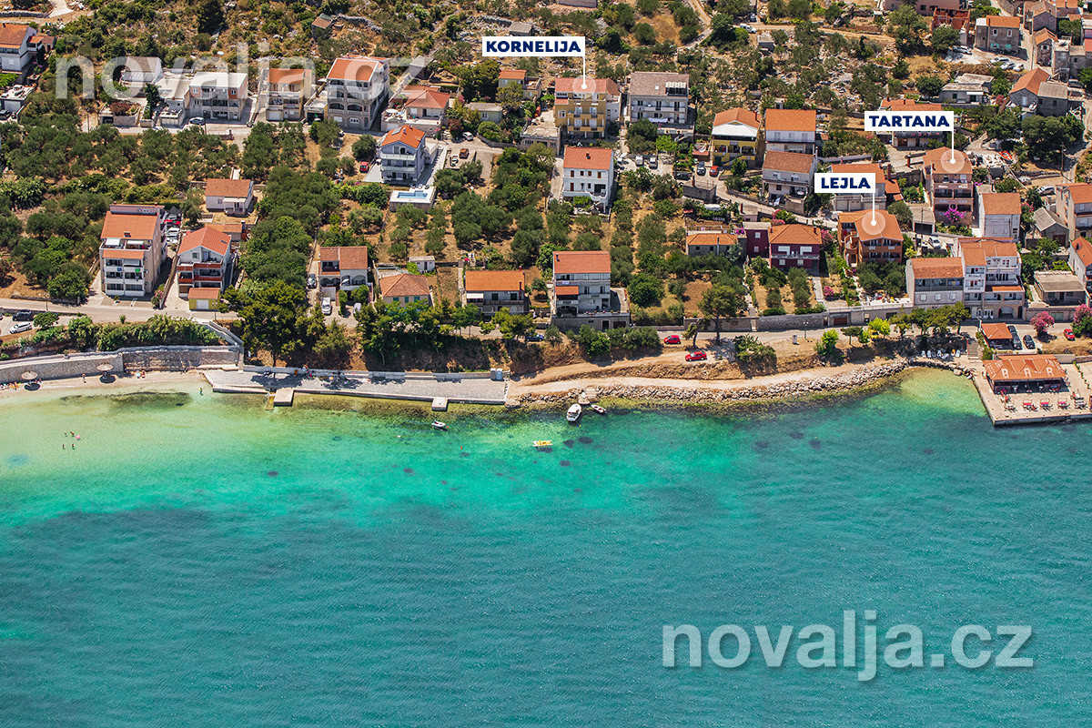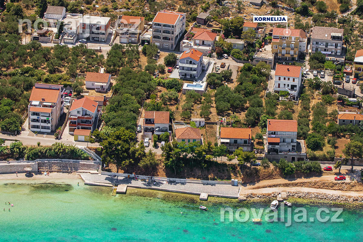 Dom Kornelija s jedným perfektne vybaveným apartmánom pre 6–8 osôb sa nachádza v juhovýchodnej časti mestečka Tkon. Piesočná pláž Južna plaža s pozvoľným vstupom do mora je 250 m od domu (prístup na pláž z jednej strany po schodoch, z druhej strany zjazdný). Plážový bar Ga-Ga je 250 m od domu (smerom do centra), reštaurácia je vzdialená 270 m, obchod 300 m.