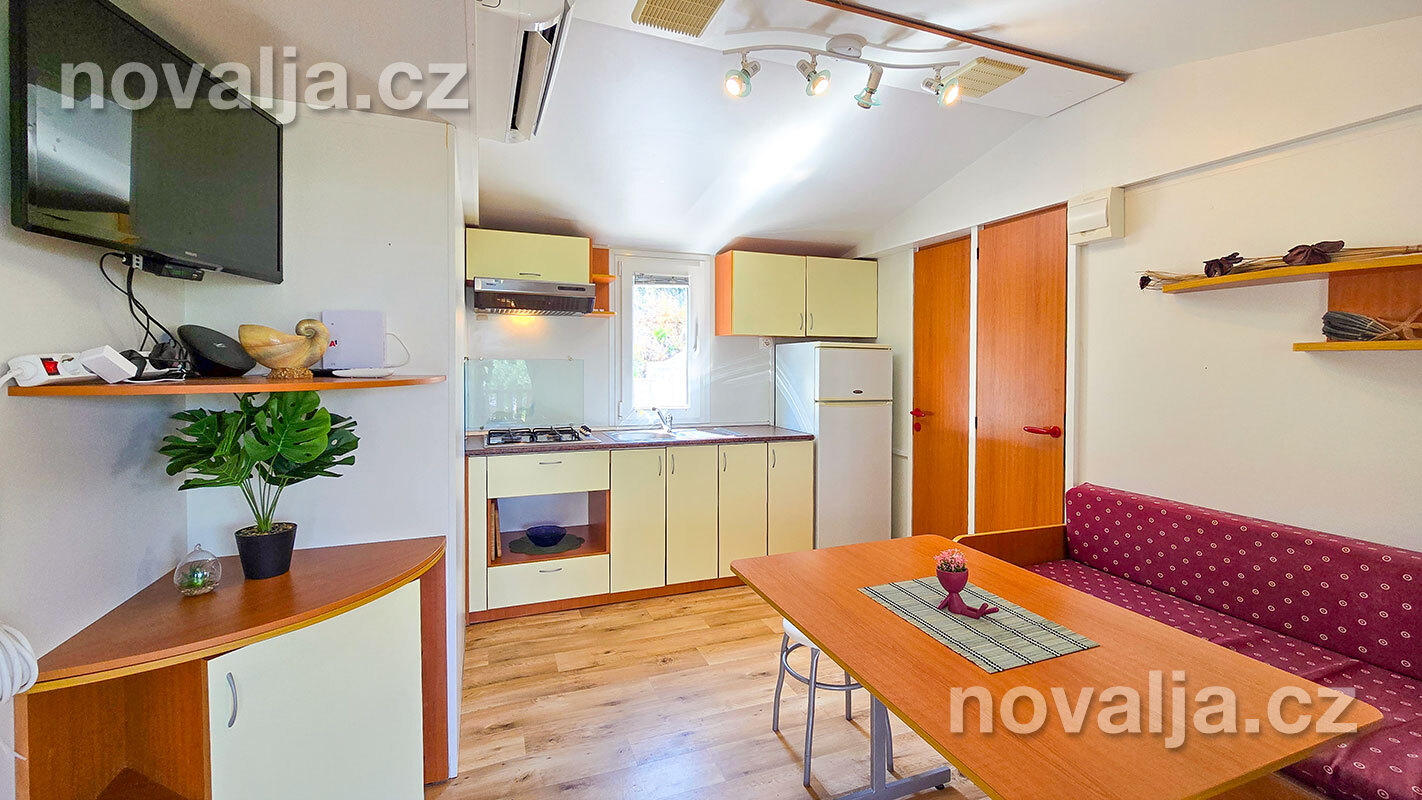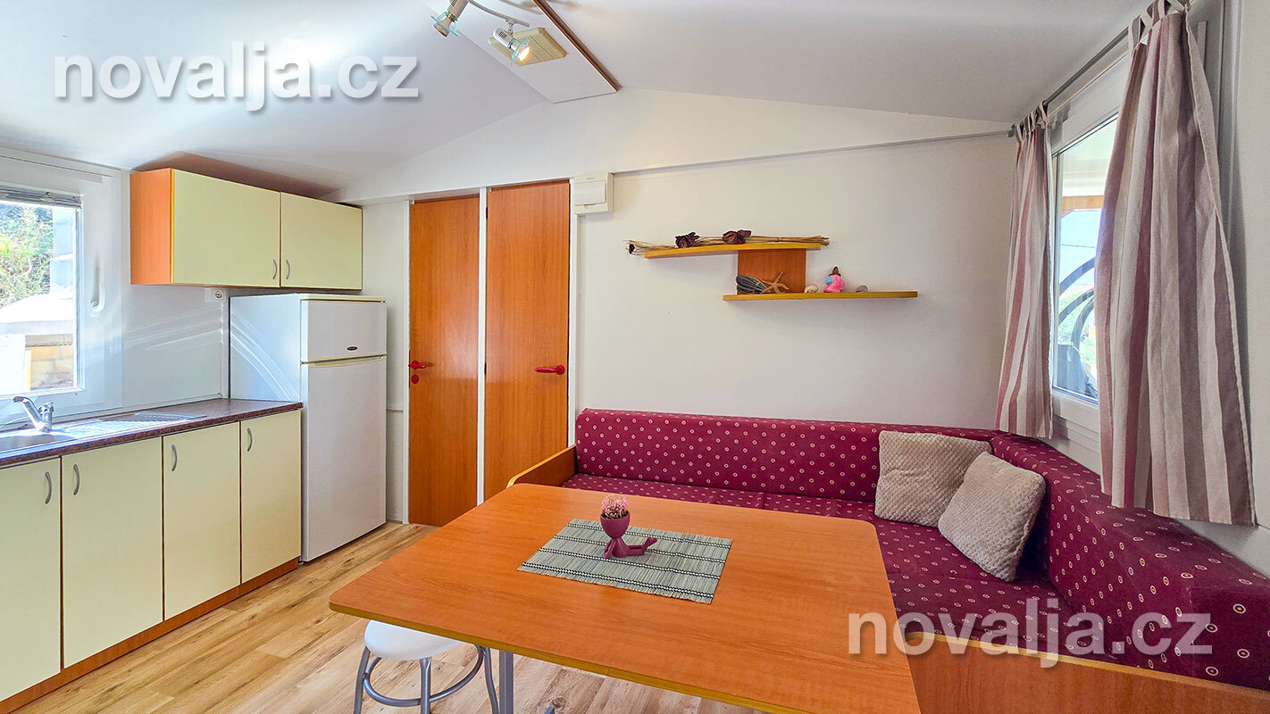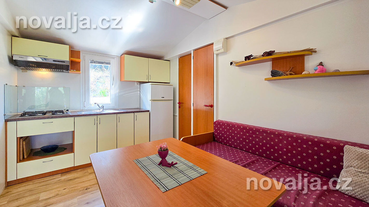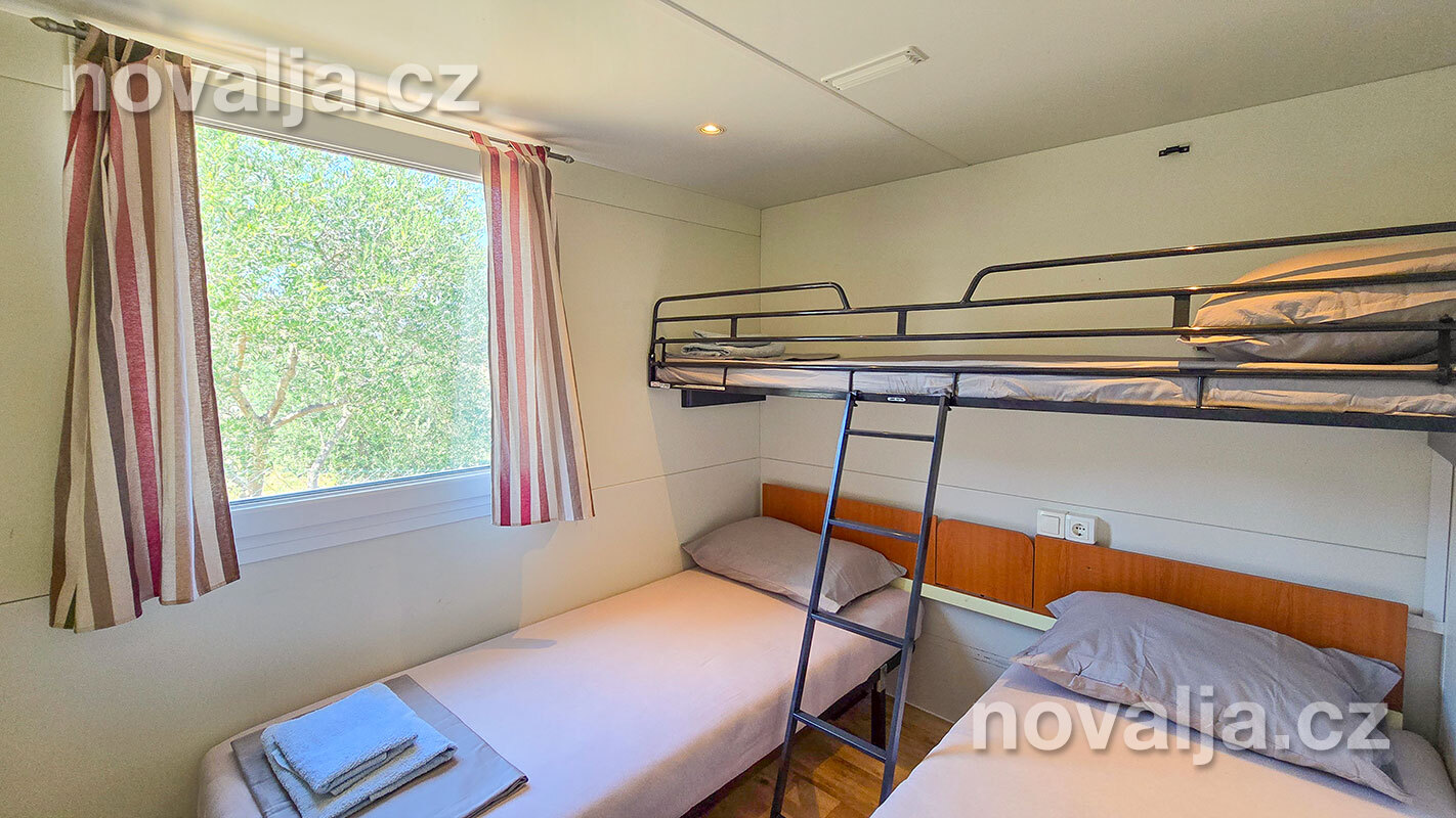 2 spálne - jedna s dvojlôžkom, druhá s tromi lôžkami (tretie lôžko na poschodovej posteli), vybavená kuchyňa (chladnička, mraznička, plynová varná doska), TV, 2x sociálne zariadenie so sprchovacím kútom a WC, priestranná tienená terasa so záhradným nábytkom. Klimatizácia v kuchyni (v cene).
