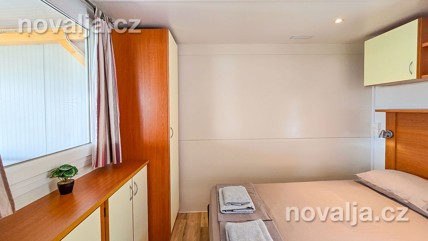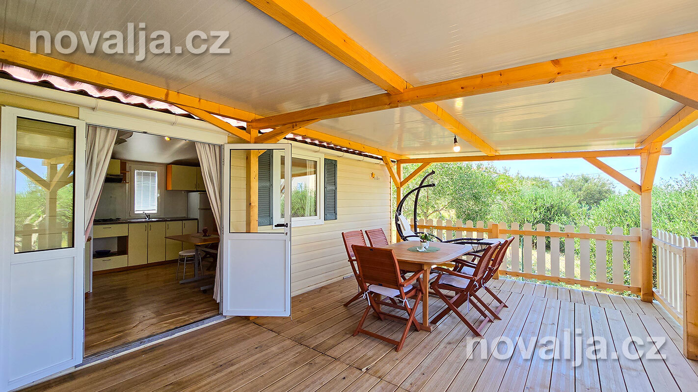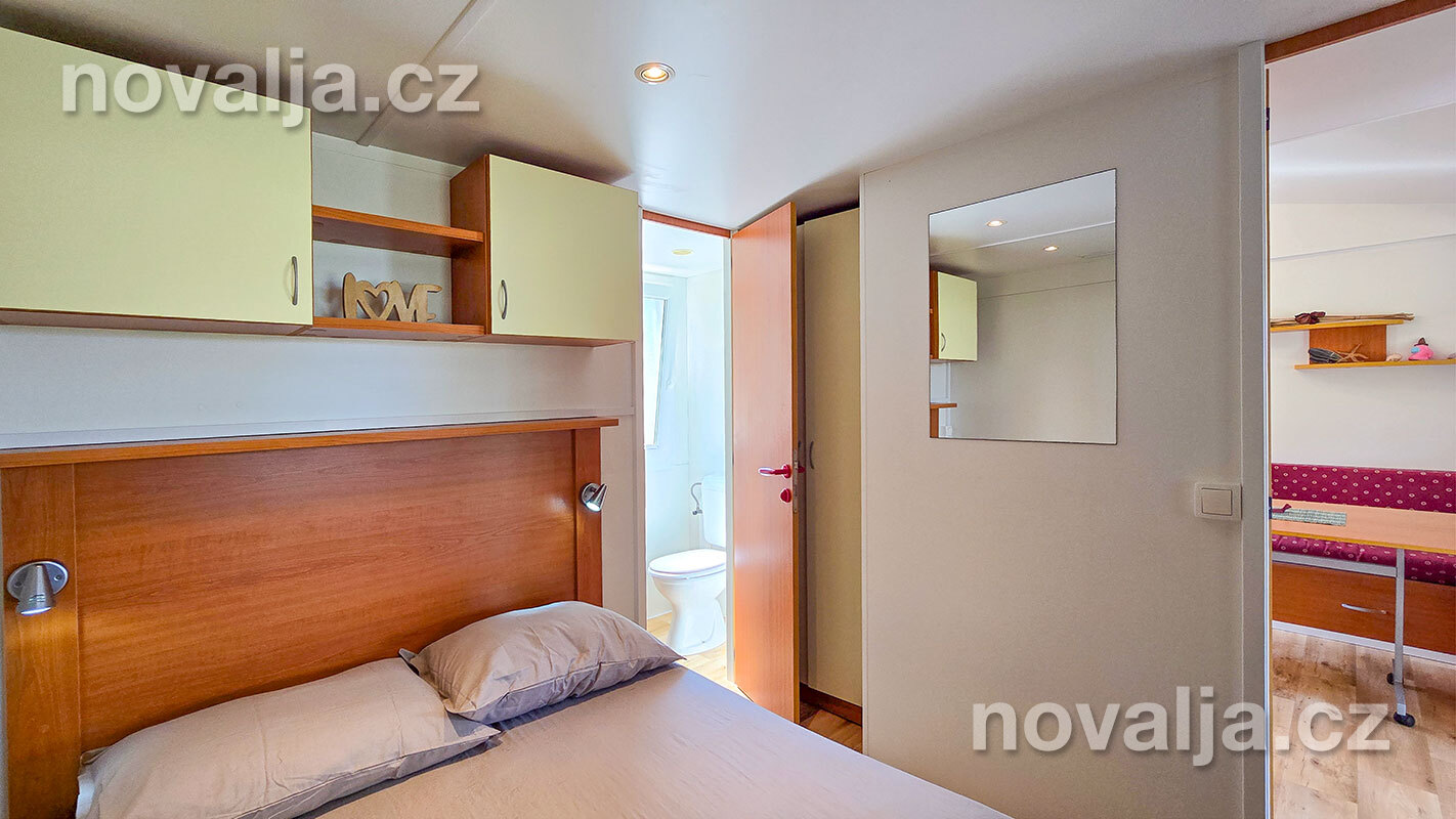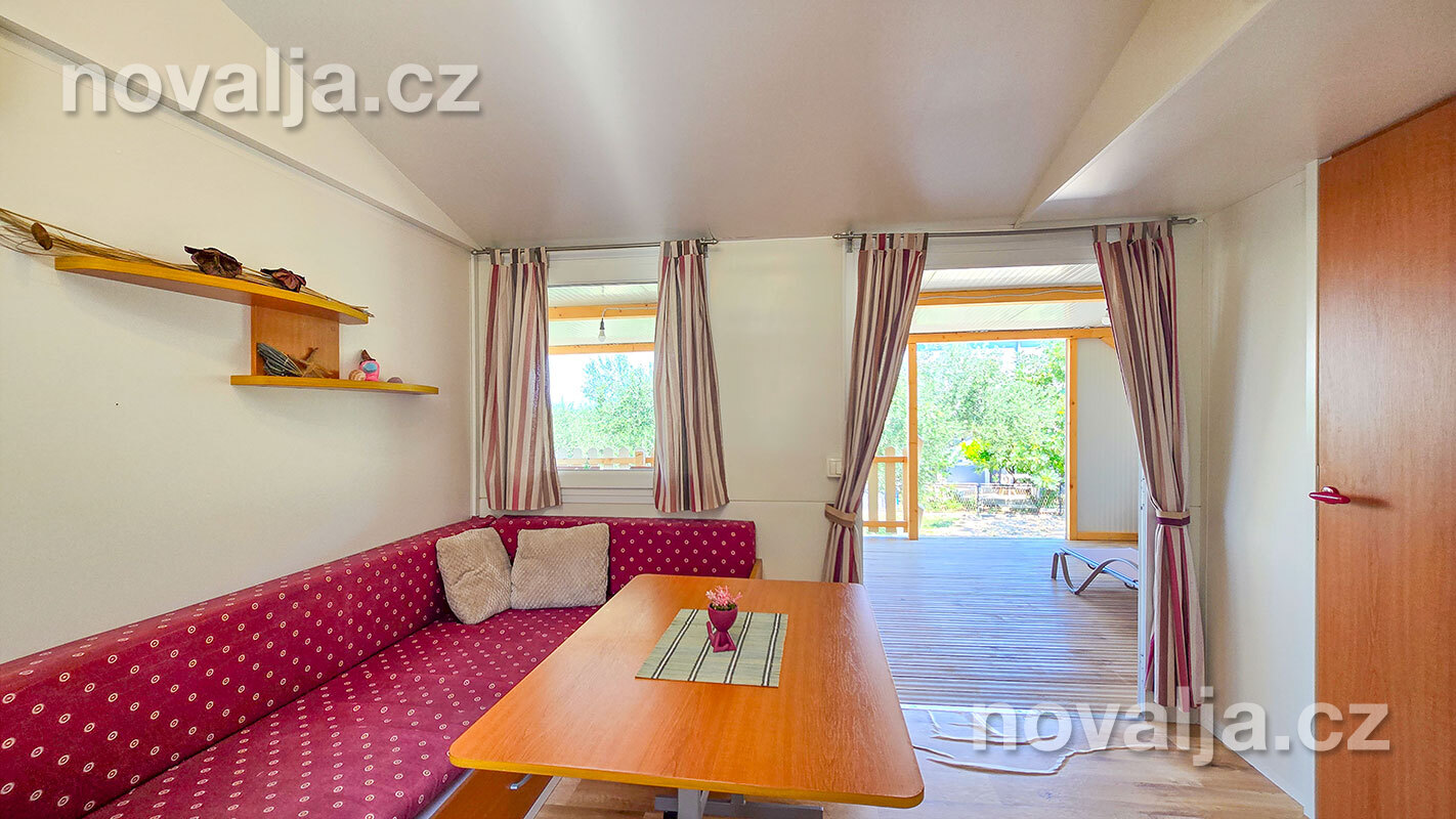 2 spálne - jedna s dvojlôžkom, druhá s tromi lôžkami (tretie lôžko na poschodovej posteli), vybavená kuchyňa (chladnička, mraznička, plynová varná doska), TV, 2x sociálne zariadenie so sprchovacím kútom a WC, priestranná tienená terasa so záhradným nábytkom. Klimatizácia v kuchyni (v cene).