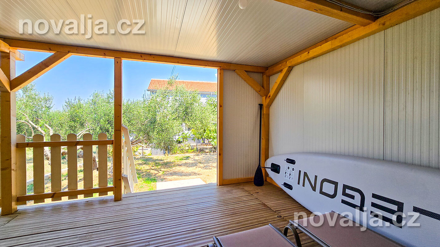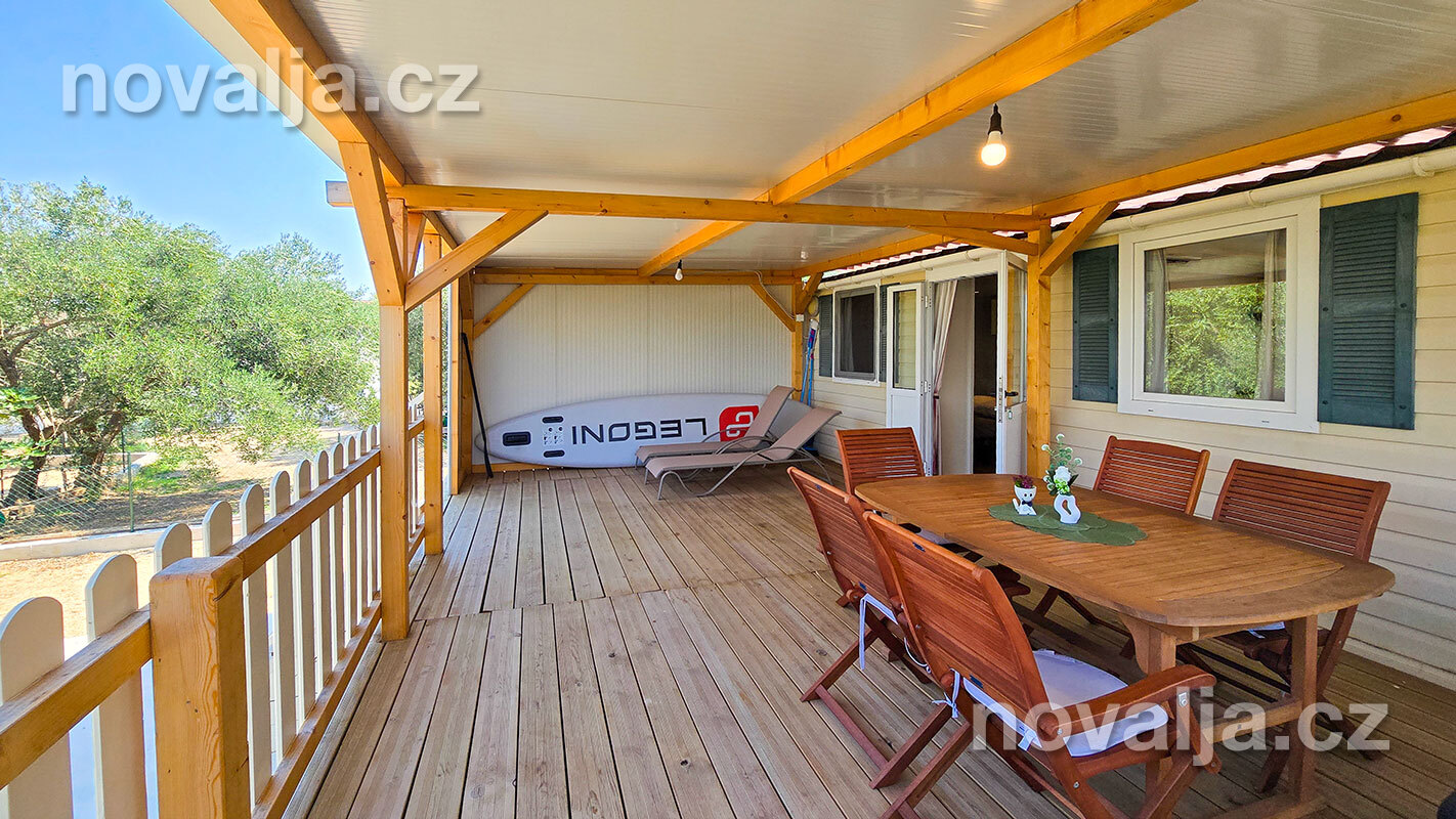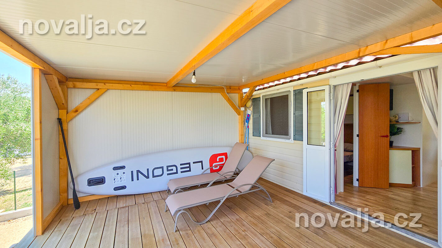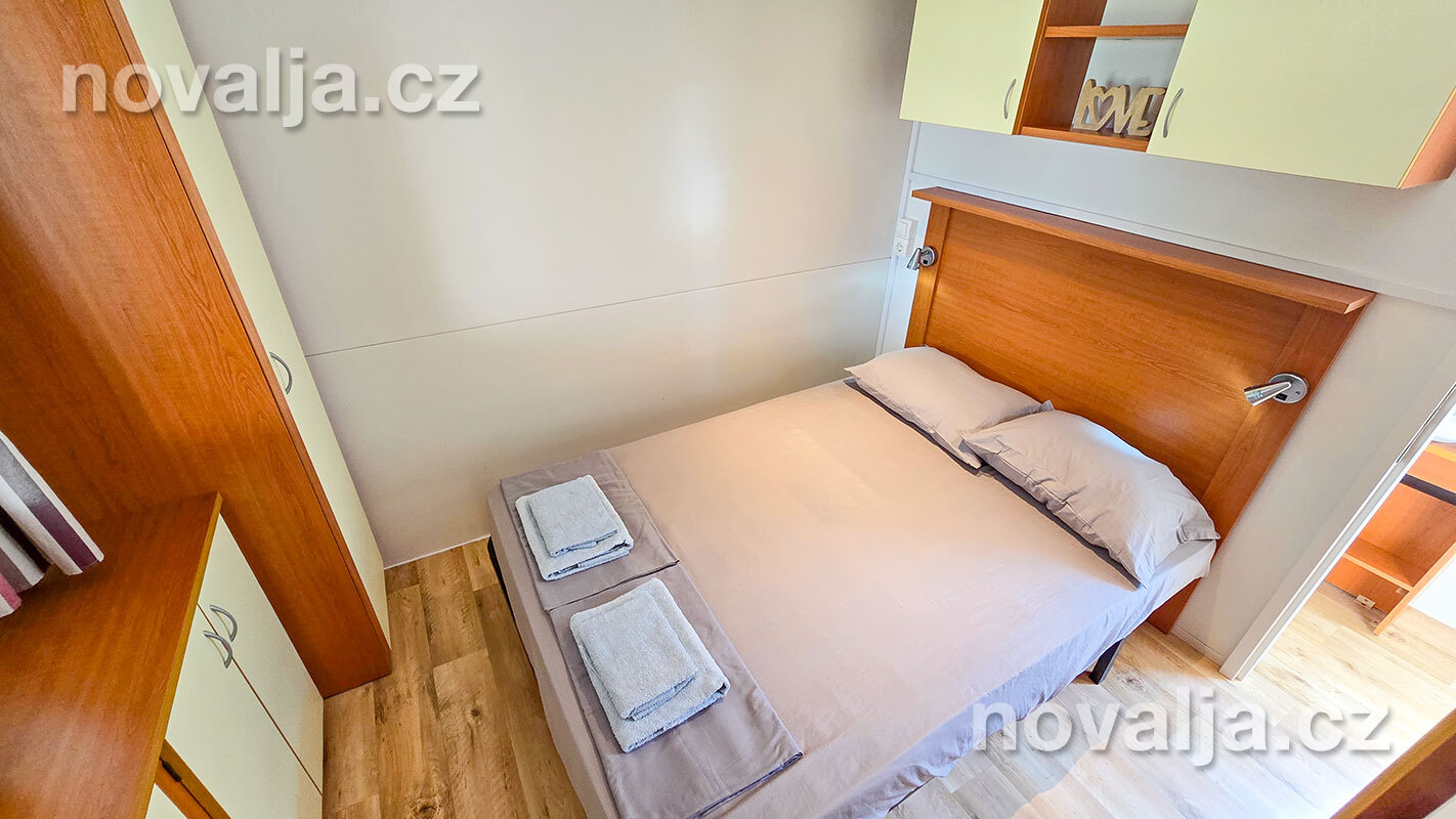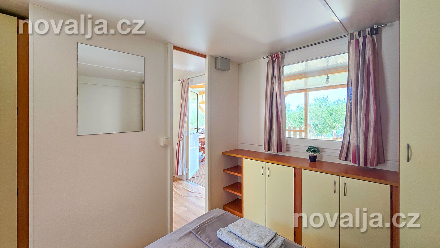 2 spálne - jedna s dvojlôžkom, druhá s tromi lôžkami (tretie lôžko na poschodovej posteli), vybavená kuchyňa (chladnička, mraznička, plynová varná doska), TV, 2x sociálne zariadenie so sprchovacím kútom a WC, priestranná tienená terasa so záhradným nábytkom. Klimatizácia v kuchyni (v cene).