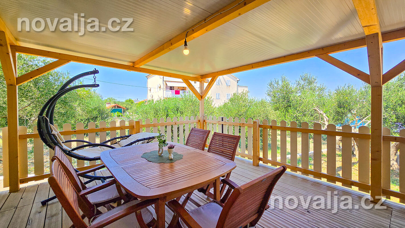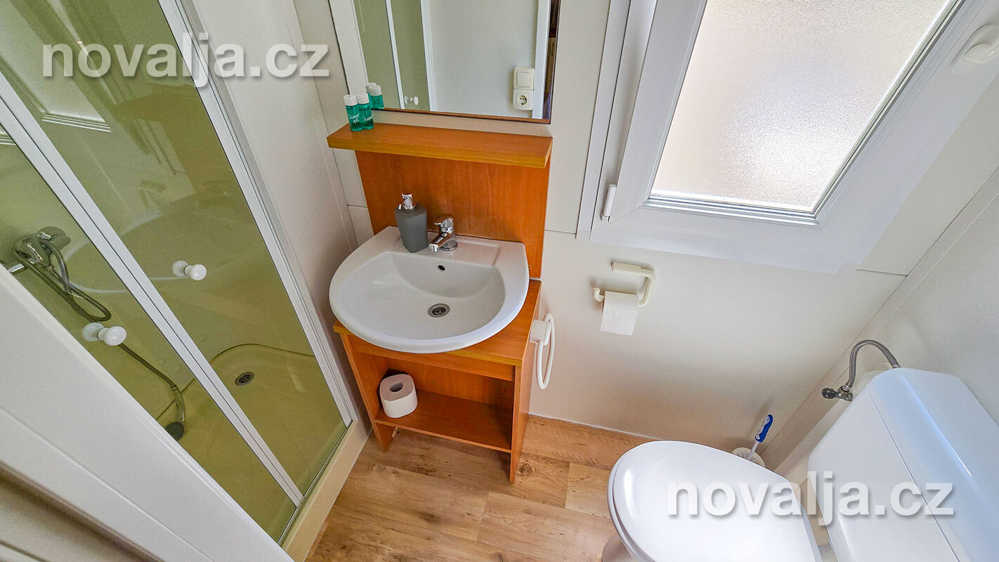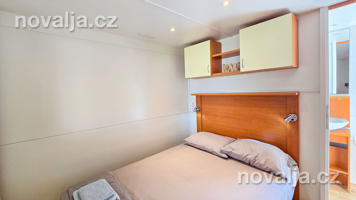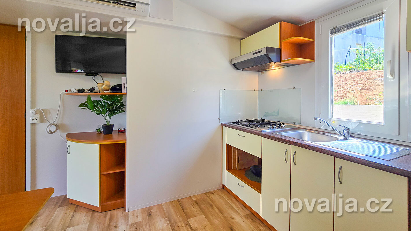 2 spálne - jedna s dvojlôžkom, druhá s tromi lôžkami (tretie lôžko na poschodovej posteli), vybavená kuchyňa (chladnička, mraznička, plynová varná doska), TV, 2x sociálne zariadenie so sprchovacím kútom a WC, priestranná tienená terasa so záhradným nábytkom. Klimatizácia v kuchyni (v cene).