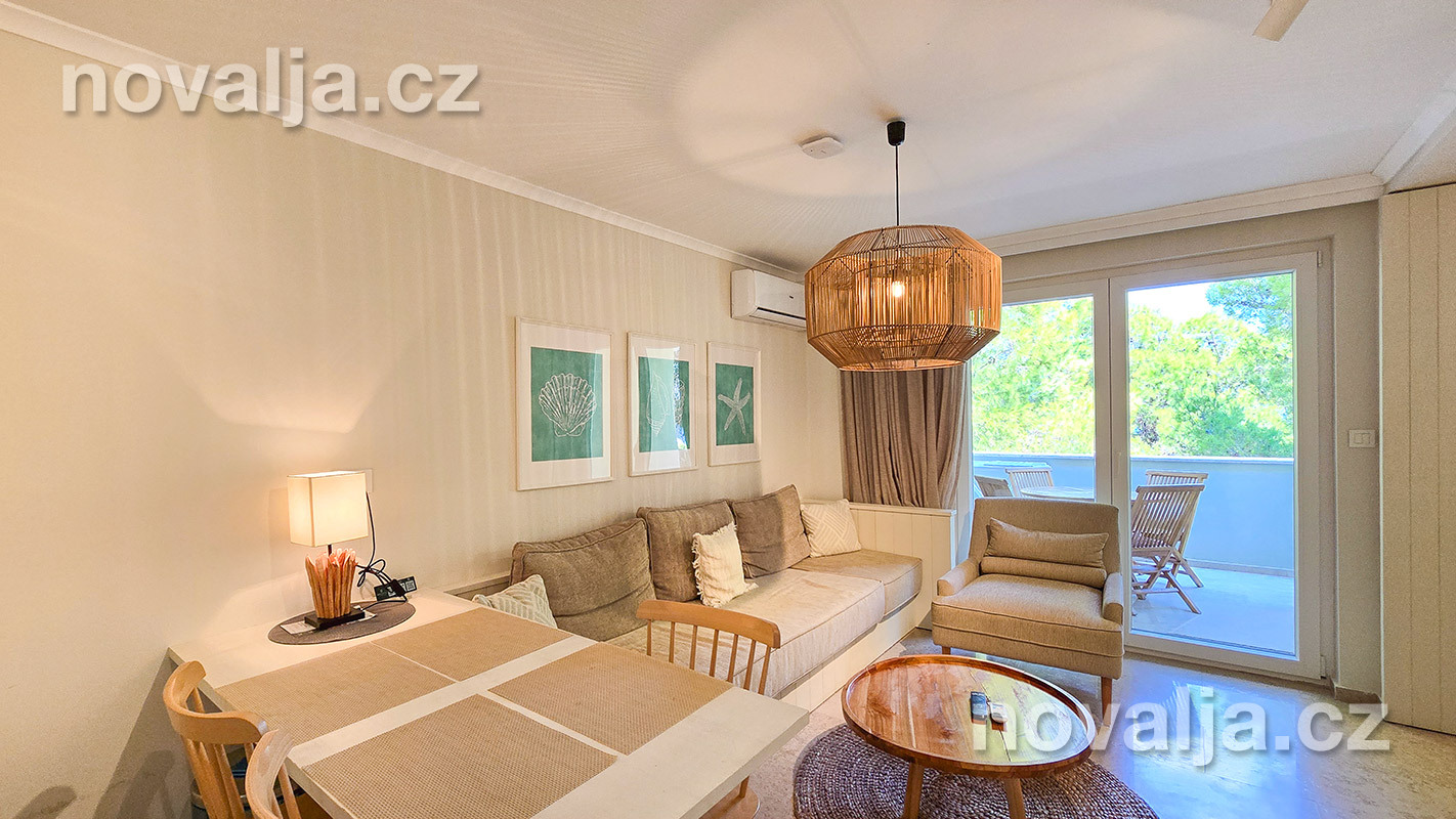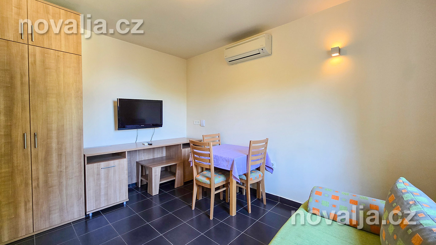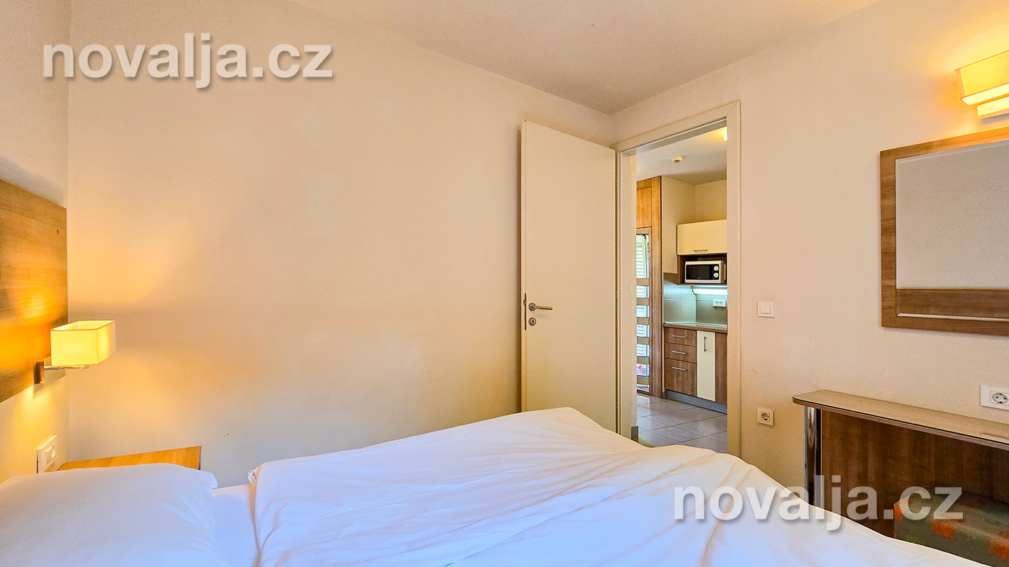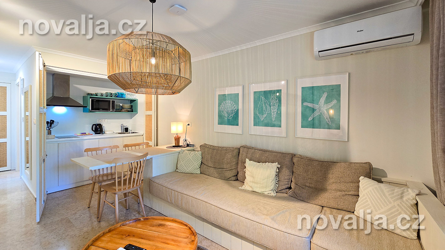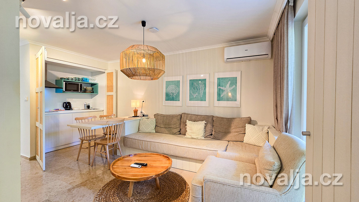 1 spálňa s dvoma lôžkami, kuchyňa so základným vybavením (elektrická dvojplatnička, chladnička, mikrovlnná rúra) s obývacím priestorom s rozkladacím gaučom pre 1–2 osoby (buď 2 deti do 12 rokov, alebo len 1 osoba staršia ako 12 rokov), TV+SAT, sociálne zariadenie s vaňou a WC, fén, trezor, terasa. Klimatizácia v kuchyni (v cene) - ovláda sa ručne, ale funguje len za podmienky, že sú zatvorené okná a dvere.