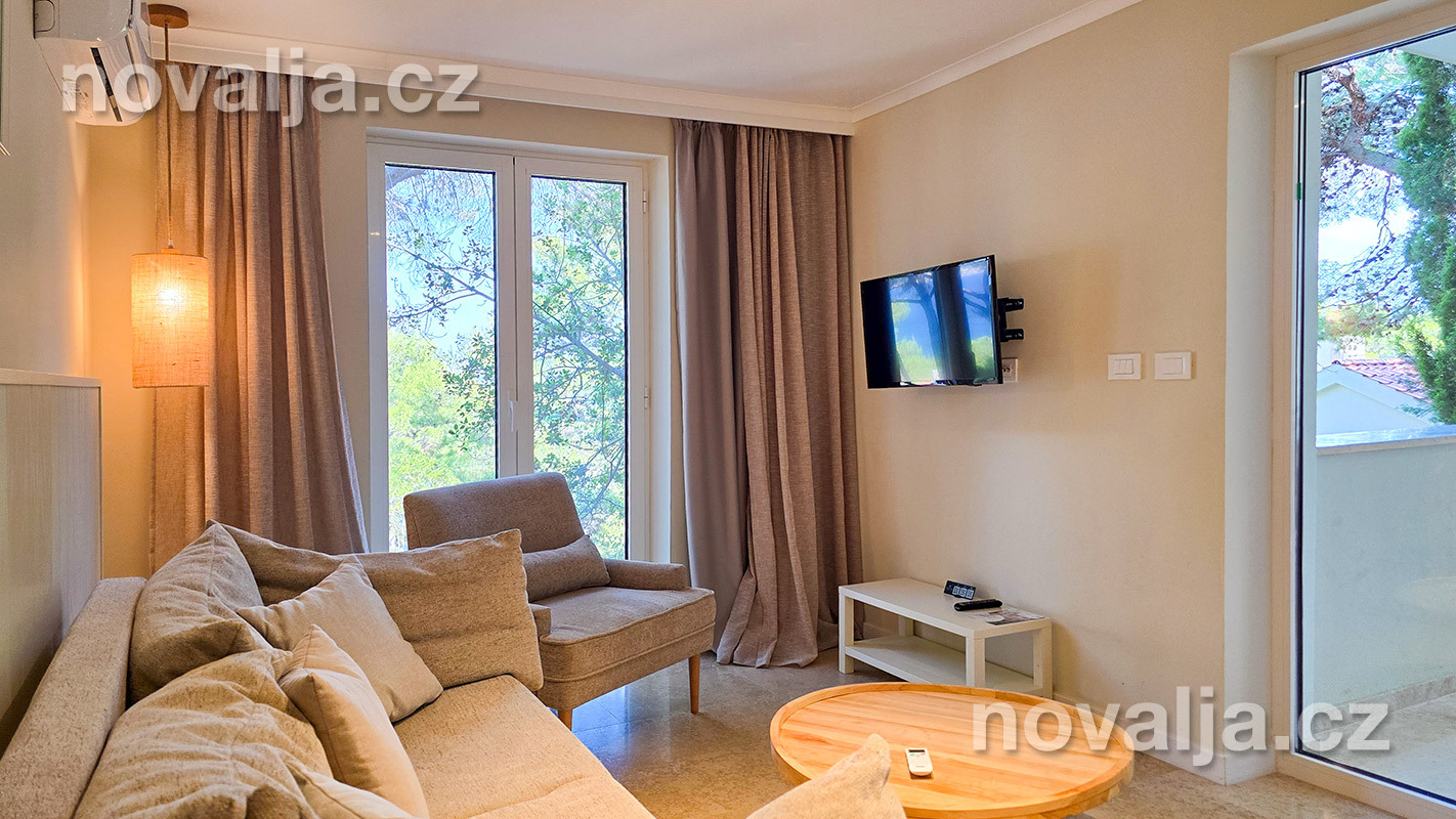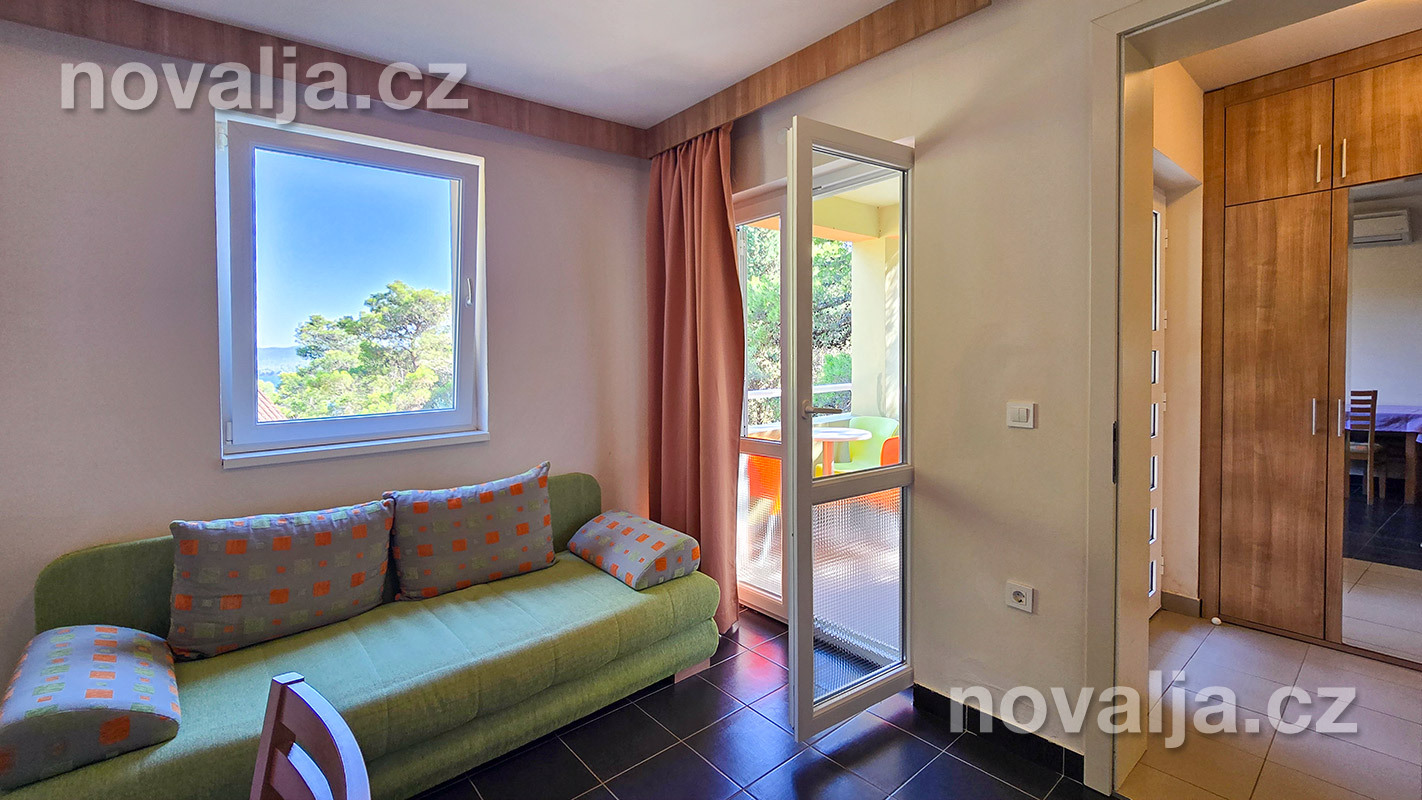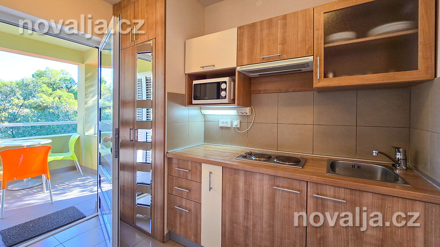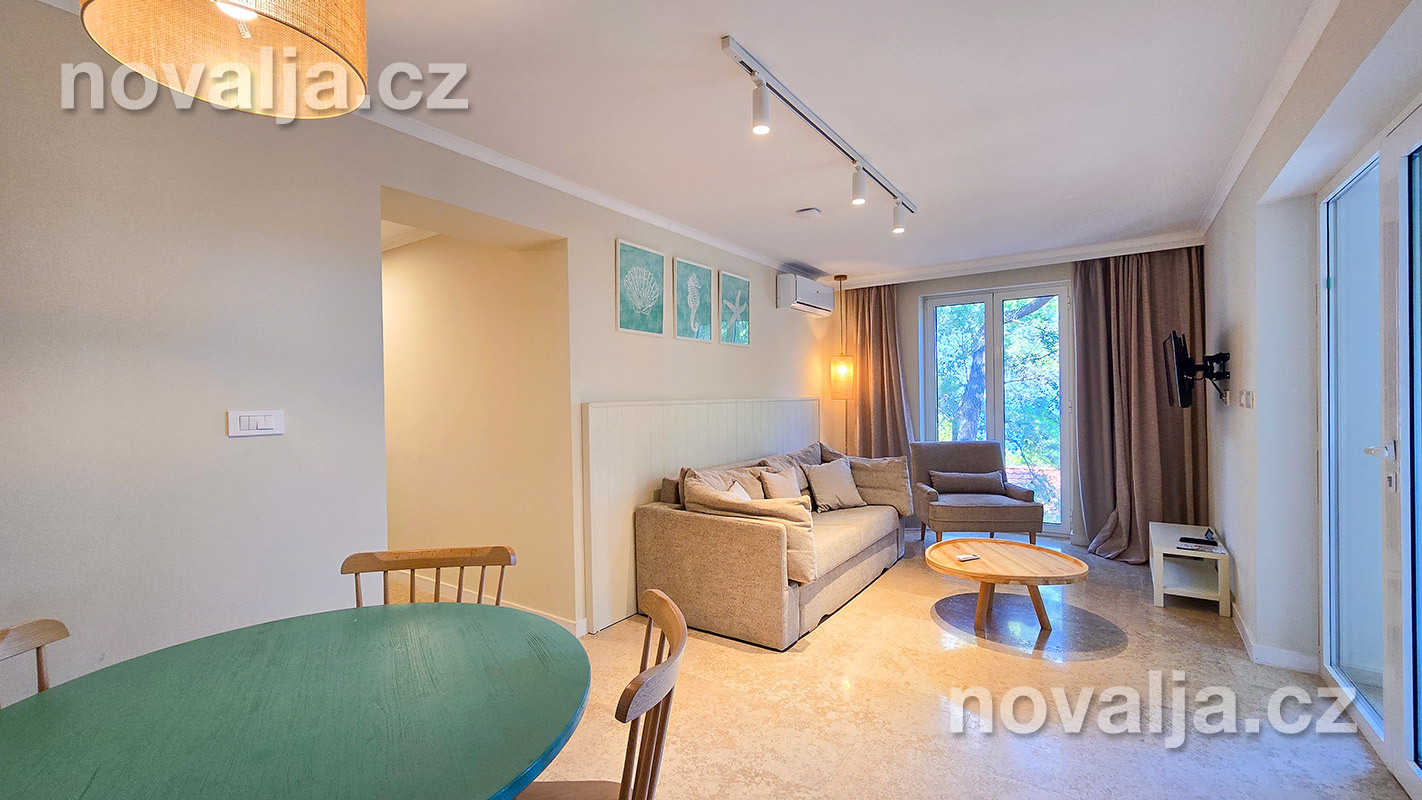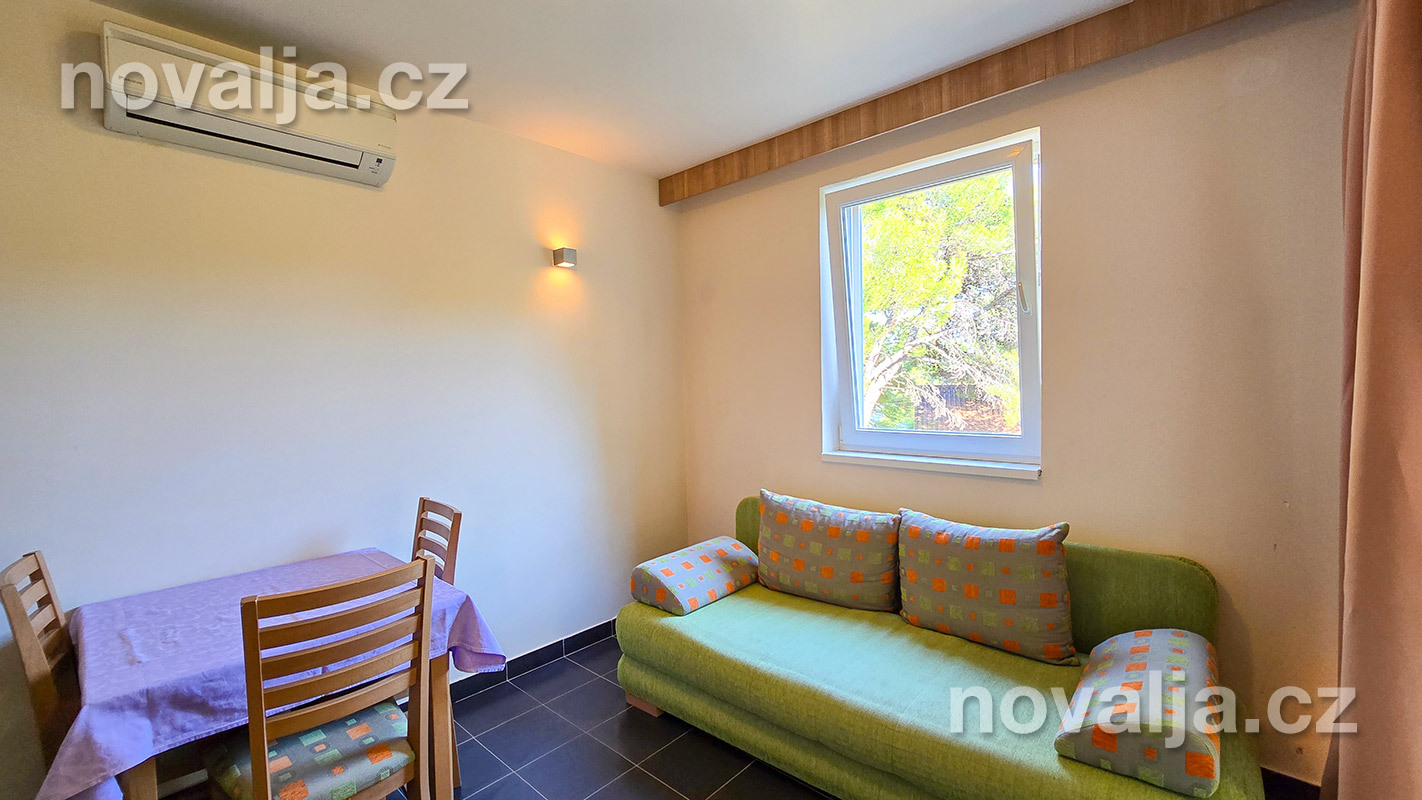 1 spálňa s dvoma lôžkami, kuchyňa so základným vybavením (elektrická dvojplatnička, chladnička, mikrovlnná rúra) s obývacím priestorom s rozkladacím gaučom pre 1–2 osoby (buď 2 deti do 12 rokov, alebo len 1 osoba staršia ako 12 rokov), TV+SAT, sociálne zariadenie s vaňou a WC, fén, trezor, terasa. Klimatizácia v kuchyni (v cene) - ovláda sa ručne, ale funguje len za podmienky, že sú zatvorené okná a dvere.