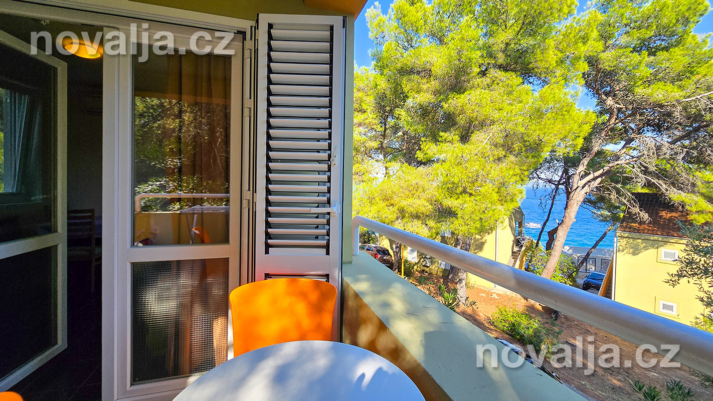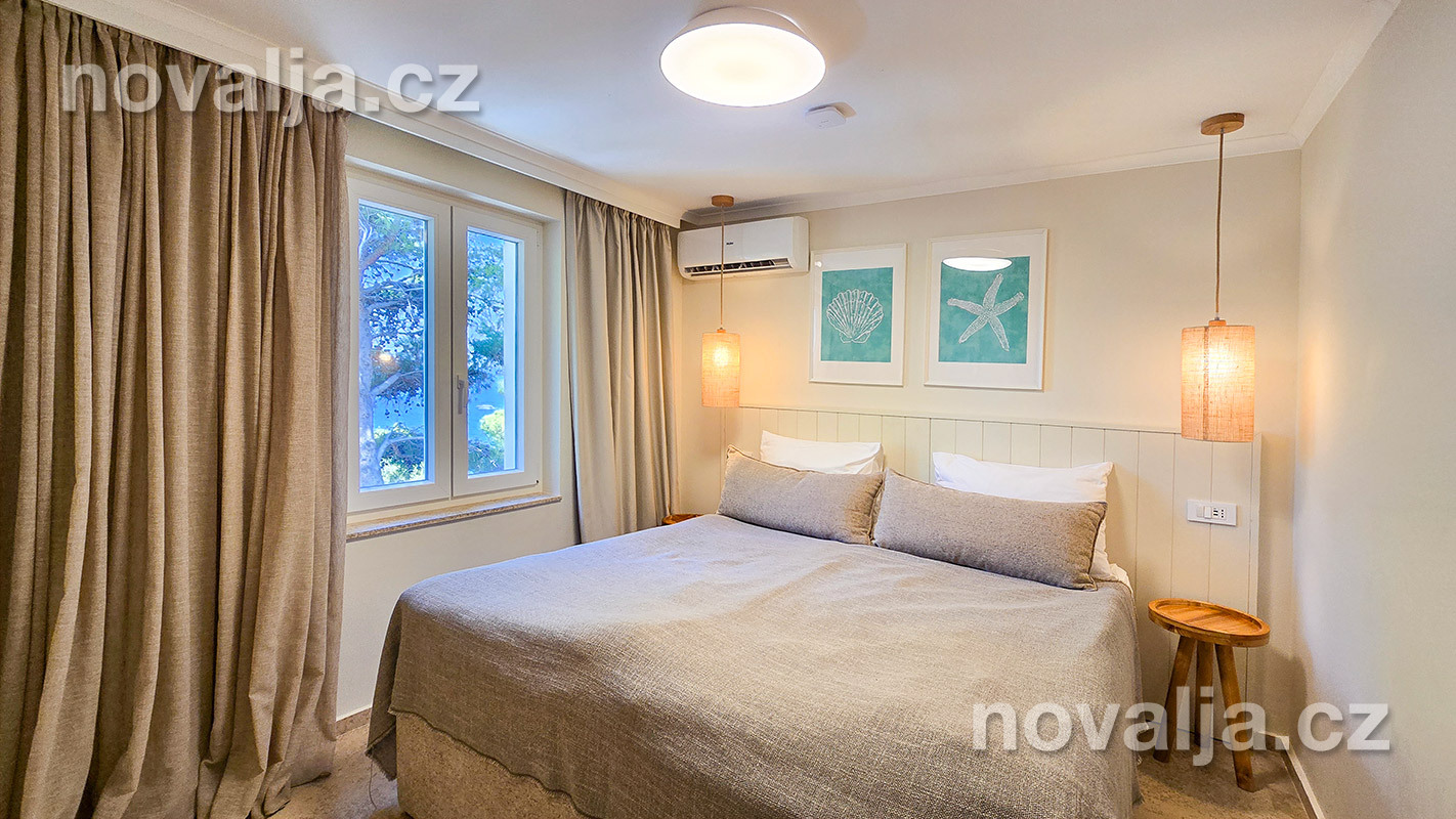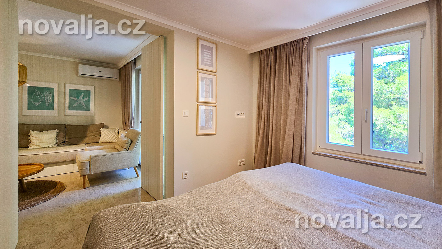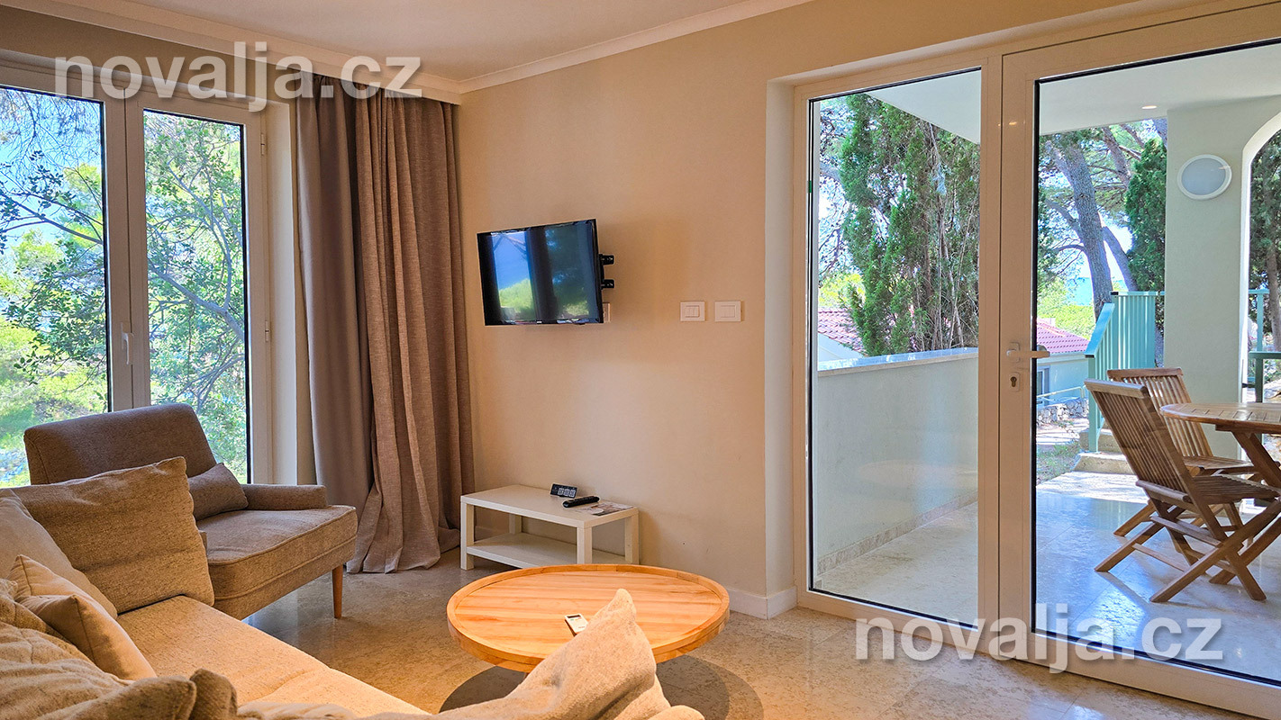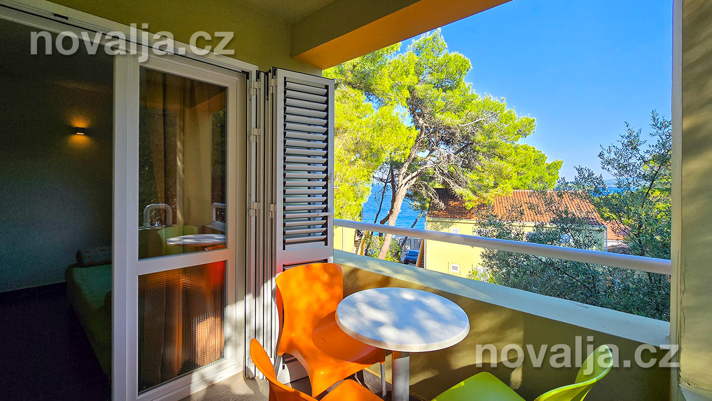 1 spálňa s dvoma lôžkami, kuchyňa so základným vybavením (elektrická dvojplatnička, chladnička, mikrovlnná rúra) s obývacím priestorom s rozkladacím gaučom pre 1–2 osoby (buď 2 deti do 12 rokov, alebo len 1 osoba staršia ako 12 rokov), TV+SAT, sociálne zariadenie s vaňou a WC, fén, trezor, terasa. Klimatizácia v kuchyni (v cene) - ovláda sa ručne, ale funguje len za podmienky, že sú zatvorené okná a dvere.