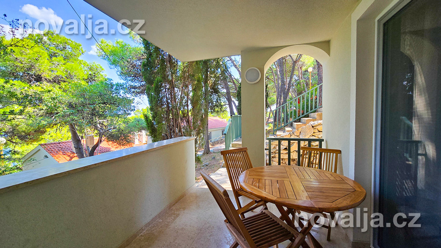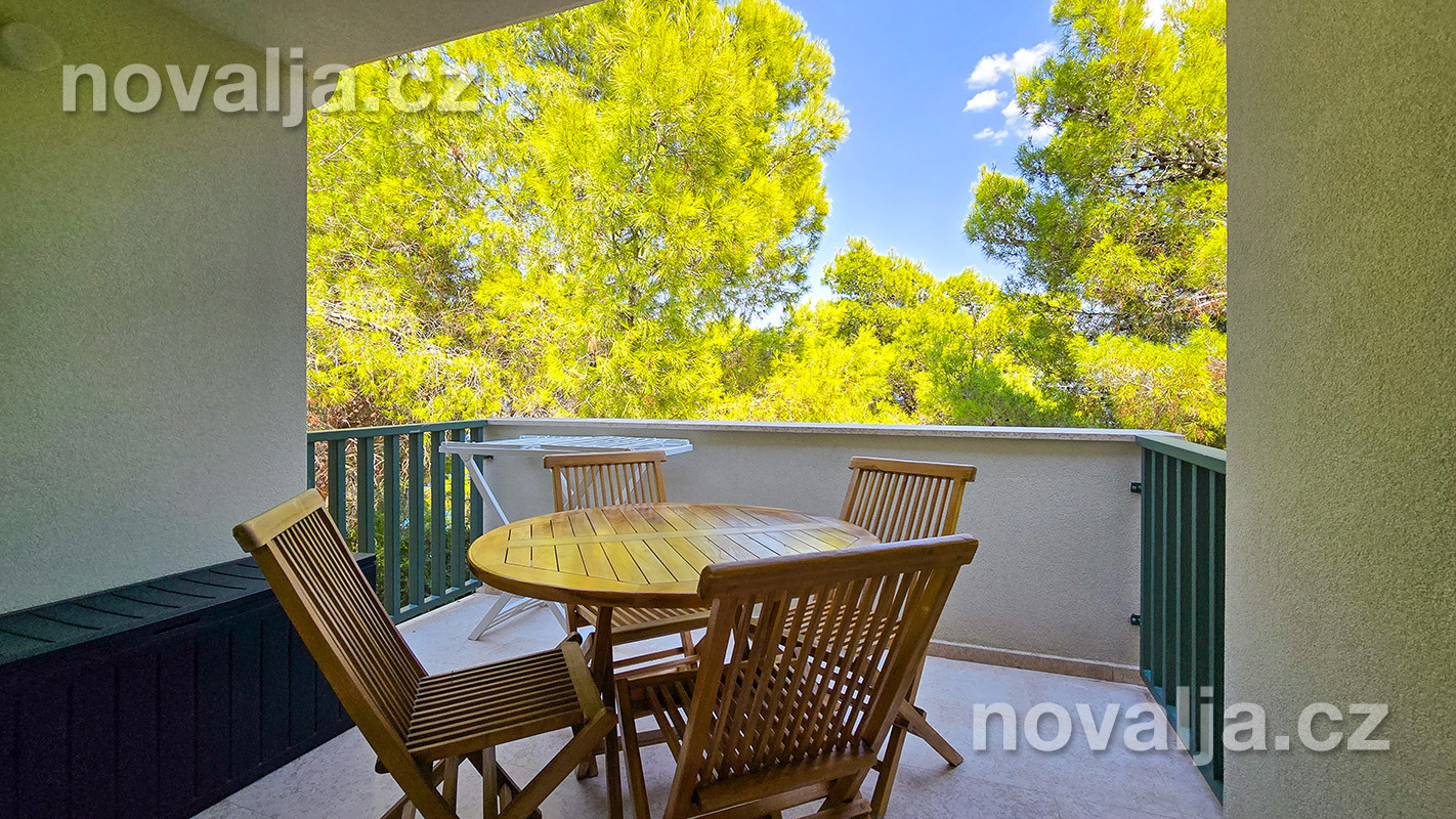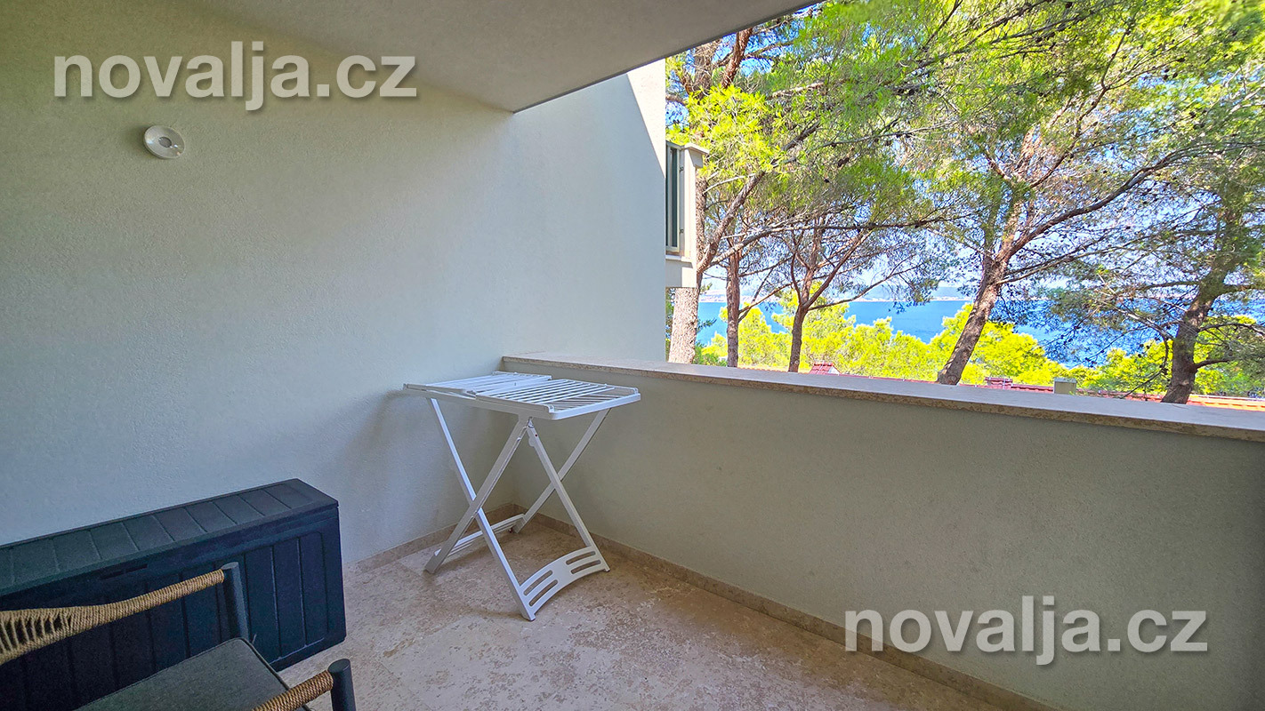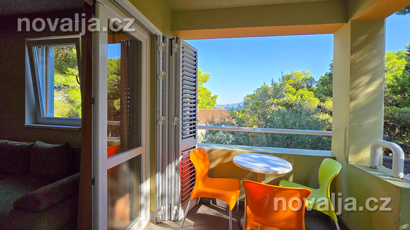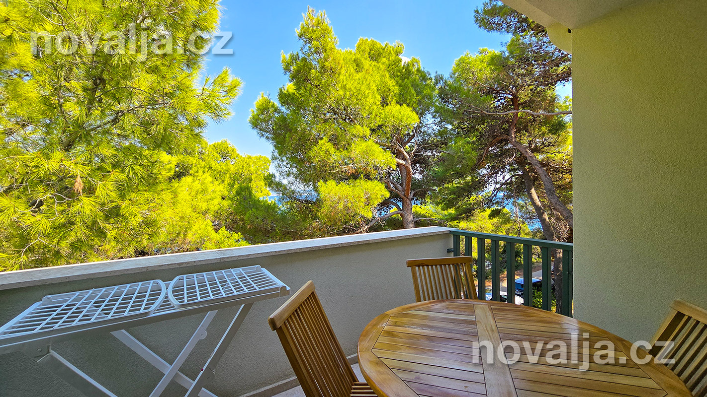 1 spálňa s dvoma lôžkami, kuchyňa so základným vybavením (elektrická dvojplatnička, chladnička, mikrovlnná rúra) s obývacím priestorom s rozkladacím gaučom pre 1–2 osoby (buď 2 deti do 12 rokov, alebo len 1 osoba staršia ako 12 rokov), TV+SAT, sociálne zariadenie s vaňou a WC, fén, trezor, terasa. Klimatizácia v kuchyni (v cene) - ovláda sa ručne, ale funguje len za podmienky, že sú zatvorené okná a dvere.