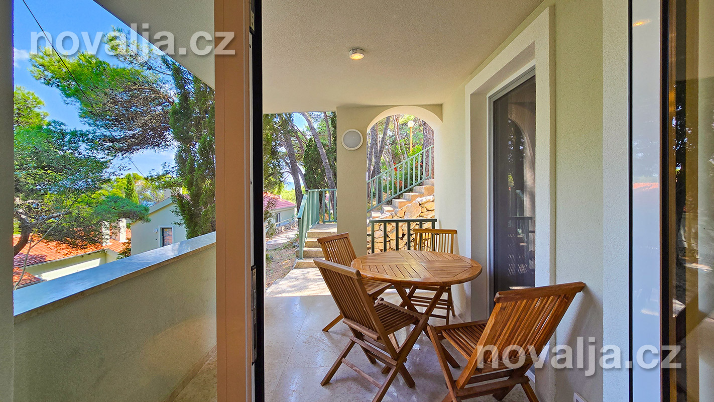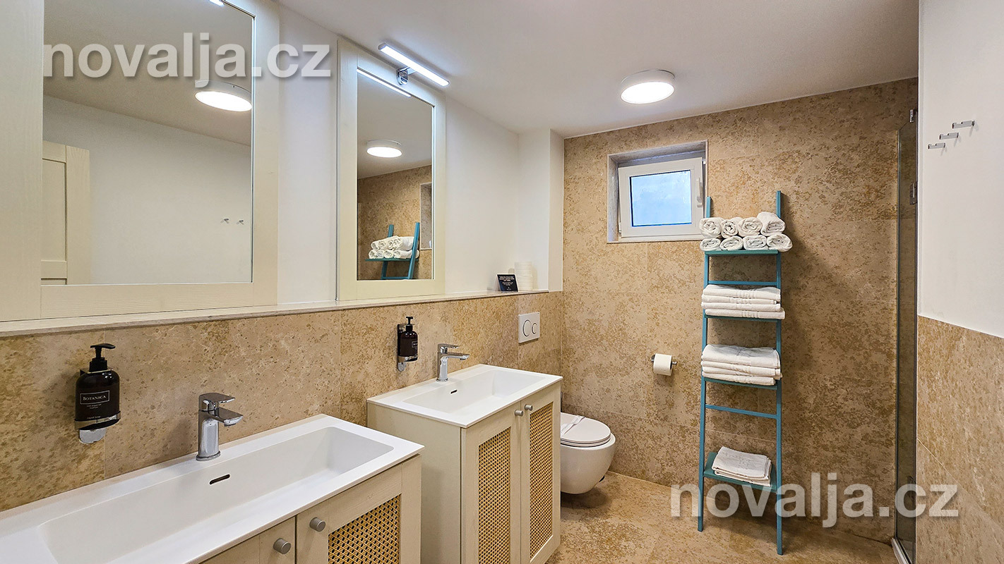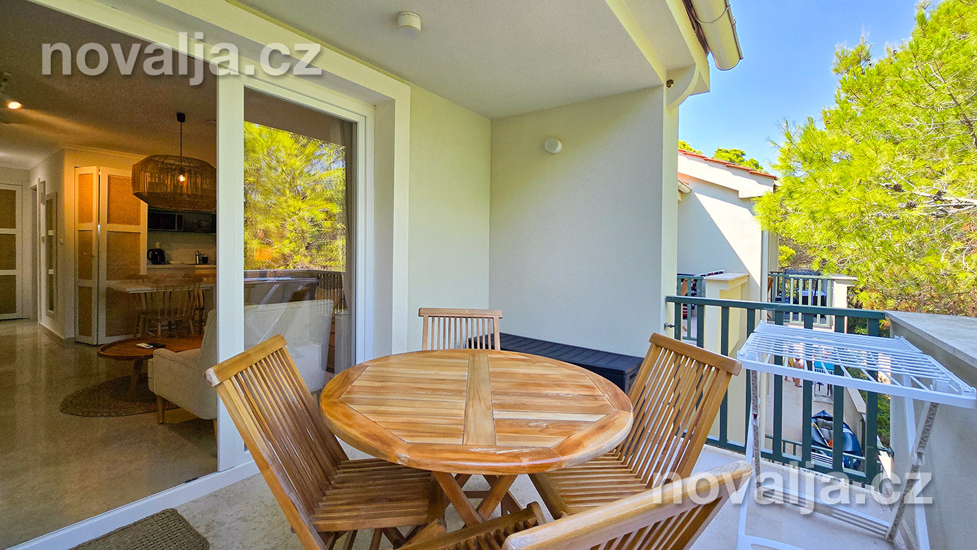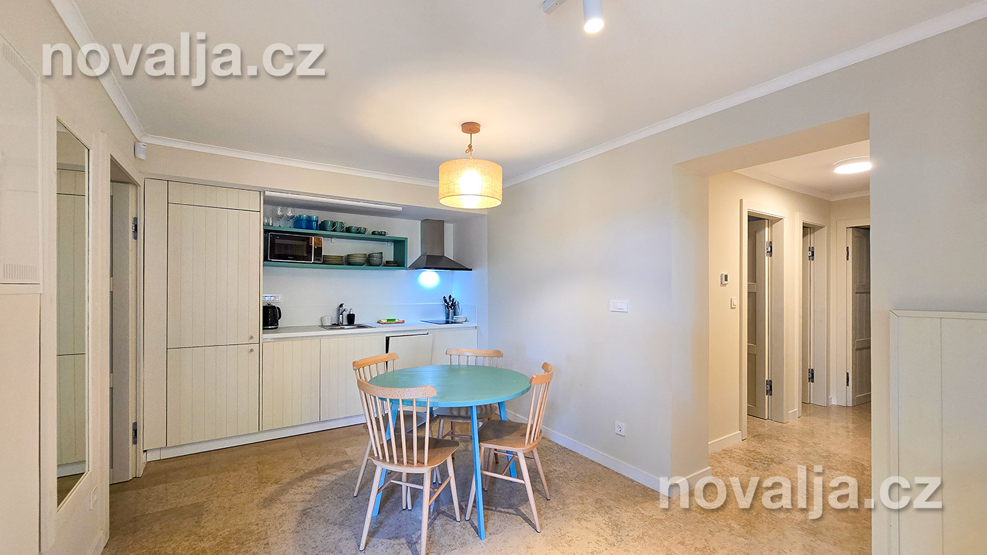 2 spálne s dvoma lôžkami, vybavená kuchyňa (chladnička, varná doska, mikrovlnná rúra, varná kanvica) s obývacím priestorom s rozkladacím gaučom pre 1–2 osoby (1 osoba staršia ako 12 rokov a 1 dieťa do 11,99 rokov), TV+SAT, sociálne zariadenie so sprchovacím kútom a WC, fén, trezor, terasa.