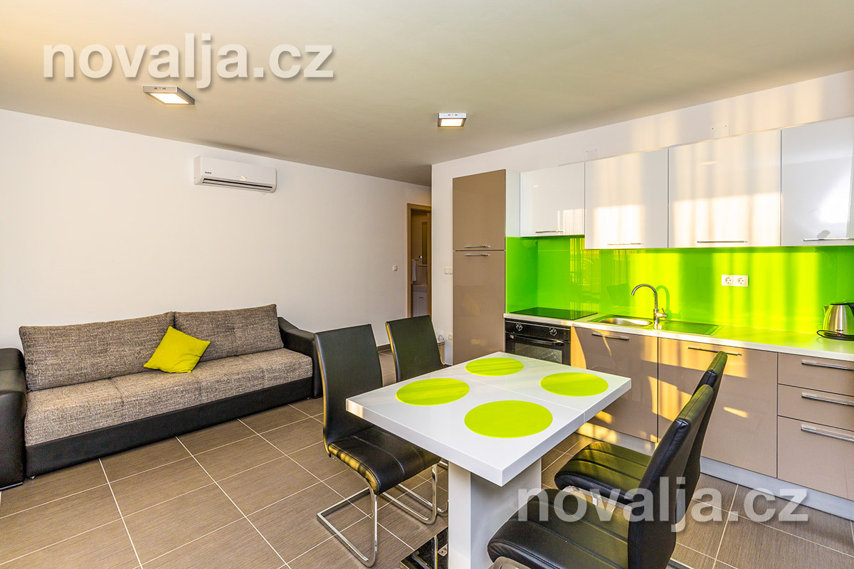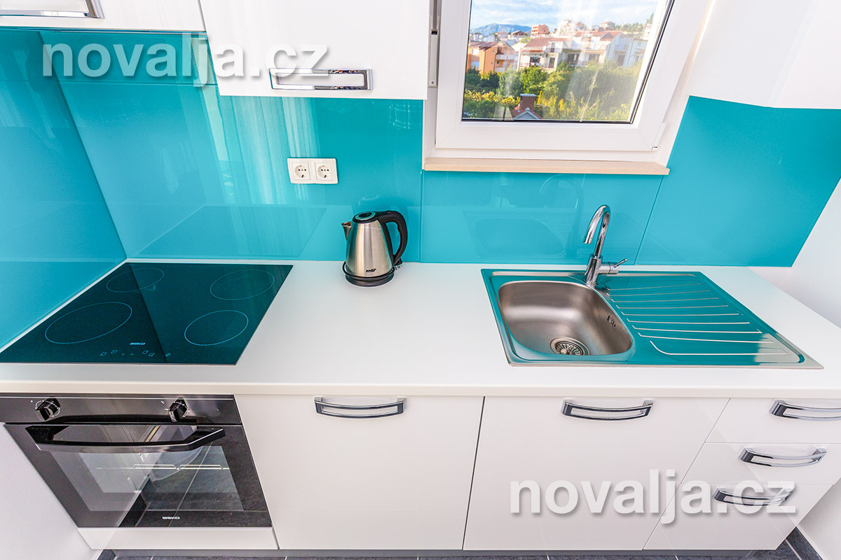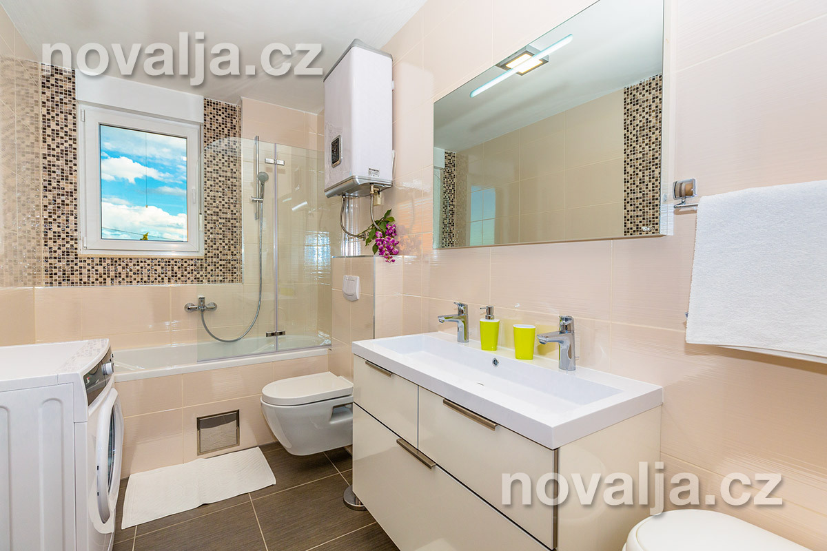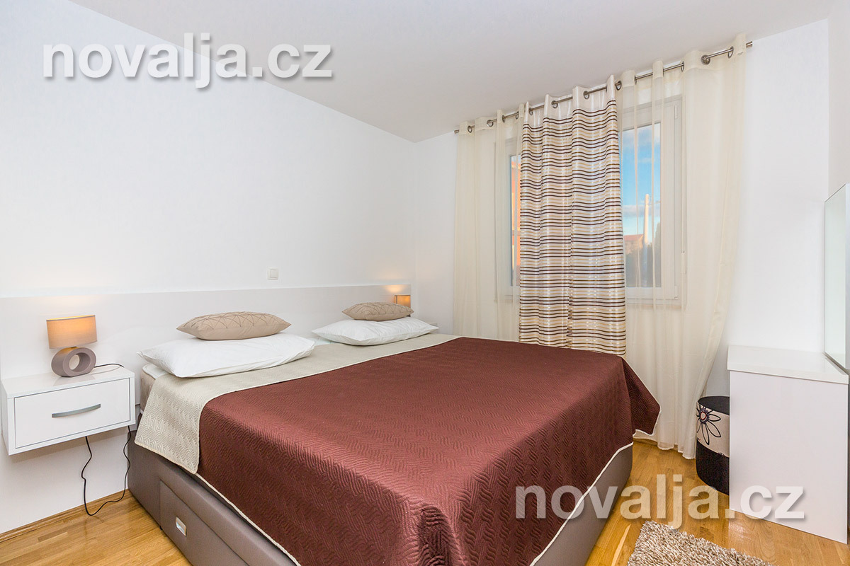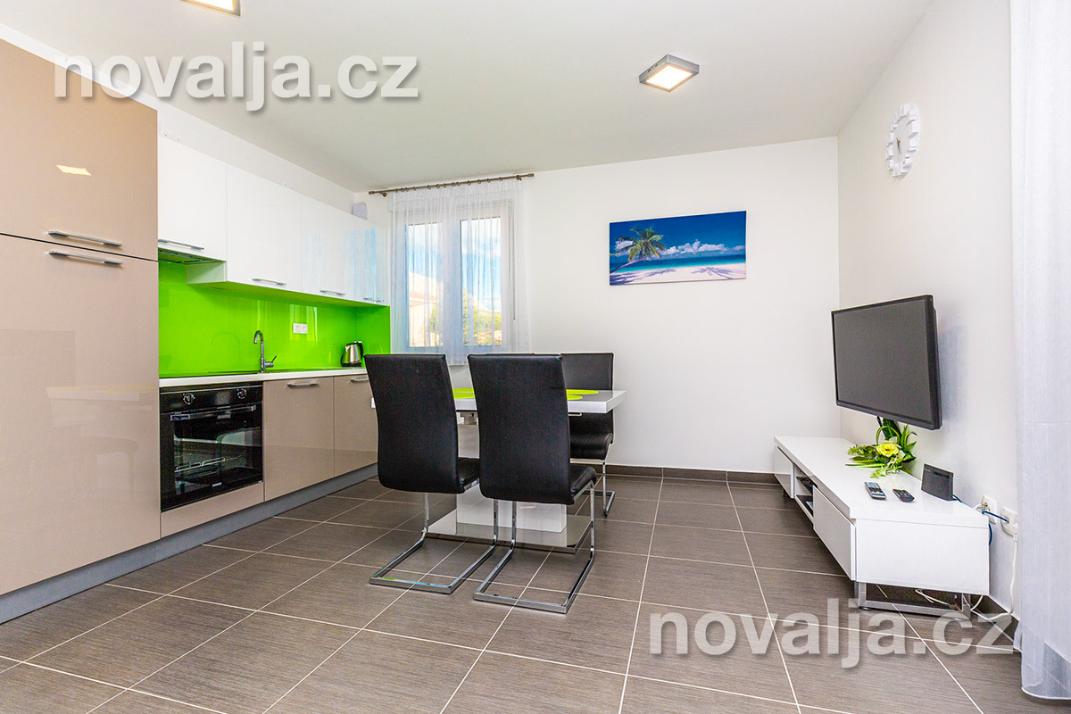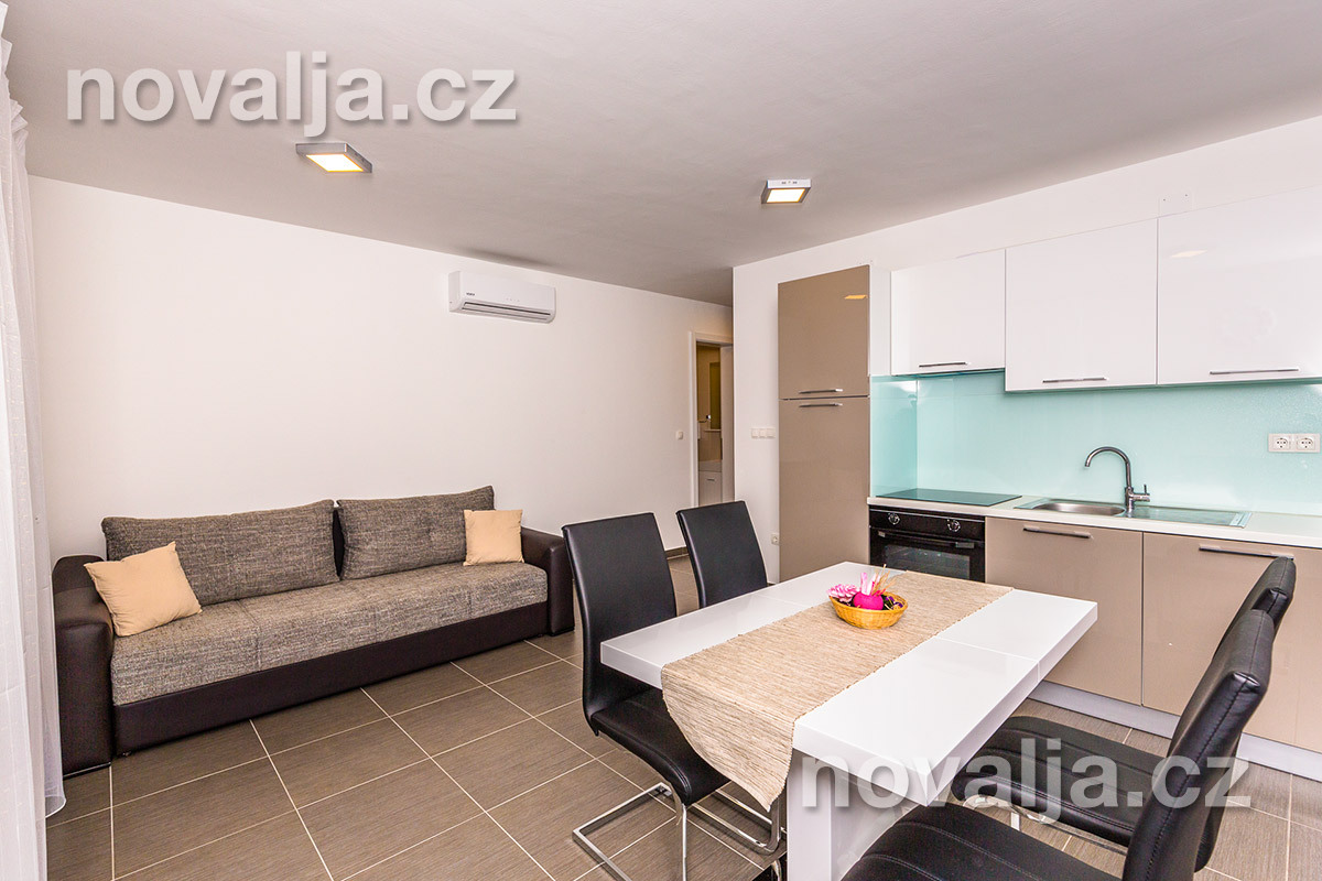 1 spálňa s dvoma lôžkami, vybavená kuchyňa (chladnička, mraznička, rúra, umývačka riadu + tablety do umývačky, rýchlovarná kanvica, kávovar) s rozkladacím gaučom (200 x 160 cm) pre 1–2 osoby, LCD TV+SAT, trezor, sociálne zariadenie s vaňou a WC, ďalšie samostatné WC, práčka, fén, terasa s výhľadom na more. Klimatizácia v kuchyni (v cene).