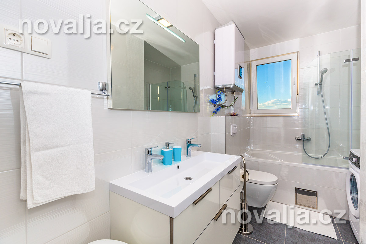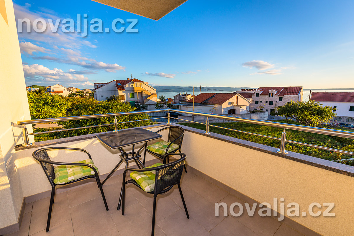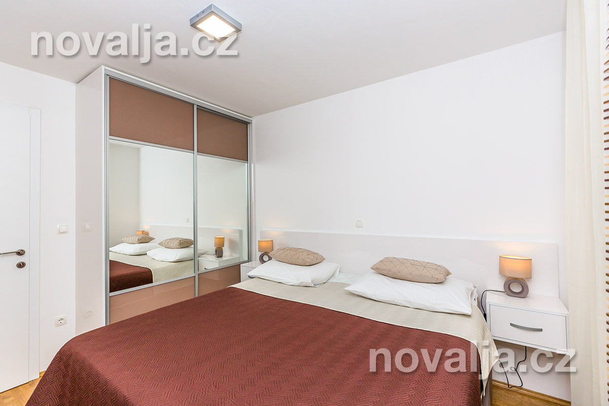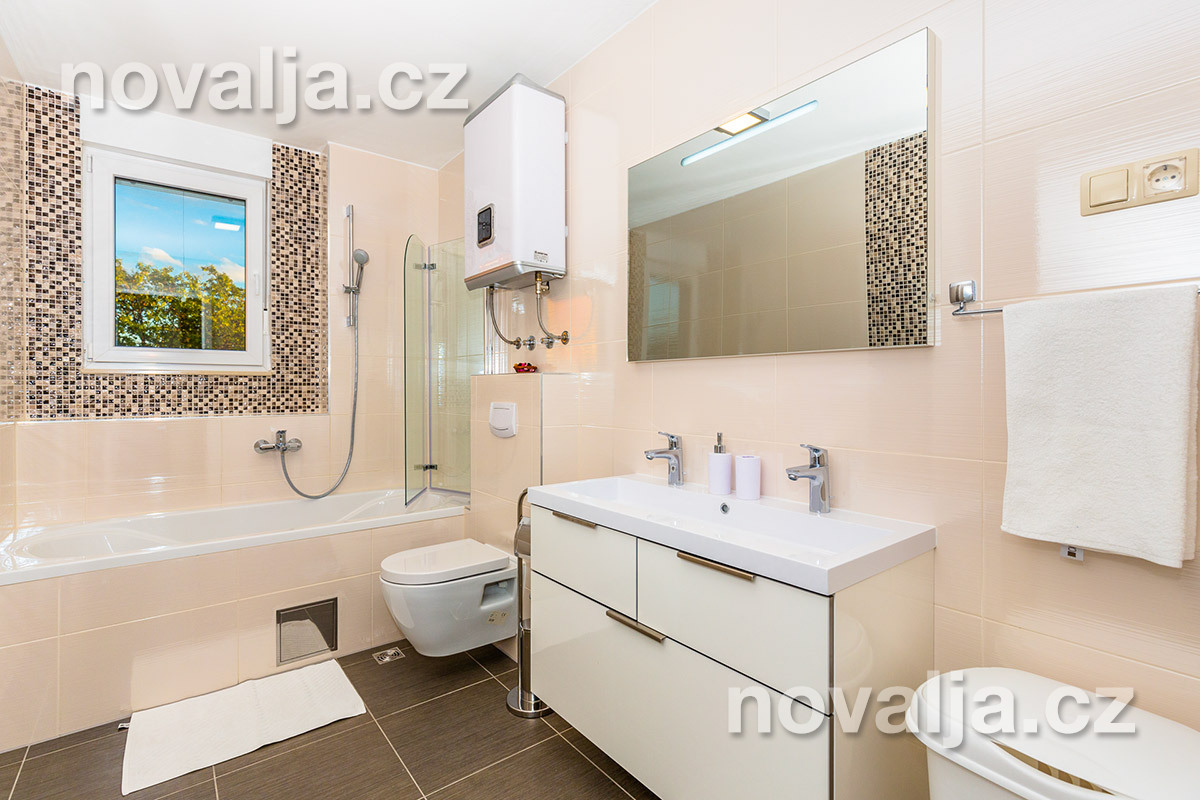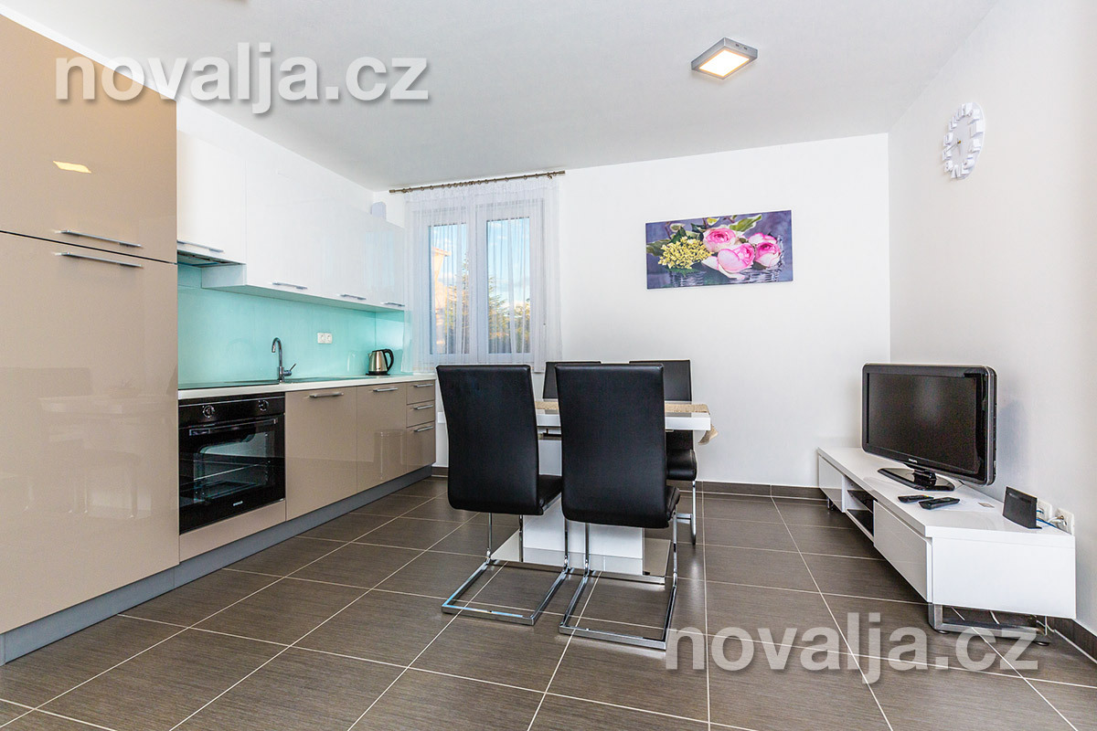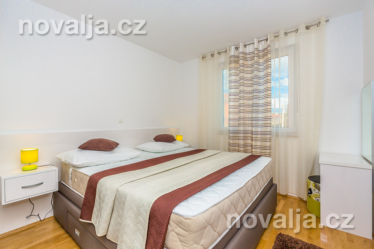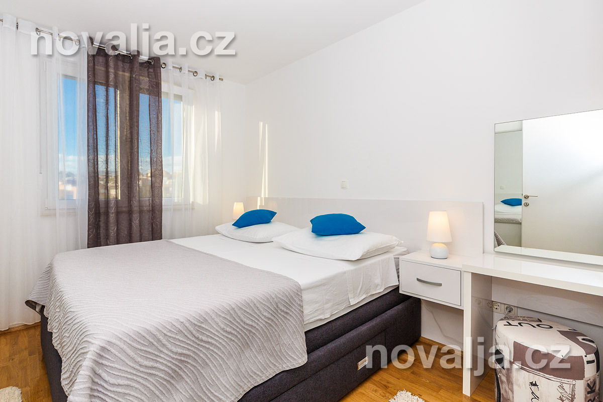 1 spálňa s dvoma lôžkami, vybavená kuchyňa (chladnička, mraznička, rúra, umývačka riadu + tablety do umývačky, rýchlovarná kanvica, kávovar) s rozkladacím gaučom (200 x 160 cm) pre 1–2 osoby, LCD TV+SAT, trezor, sociálne zariadenie s vaňou a WC, ďalšie samostatné WC, práčka, fén, terasa s výhľadom na more. Klimatizácia v kuchyni (v cene).