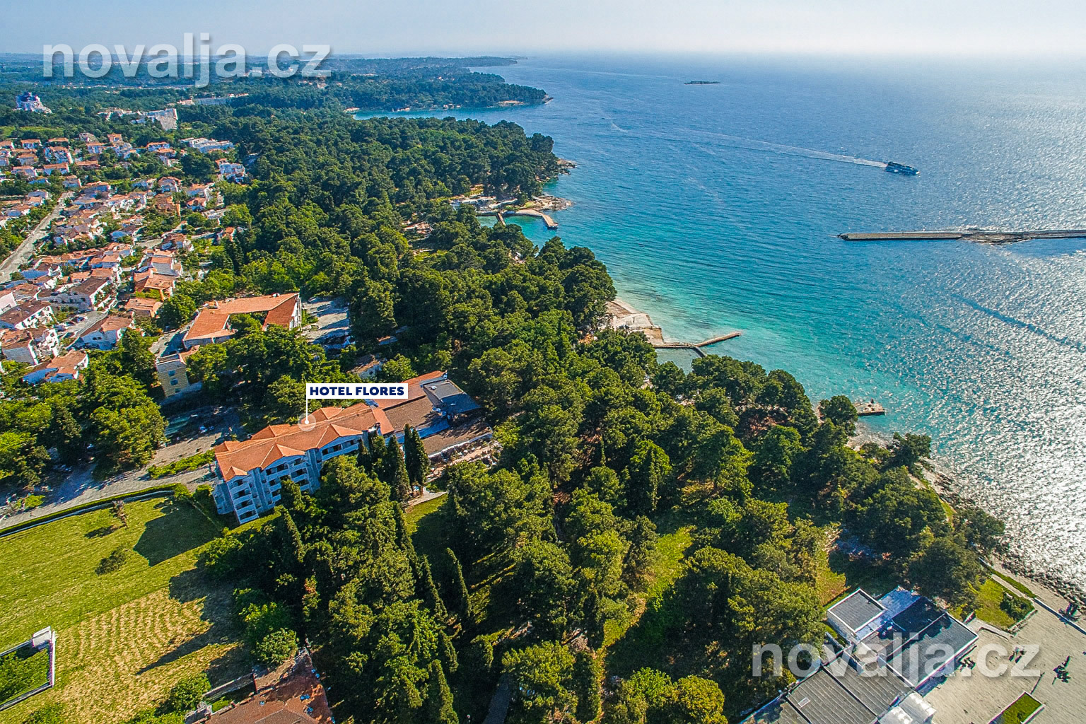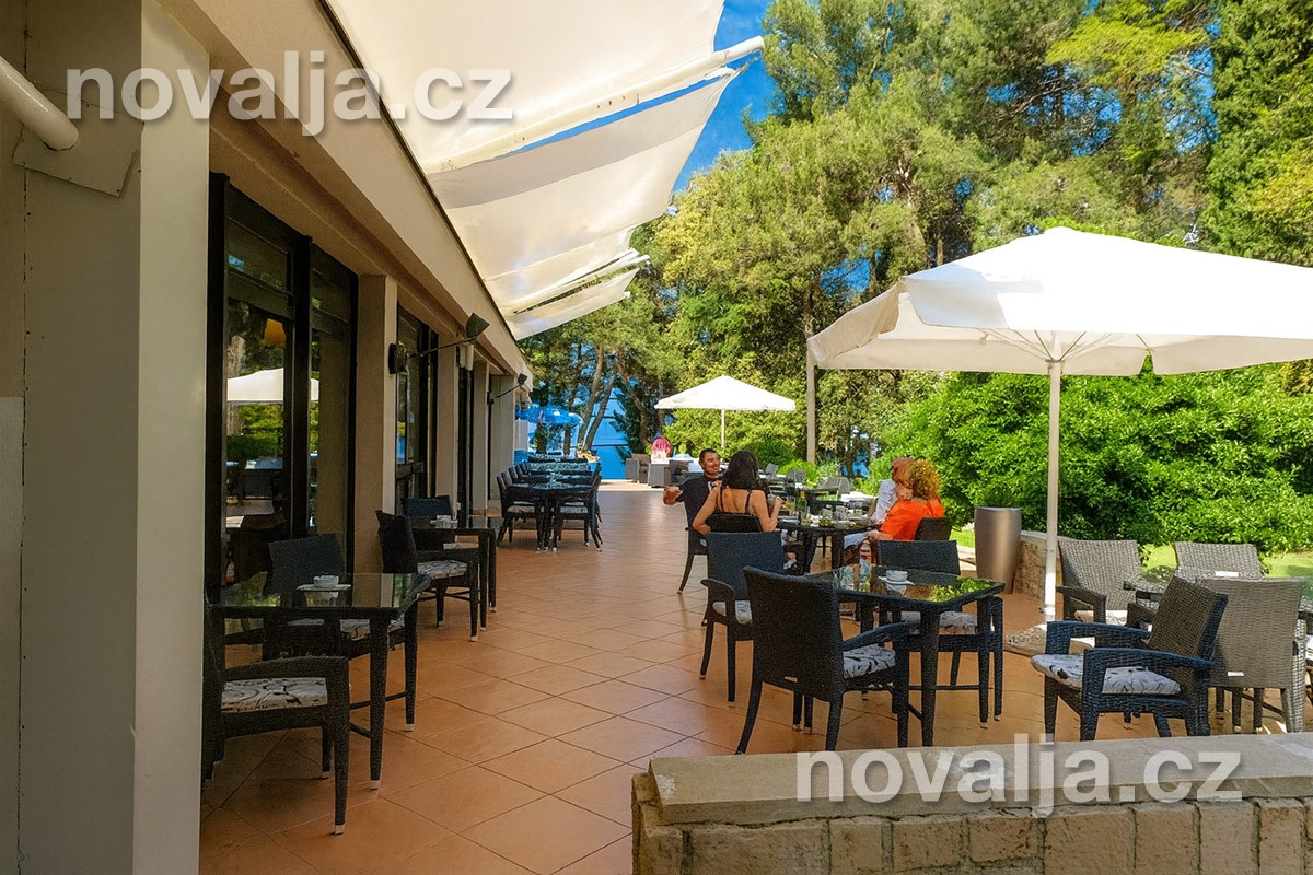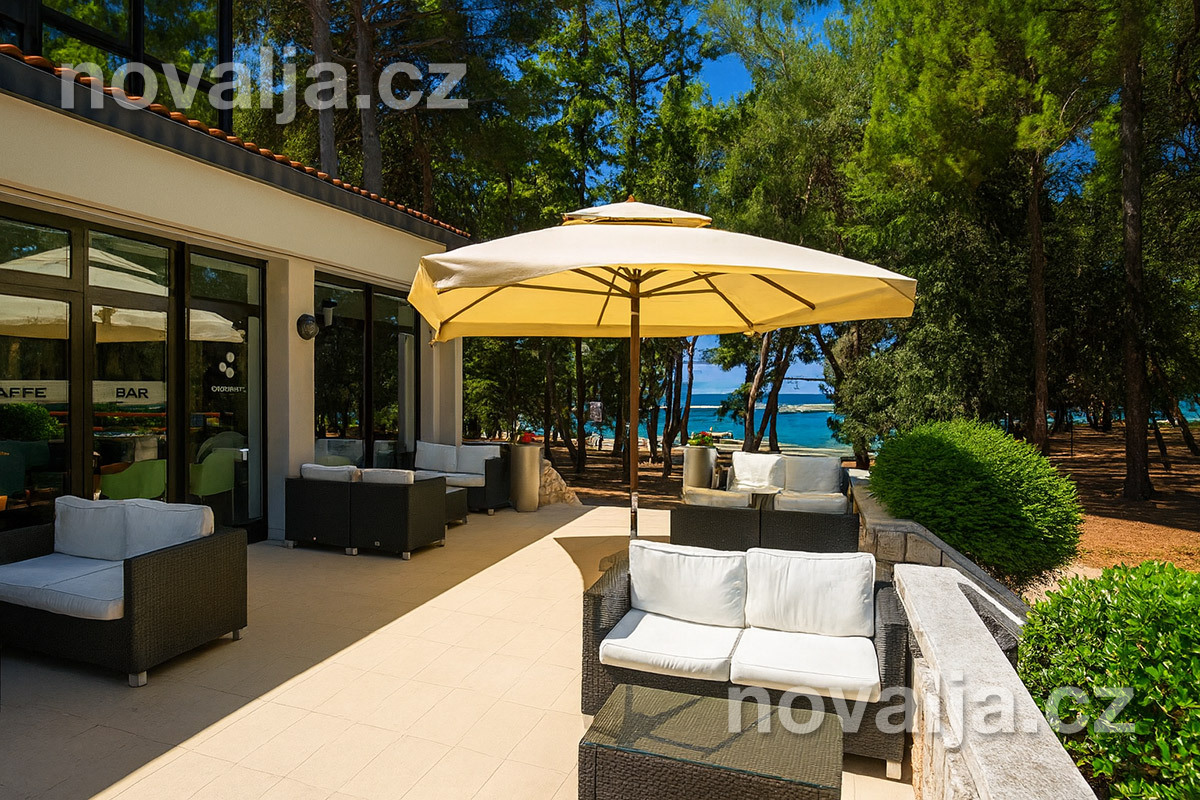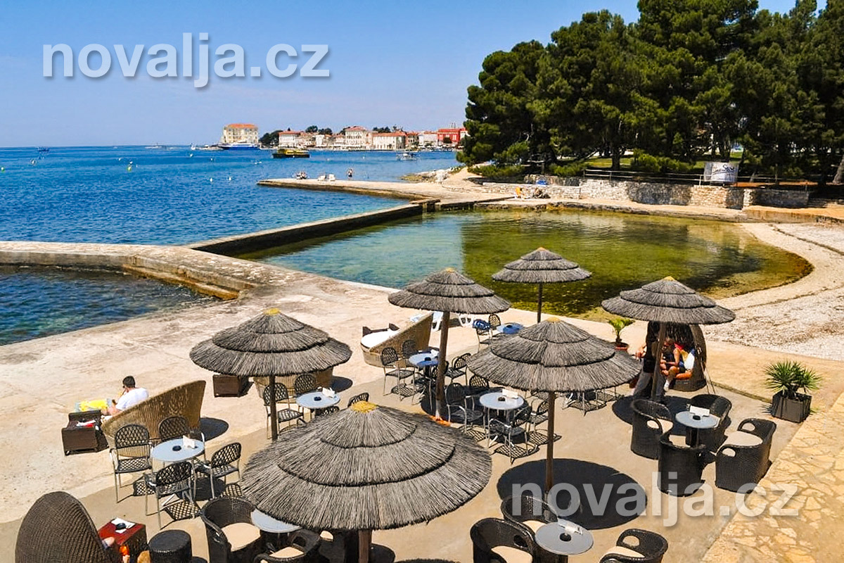 Najbližšia kamienková pláž je len 50 m od hotela, okolo sú potom ďalšie kamienkové pláže s pozvoľným vstupom do mora a betónové pláty so schodíkmi do mora. Tieto pláže sa nazývajú Kupalisko a sú lemované vysokými borovicami poskytujúcimi veľa miest na odpočinok v tieni. Do starého mesta Poreč, kde sa môžete prechádzať kamennými uličkami s reštauráciami a obchodíkmi so suvenírmi alebo navštíviť miestne akvárium, je to prechádzkou 700 m.