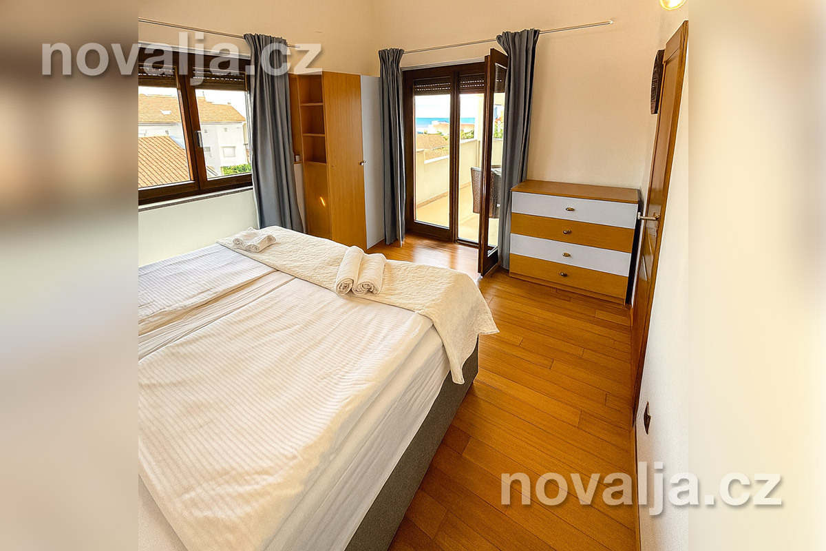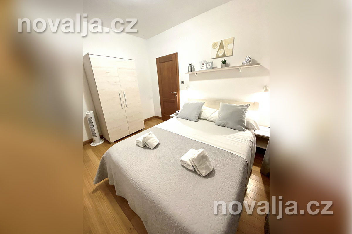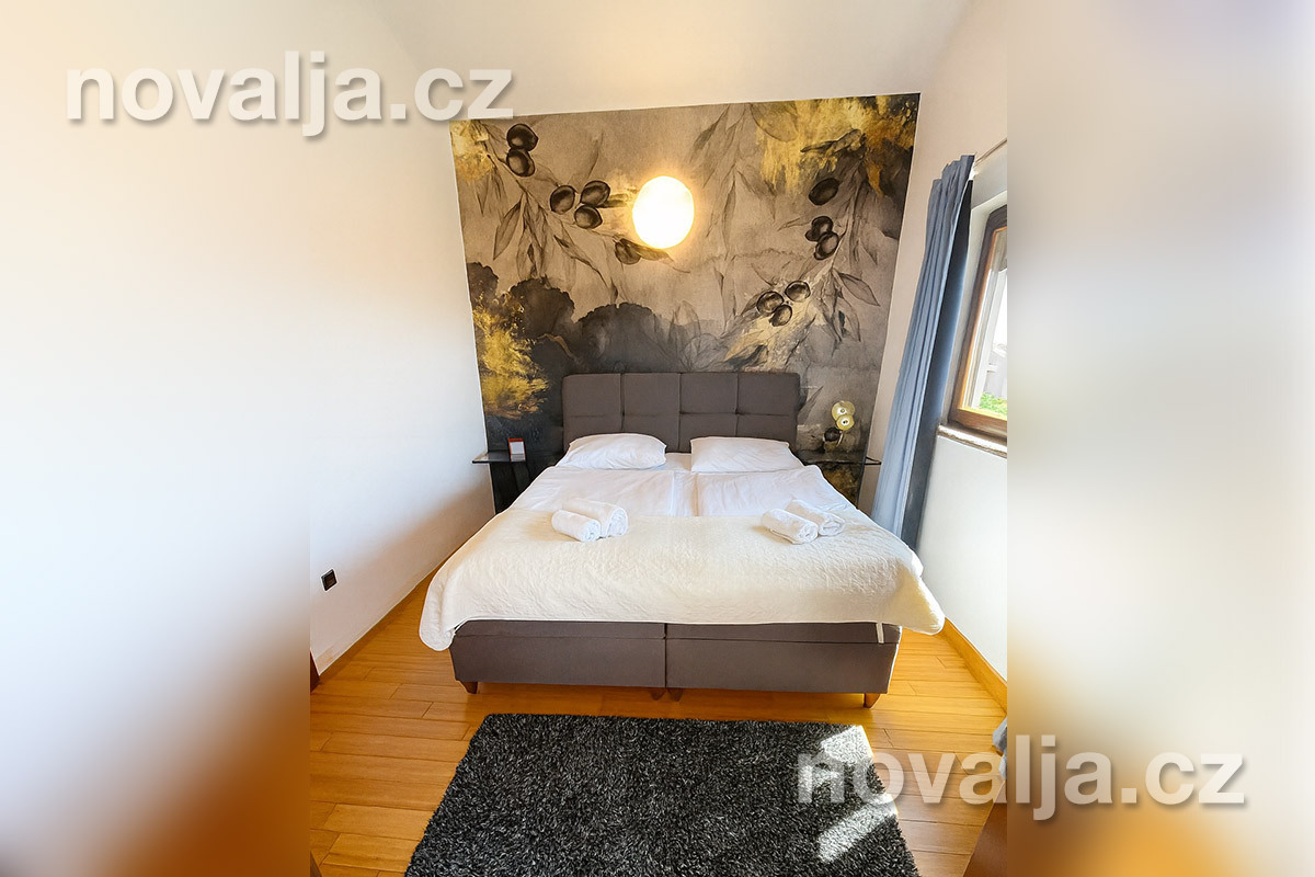Vybavená kuchyňa (chladnička, mraznička, rúra, umývačka, mikrovlnná rúra, varná kanvica, kávovar), obývačka s krbom a priestranným gaučom a krbom, 1 spálňa s dvoma lôžkami, terasa s čiastočným výhľadom na more, LCD TV+SAT, 2x sociálne zariadenie - 1x WC, práčka, žehlička.