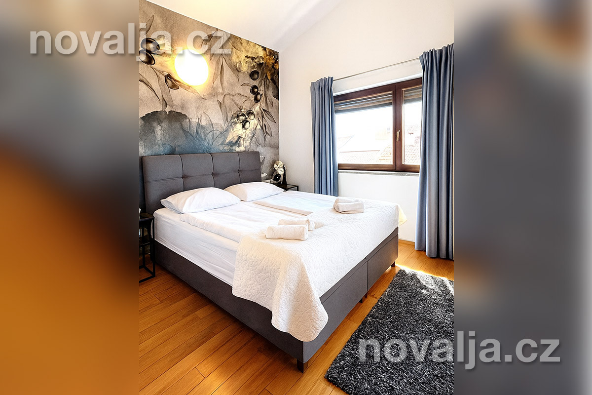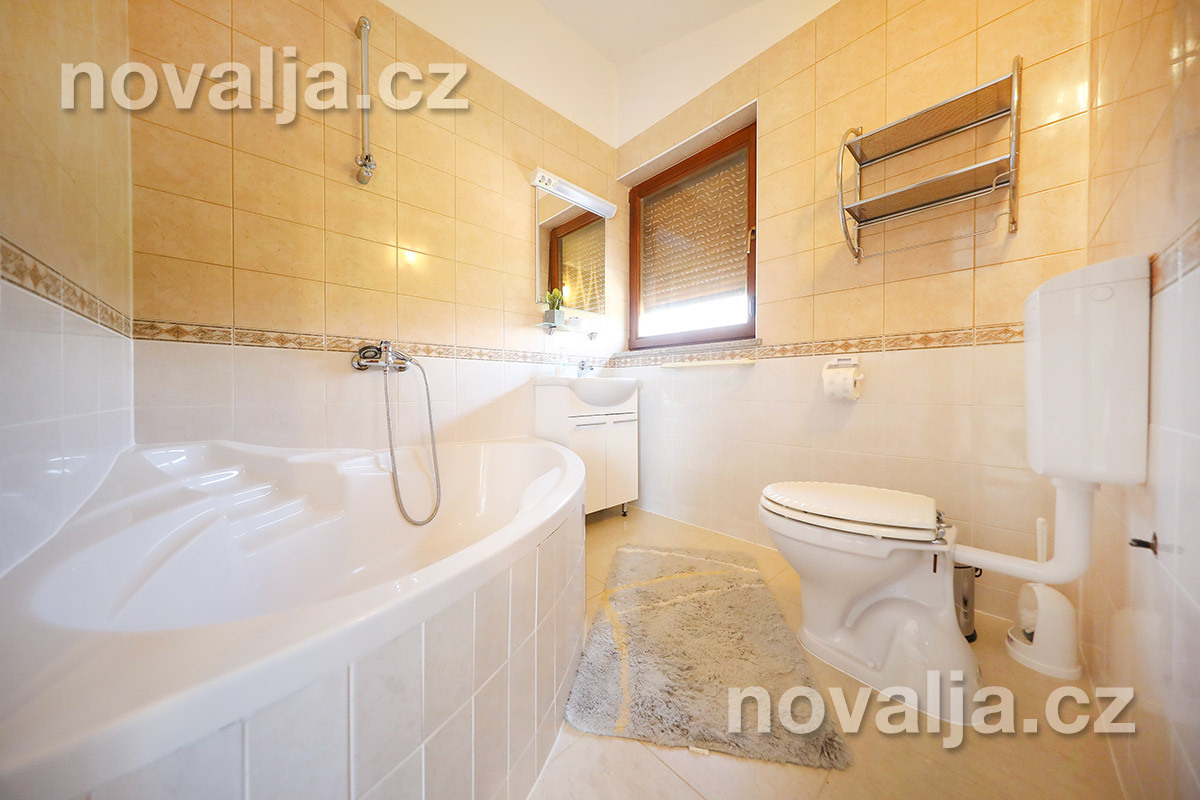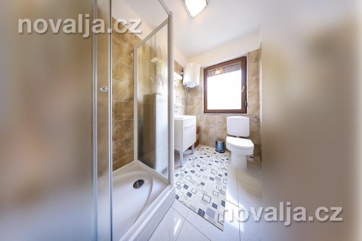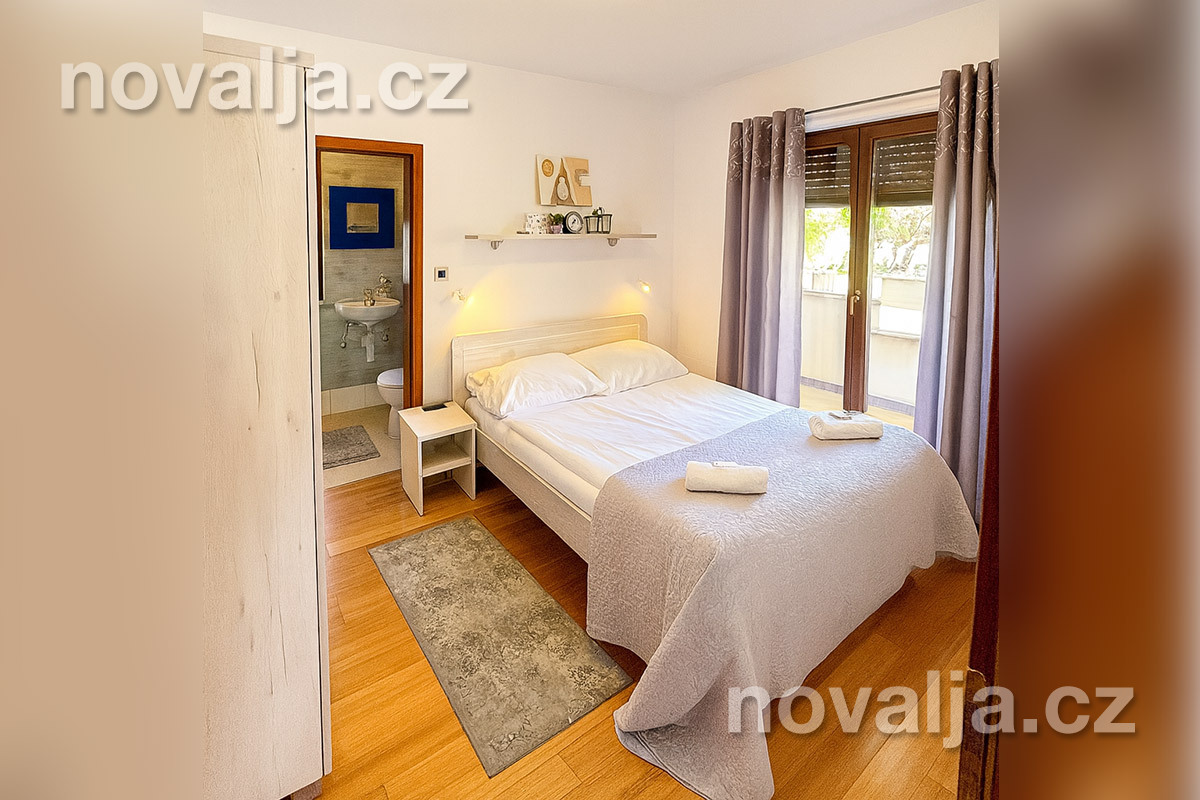 Vybavená kuchyňa (chladnička, mraznička, rúra, umývačka, mikrovlnná rúra, varná kanvica, kávovar), obývačka s krbom a priestranným gaučom a krbom, 1 spálňa s dvoma lôžkami, terasa s čiastočným výhľadom na more, LCD TV+SAT, 2x sociálne zariadenie - 1x WC, práčka, žehlička.