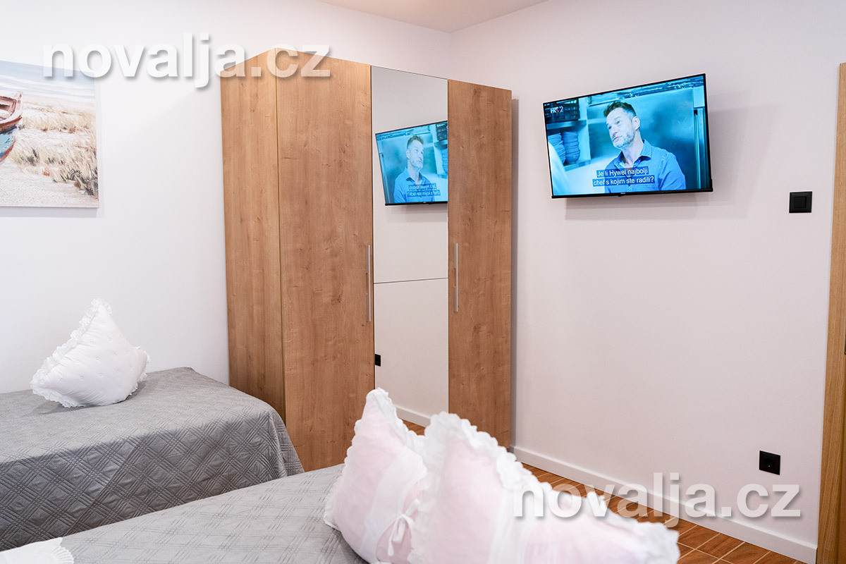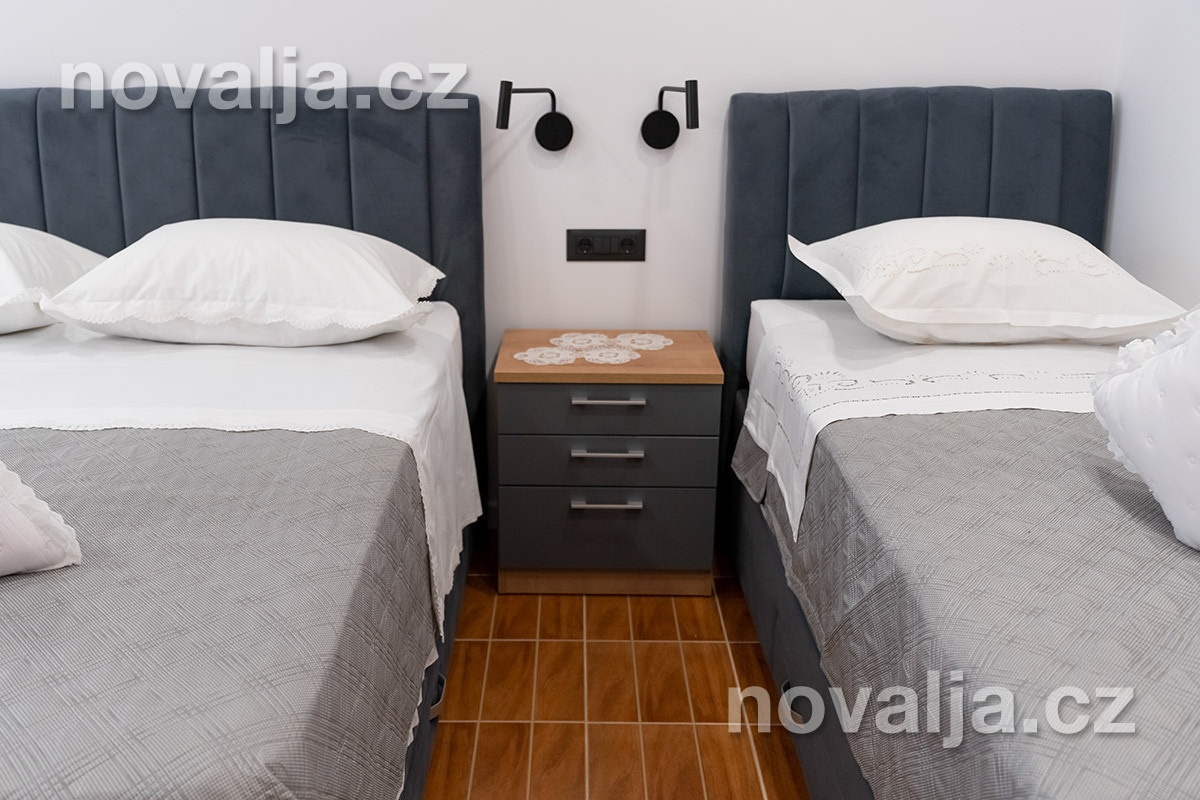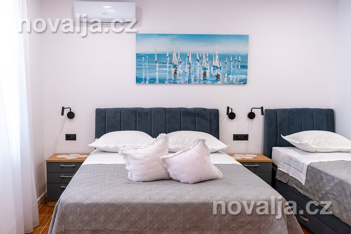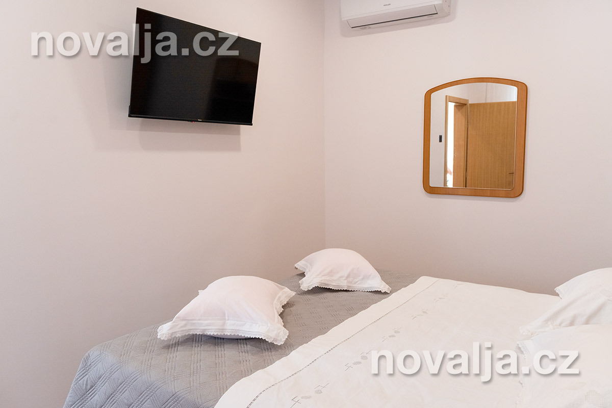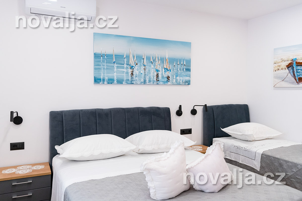 2 spálne - jedna s tromi lôžkami, druhá s dvoma lôžkami, 2x Google LCD TV, vybavená kuchyňa (elektrická varná doska, chladnička, mraznička, rúra, mikrovlnná rúra, varná kanvica), kúpeľňa s vaňou a WC, ďalšie samostatné WC, terasa. 3x klimatizácia - v oboch spálňach aj v kuchyni (v cene).