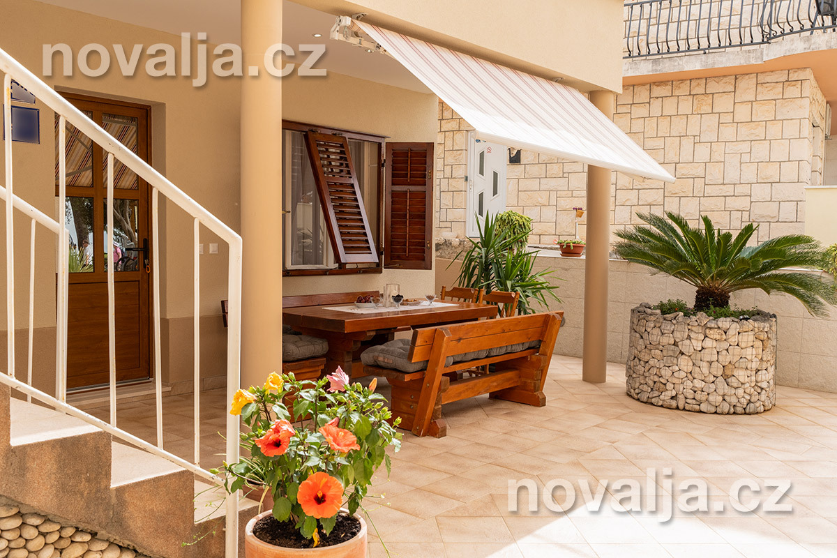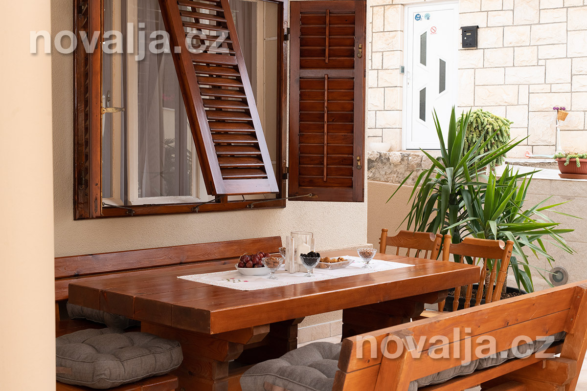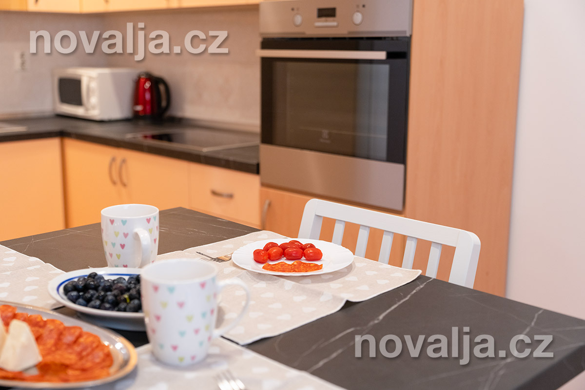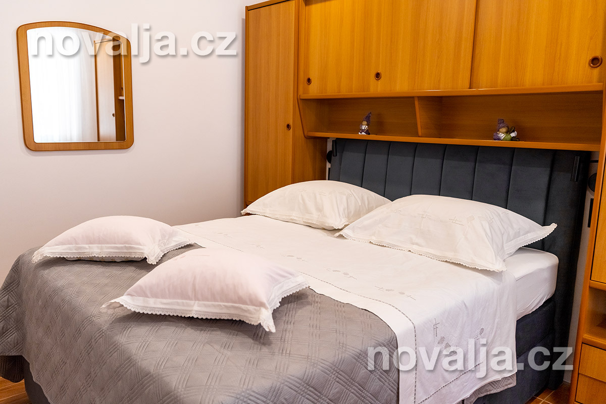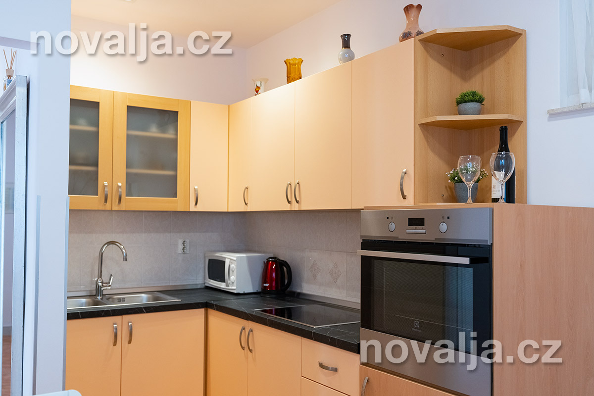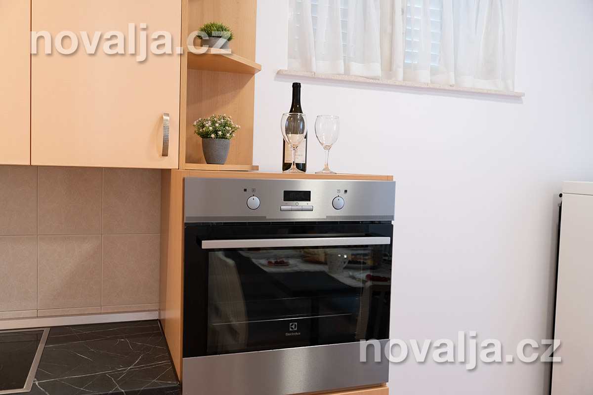 2 spálne - jedna s tromi lôžkami, druhá s dvoma lôžkami, 2x Google LCD TV, vybavená kuchyňa (elektrická varná doska, chladnička, mraznička, rúra, mikrovlnná rúra, varná kanvica), kúpeľňa s vaňou a WC, ďalšie samostatné WC, terasa. 3x klimatizácia - v oboch spálňach aj v kuchyni (v cene).
