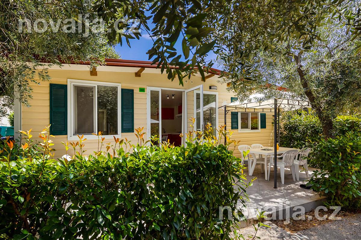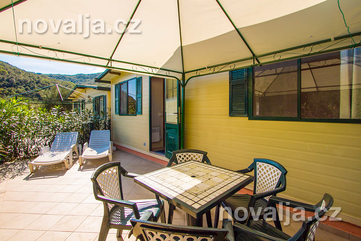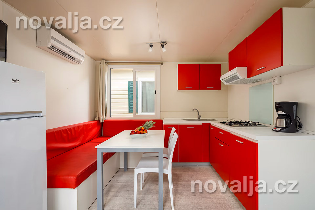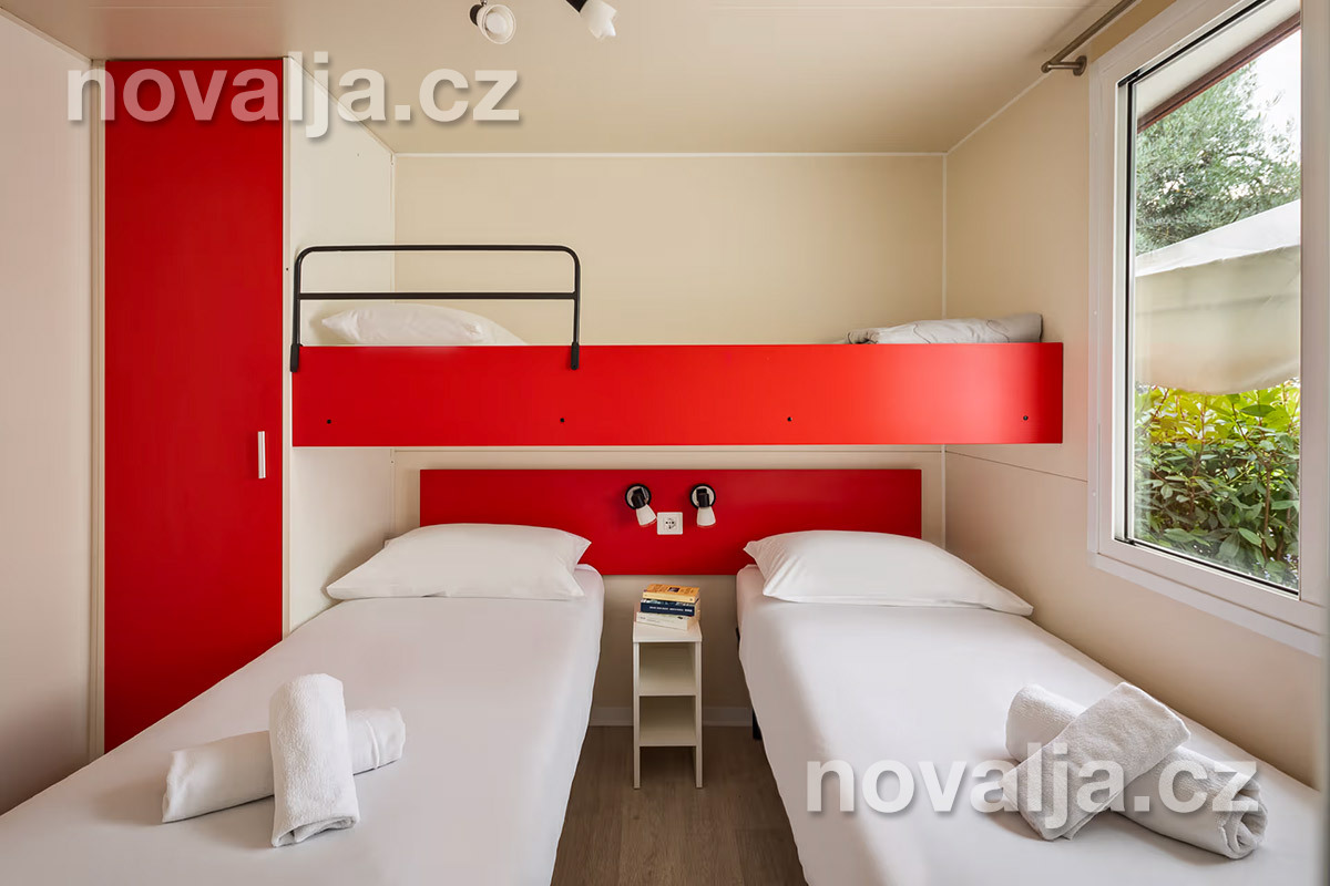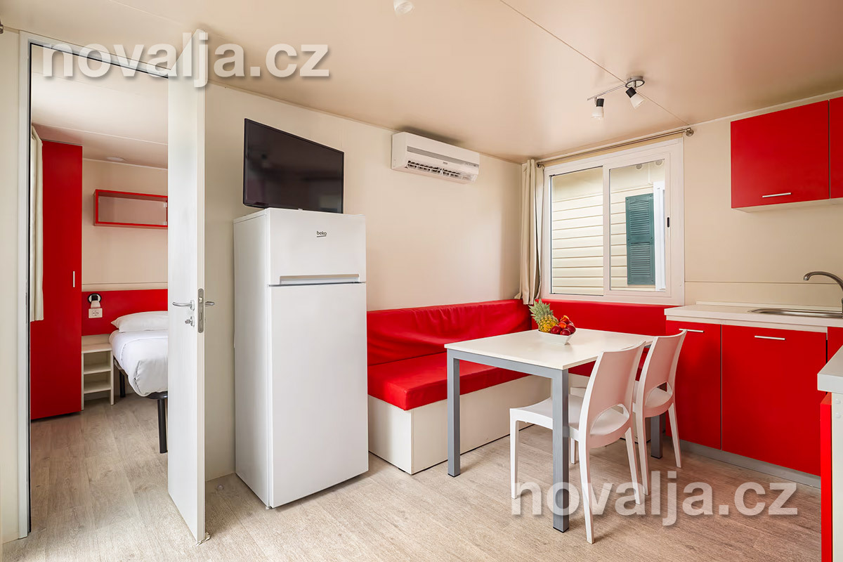 2 spálne - jedna s dvoma lôžkami (manželská posteľ 140 x 190 cm) a jedna s tromi samostatnými lôžkami 80 x 180 cm (tretie lôžko je poschodové s rozmerom 70 x 200 cm a je určené len pre 1 dieťa do 9,99 rokov), vybavená kuchyňa (chladnička s malým mrazničkou, kávovar), TV+SAT, 2x kúpeľňa so sprchovacím kútom a WC, tienená terasa so záhradným nábytkom a dvoma lehátkami. Klimatizácia v kuchyni (v cene).