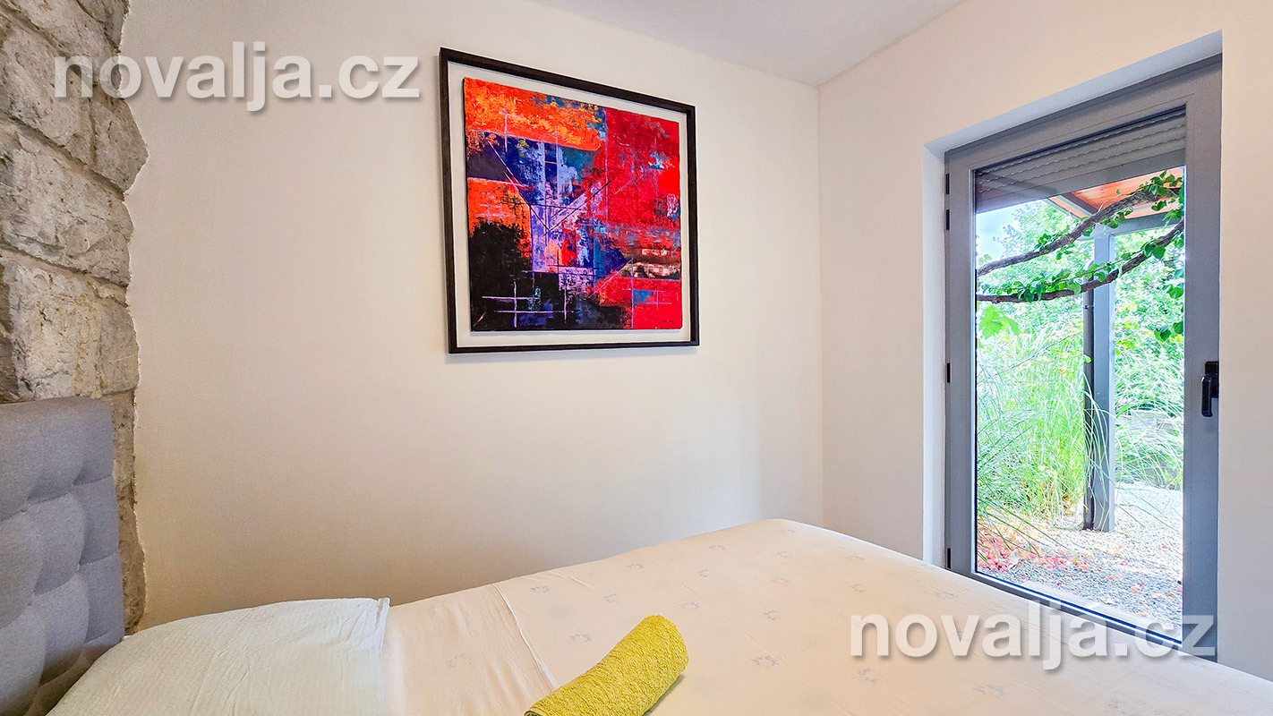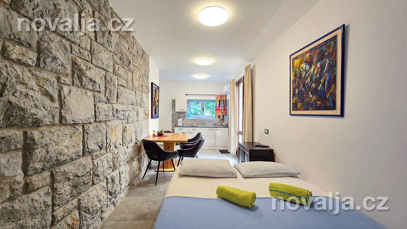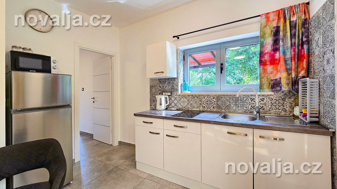 1 spálňa s dvoma lôžkami, vybavená kuchyňa (chladnička, mraznička, mikrovlnná rúra, varná kanvica) s rozkladacím gaučom pre 1–2 osoby, LCD TV+Netflix, sociálne zariadenie so sprchovacím kútom a WC, práčka, terasa so záhradným nábytkom, letná kuchyňa s plynovým grilom. Klimatizácia v kuchyni (v cene).